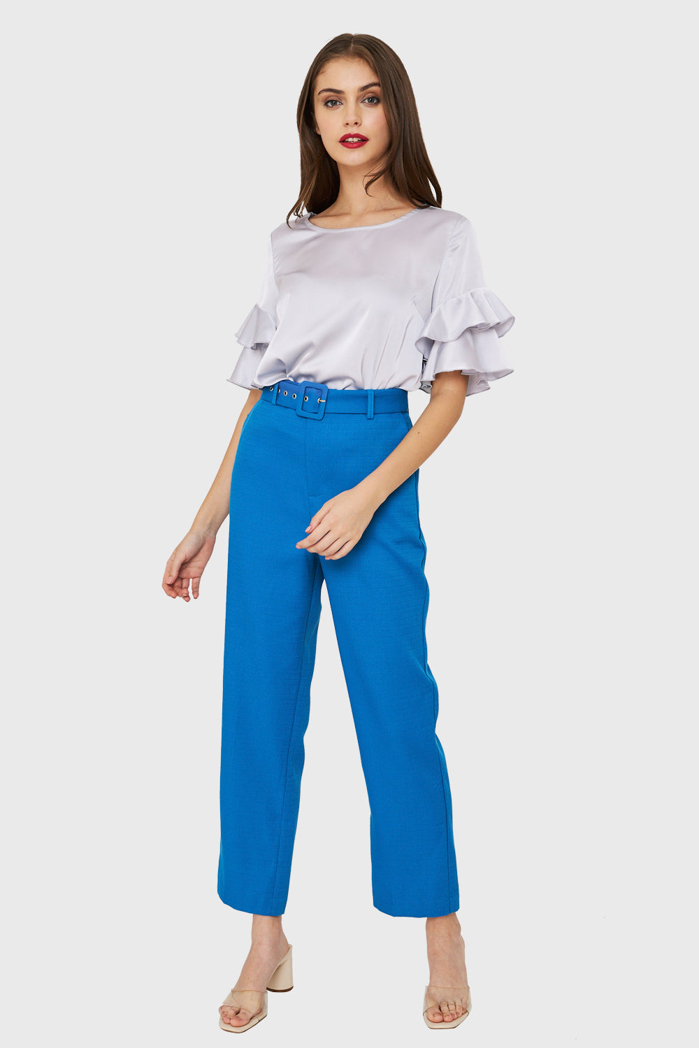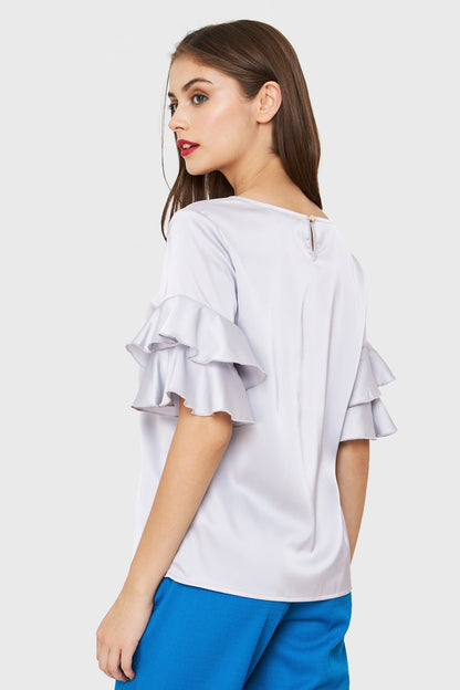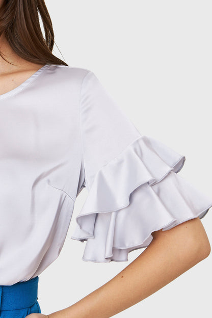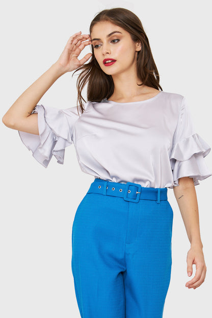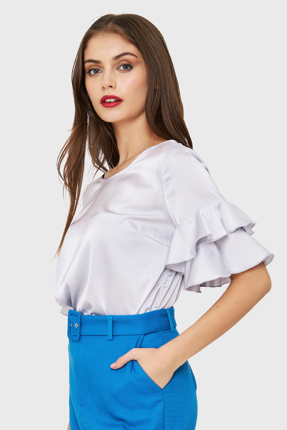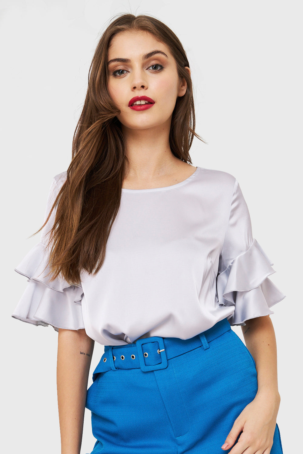Características: Blusa tipo satín cuello redondo y manga corta con vuelitos. Botón de ajuste en espalda.