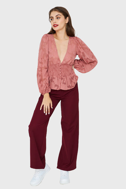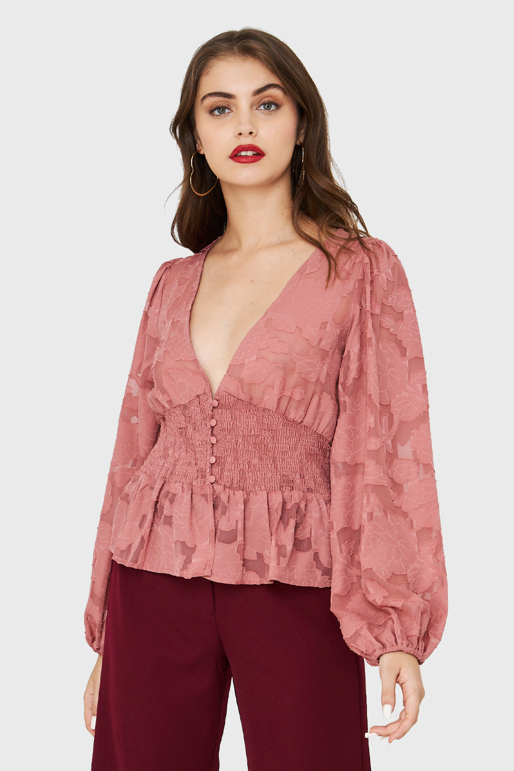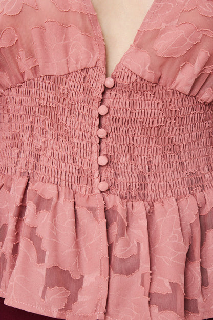 Características: Blusa trasparente floral con mangas estilo globo. Posee elásticos en los puños. Escote profundo en V. Botones de ajuste. Posee elástico por espalda y frente en la parte de la cintura. Vuelos en parte inferior.