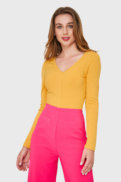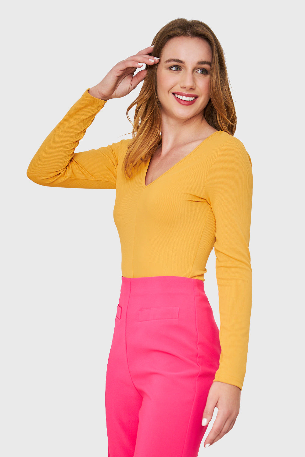 Características: Body manga larga con escote en V. Calzón estilo colaless con broche en la entrepierna. Tela acanalada.