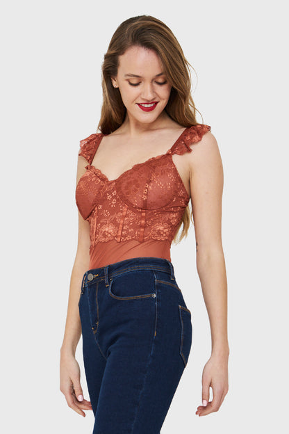 Características: Body con cuerpo de malla trasparente. Detalle de encaje en canesú. Tirantes pabilo ajustables con detalle de encaje. Relleno de almohadilla en busto. Broche en la entrepierna y calzón tipo bikini.