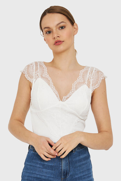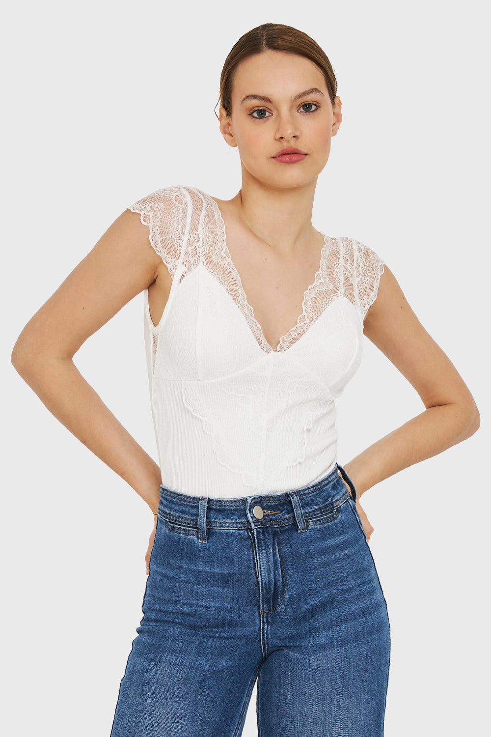 Características: Body escote V con canesú encaje. Posee broche en entrepierna y calzón tipo colaless.