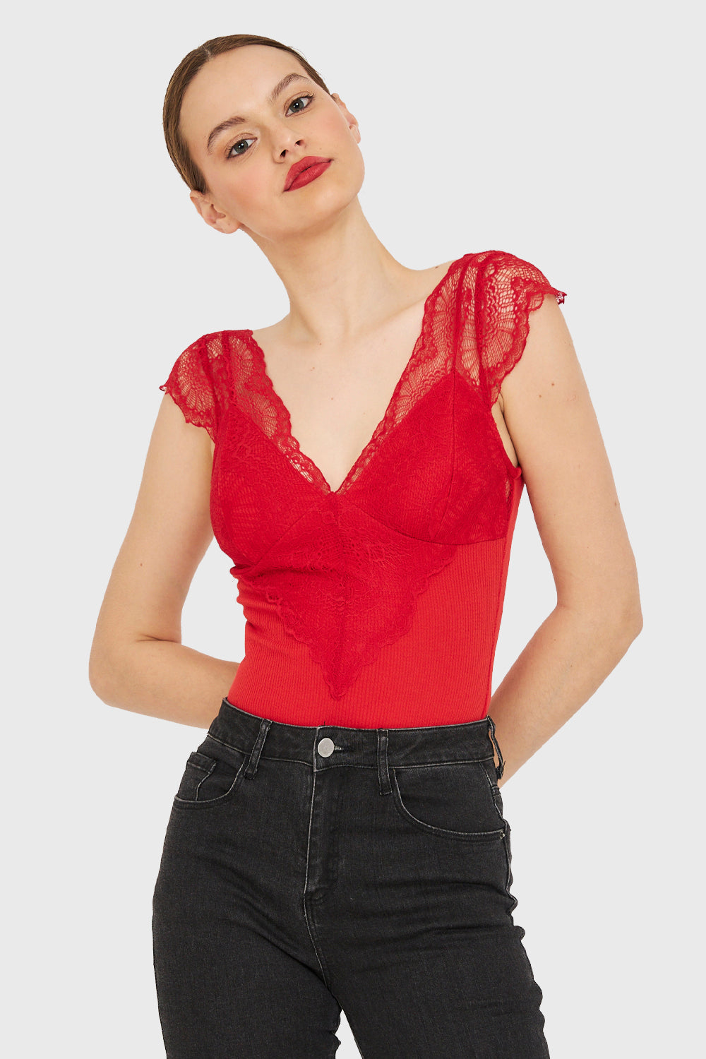 Características: Body escote V con canesú encaje. Posee broche en entrepierna y calzón tipo colaless.