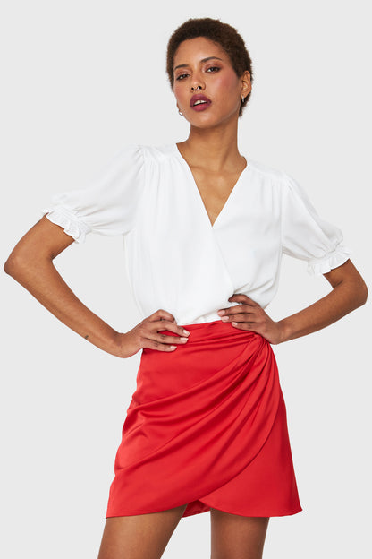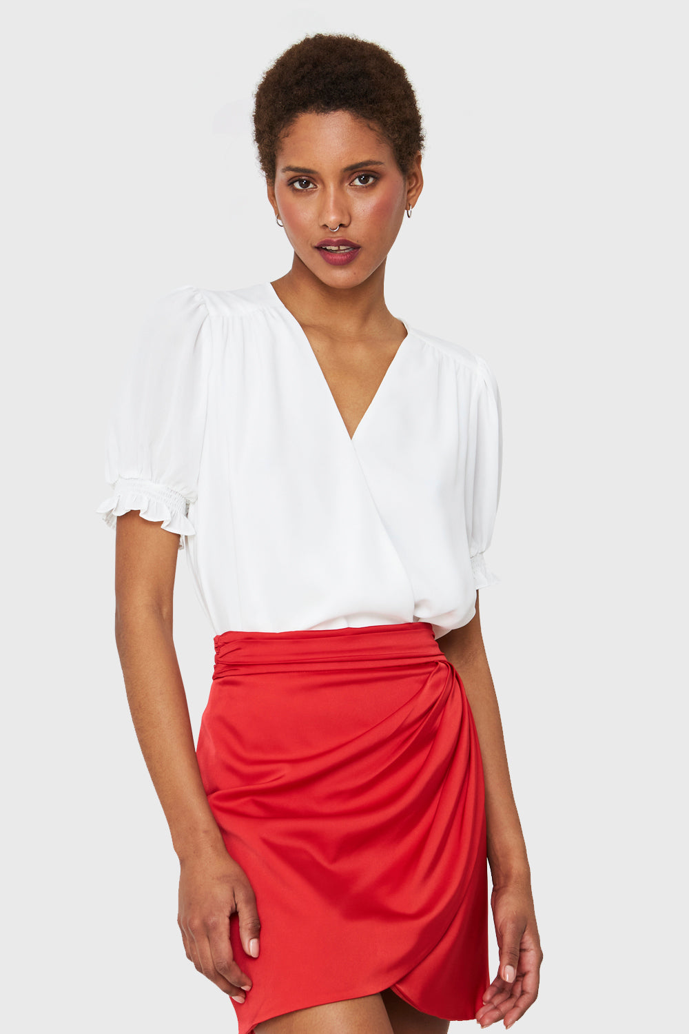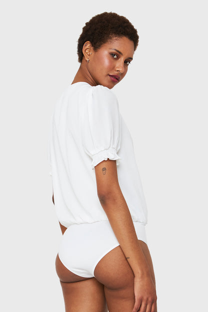 Características: Body manga corta tipo Julieta. Elástico en el puño de las mangas. Escote cruzado con broche de ajuste. Elástico en la parte superior del calzón. Calzón tipo bikini con broche en entrepierna.