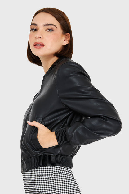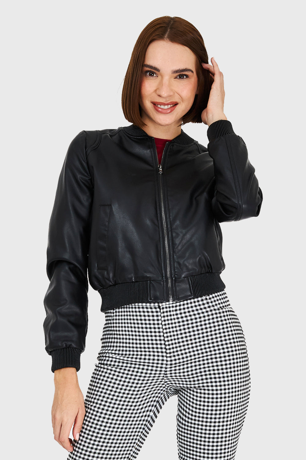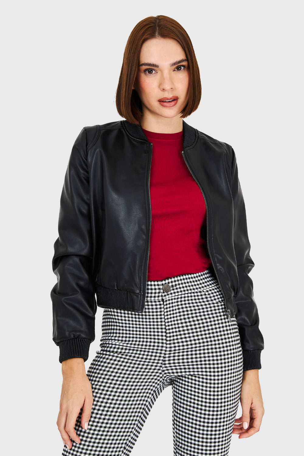 Características: Chaqueta bomber de ecocuero. Cierre frontal. Pretina elasticada en cuello, puños y basta. Posee forro.