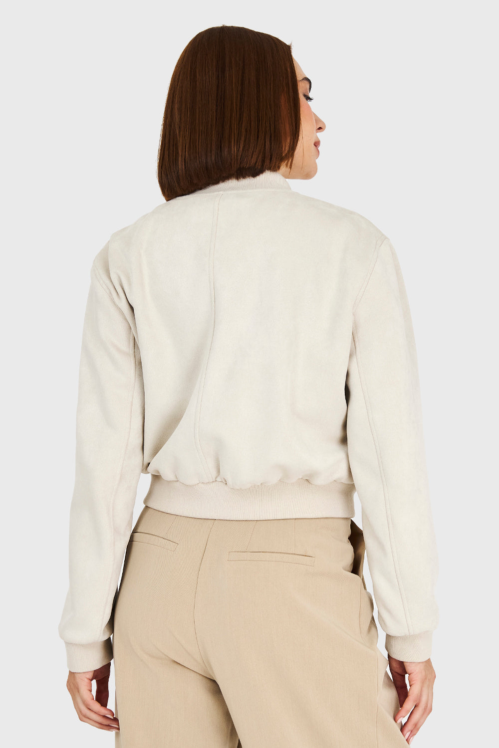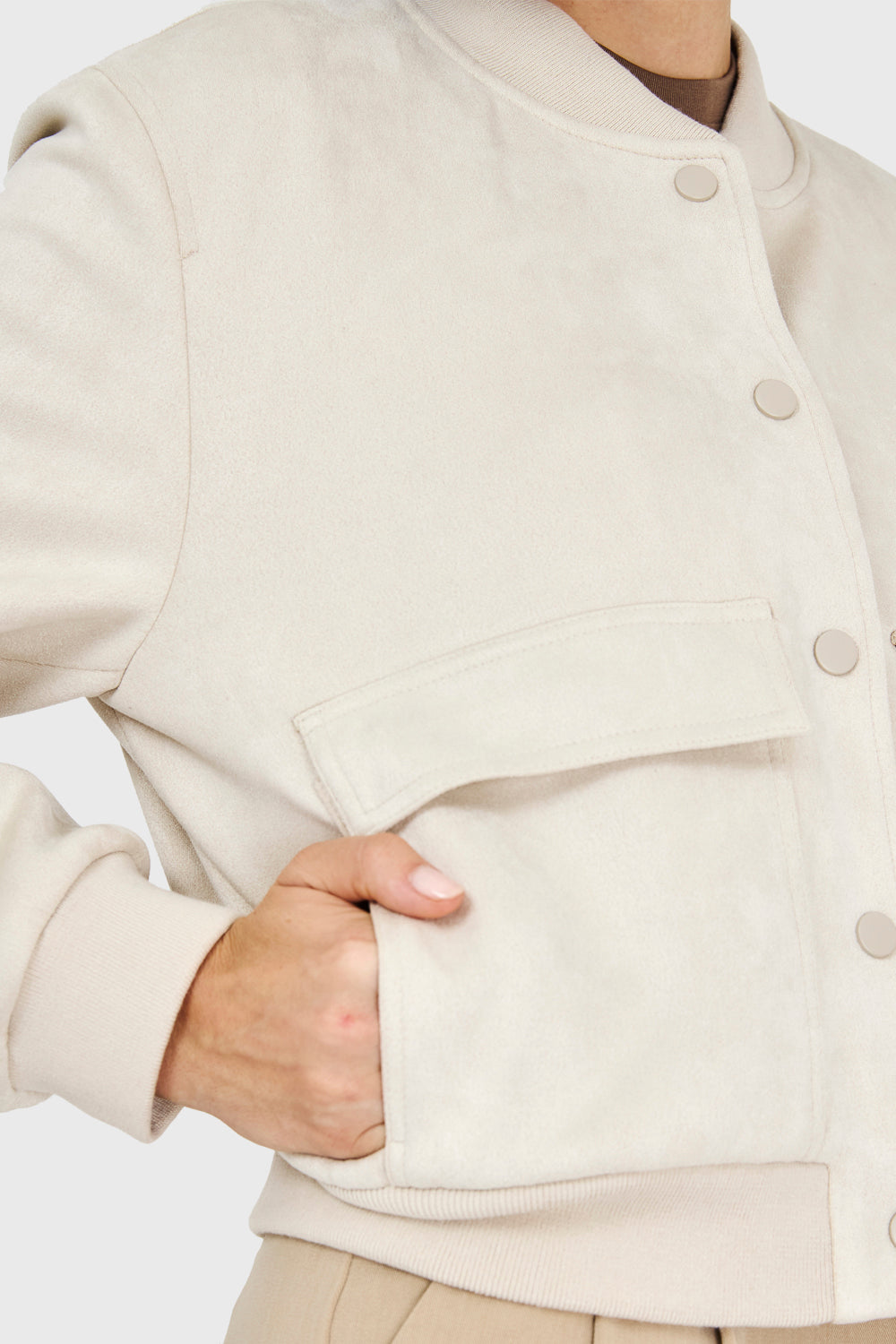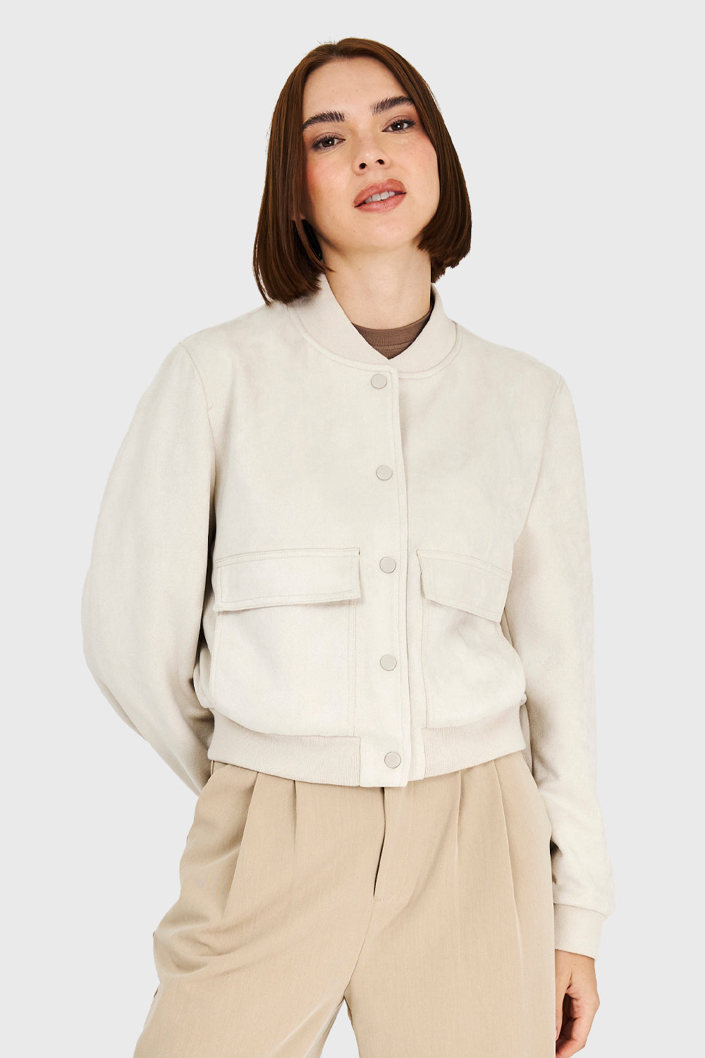 Características: Chaqueta bomber tipo gamuza. Pretina en cuello, puños y basta. Broches de cierre. Bolsillos decorativos. Posee forro.
