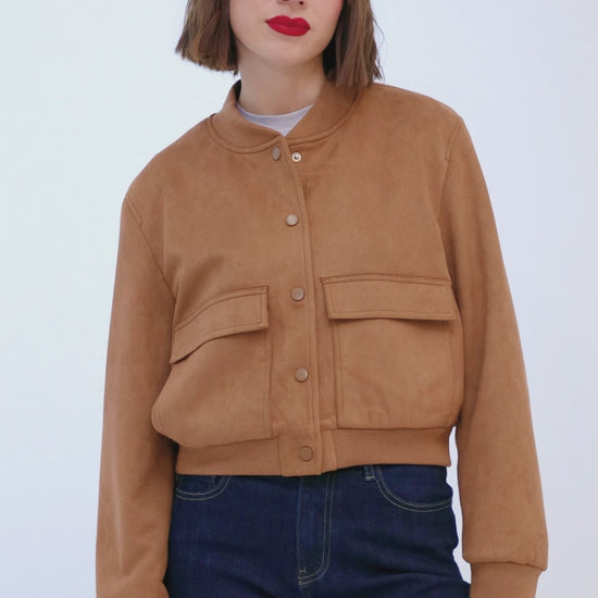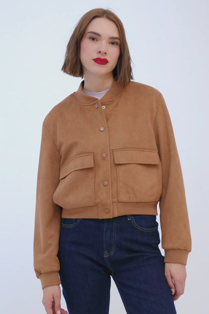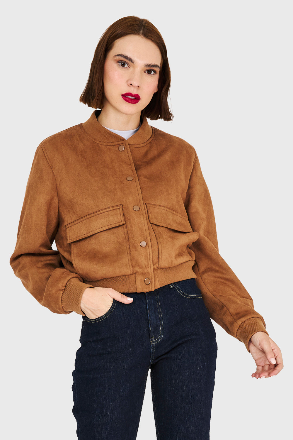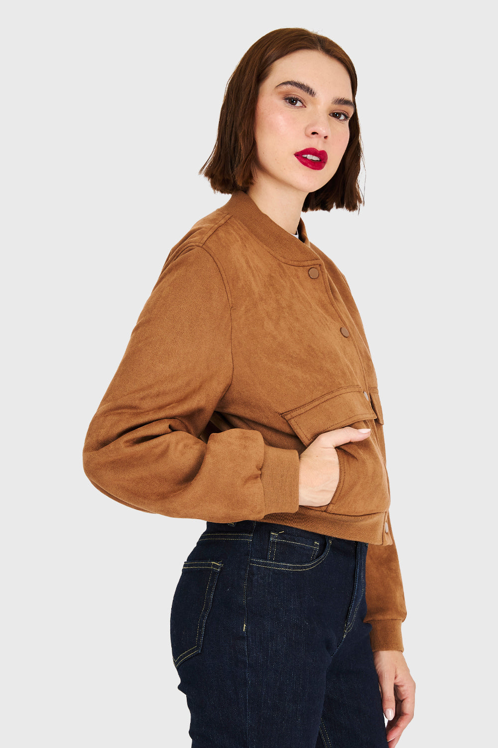 Características: Chaqueta bomber tipo gamuza. Pretina en cuello, puños y basta. Broches de cierre. Bolsillos decorativos. Posee forro.