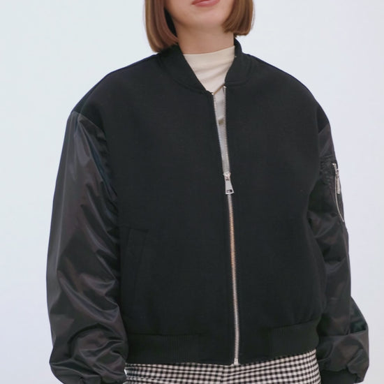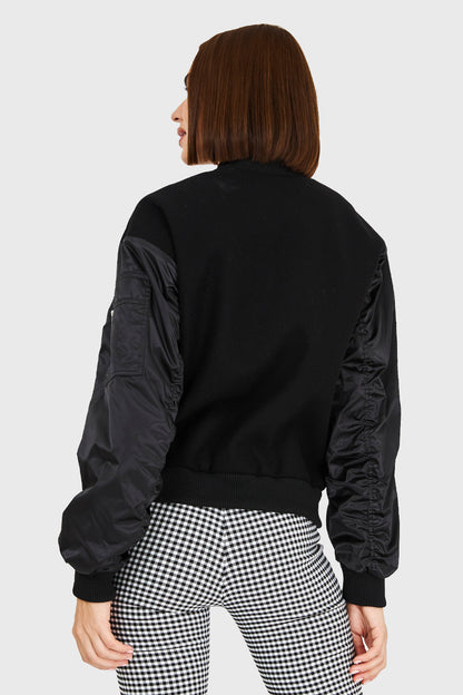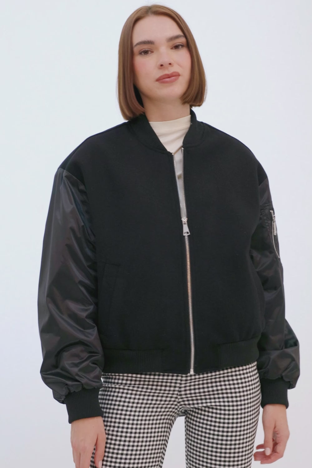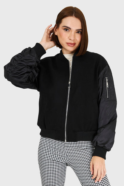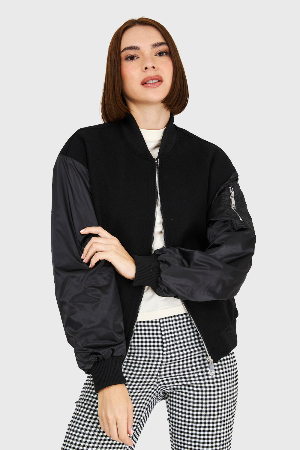 Características: Chaqueta bomber tejido tipo lanilla. Pretina en cuello, puños y basta. Cierre frontal. Bolsillos invisibles a los costados. Bolsillo funcional en brazo izquierdo. Posee forro.