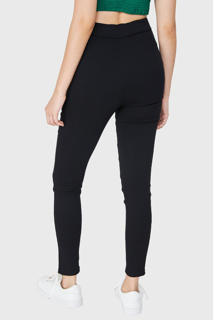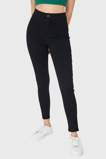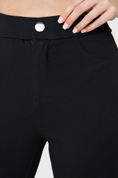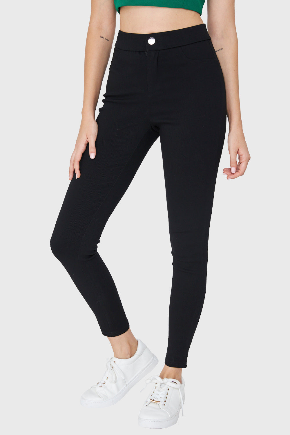 Características: Calza lisa con cierre y botón frontal para ajuste. Cintura elasticada con bolsillos decorativos frontales.