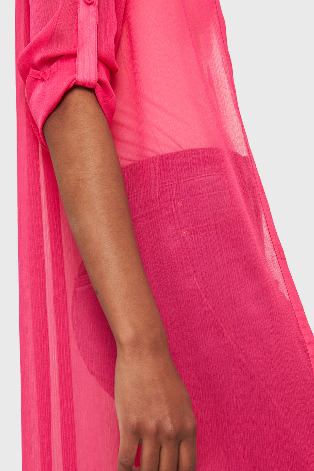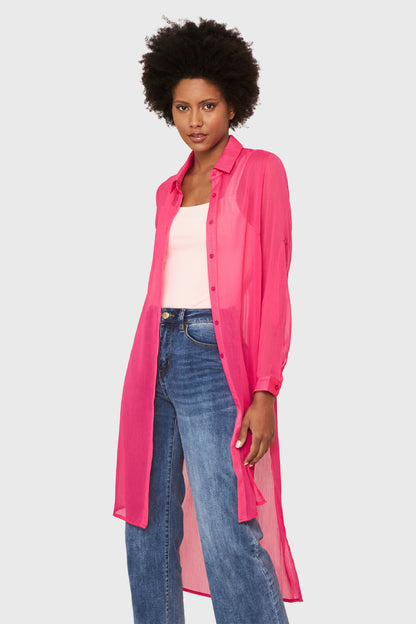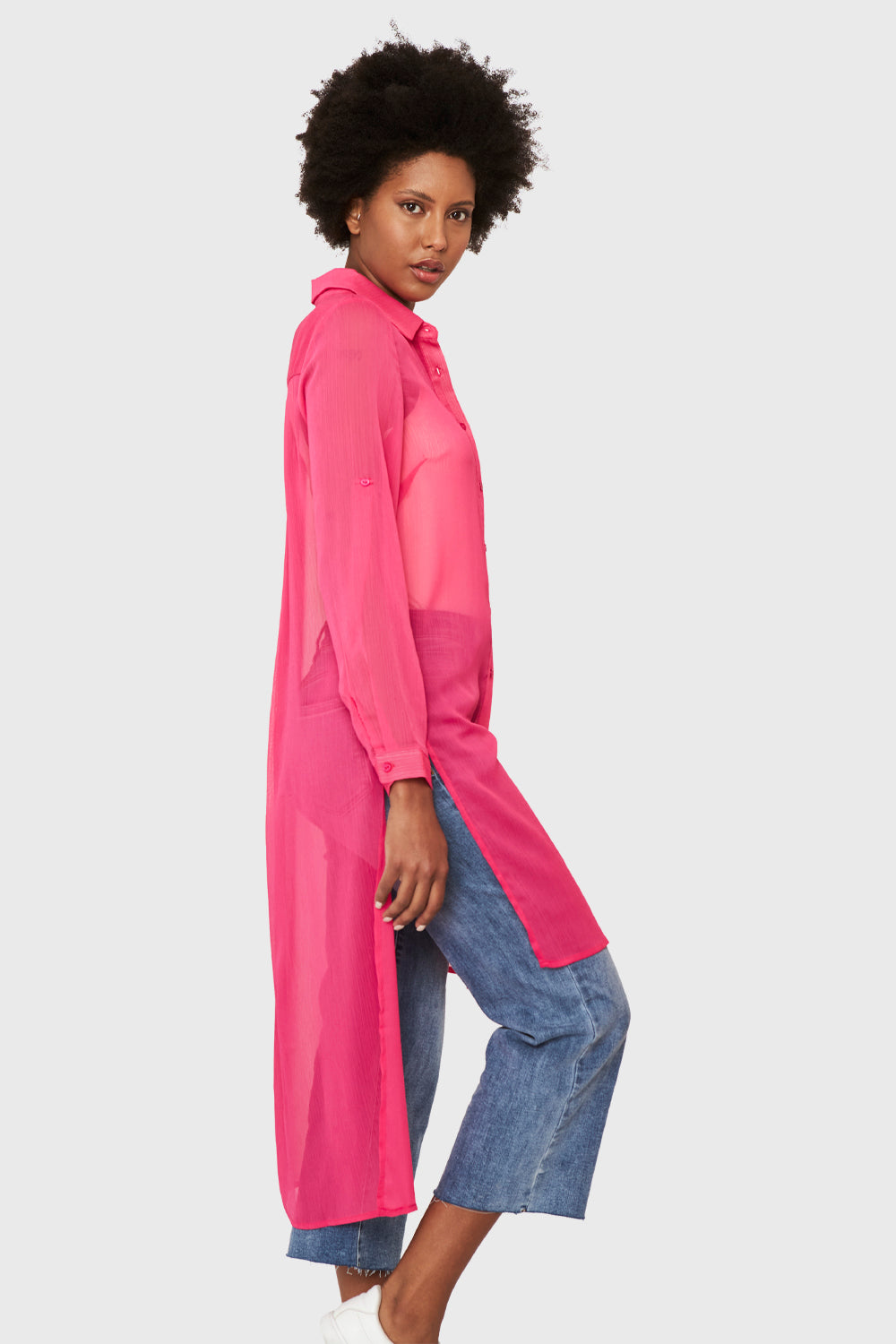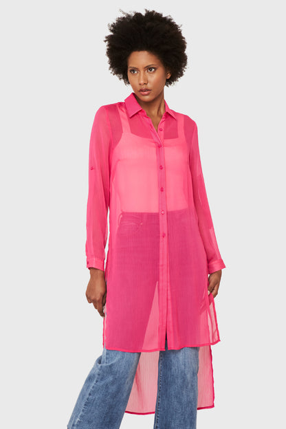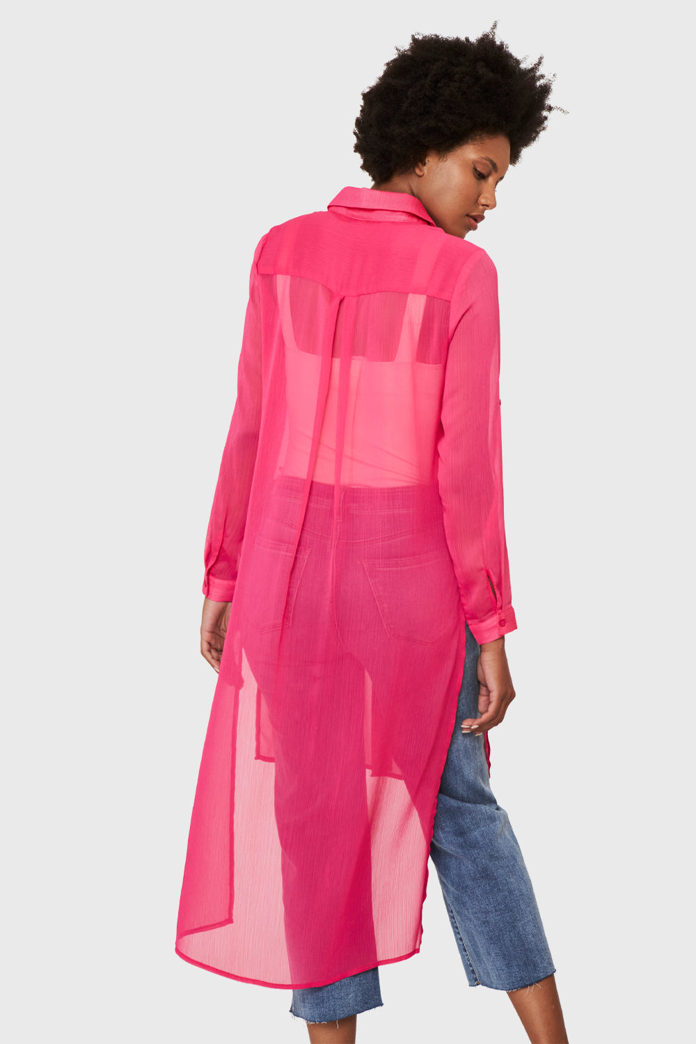 Características: Camisa larga. Tela tipo gasa trasparente. Manga larga con botón de ajuste en puño y botón de ajuste para el largo de manga. Largo trasero es mayor al delantero. Posee aberturas profundas por ambos lados.
