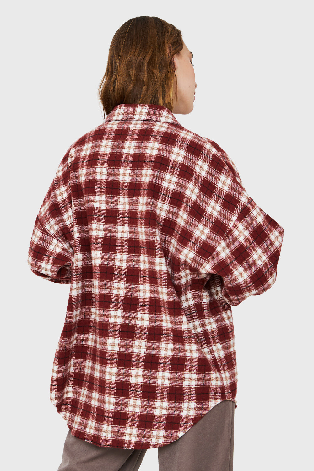 Características: Camisa tipo franela cuadrillé holgada con botones frontales de ajuste. Detalle de bolsillo no funcional en el busto.