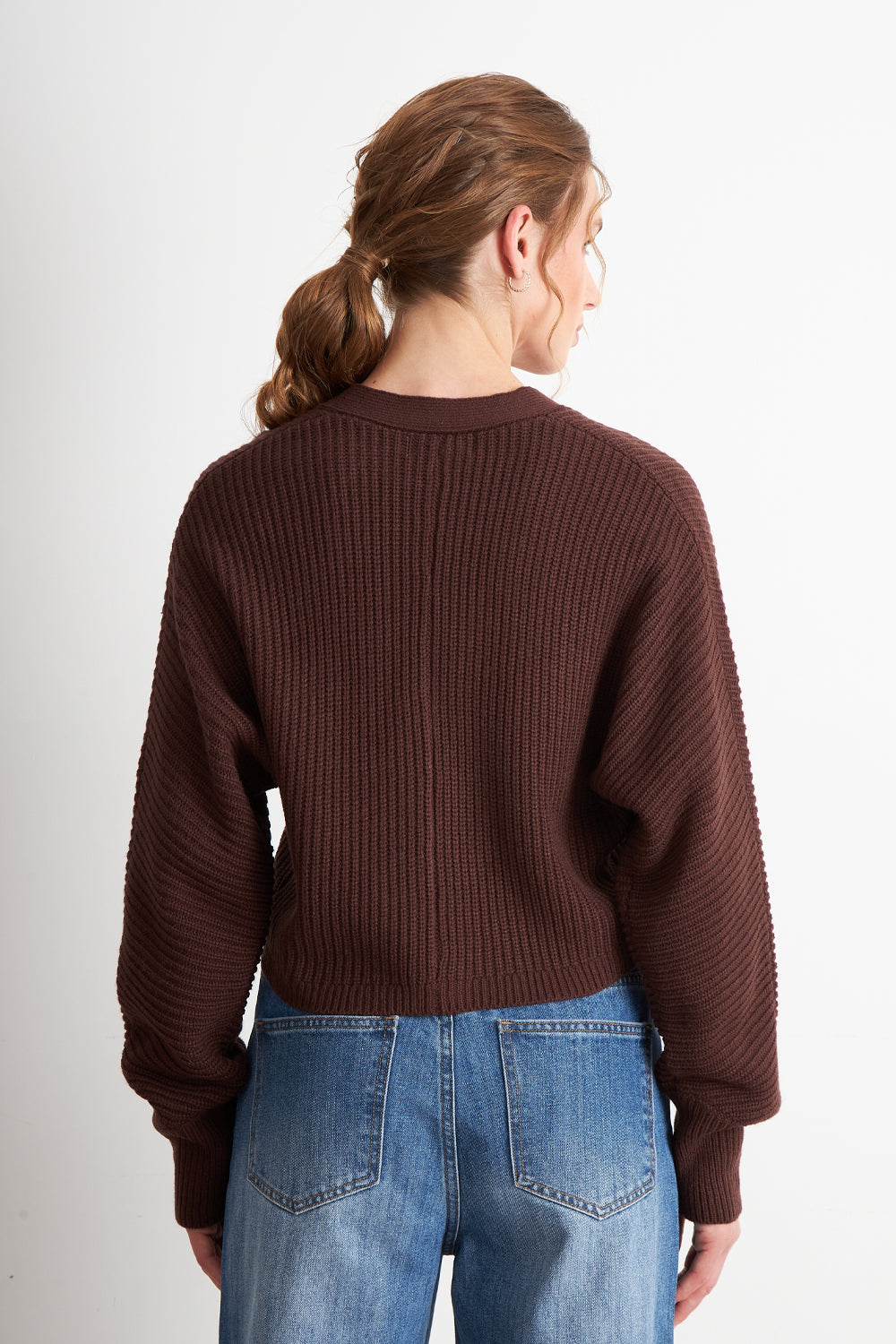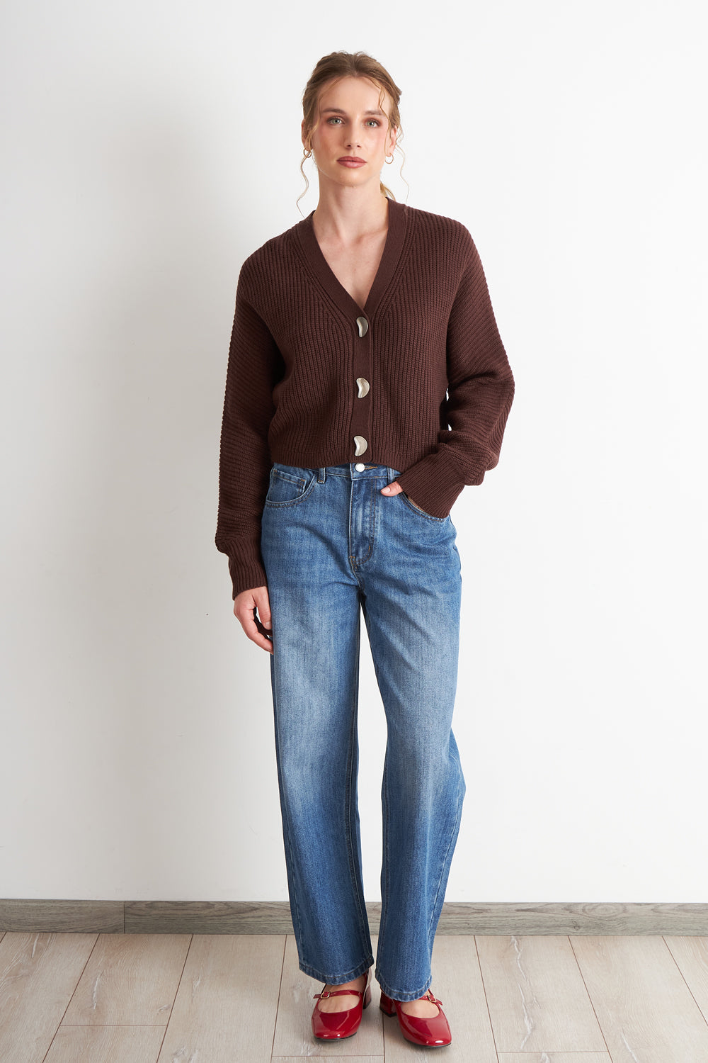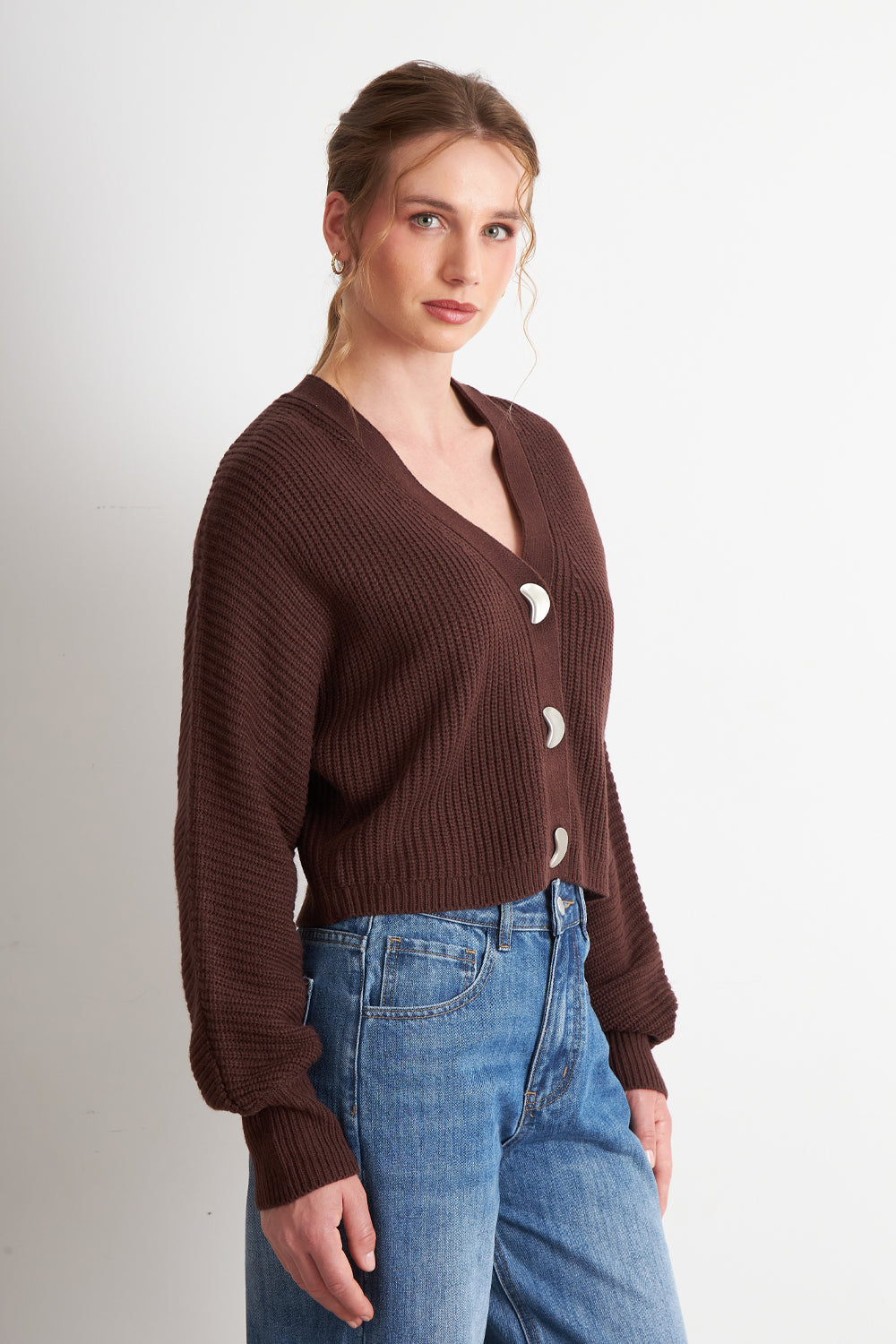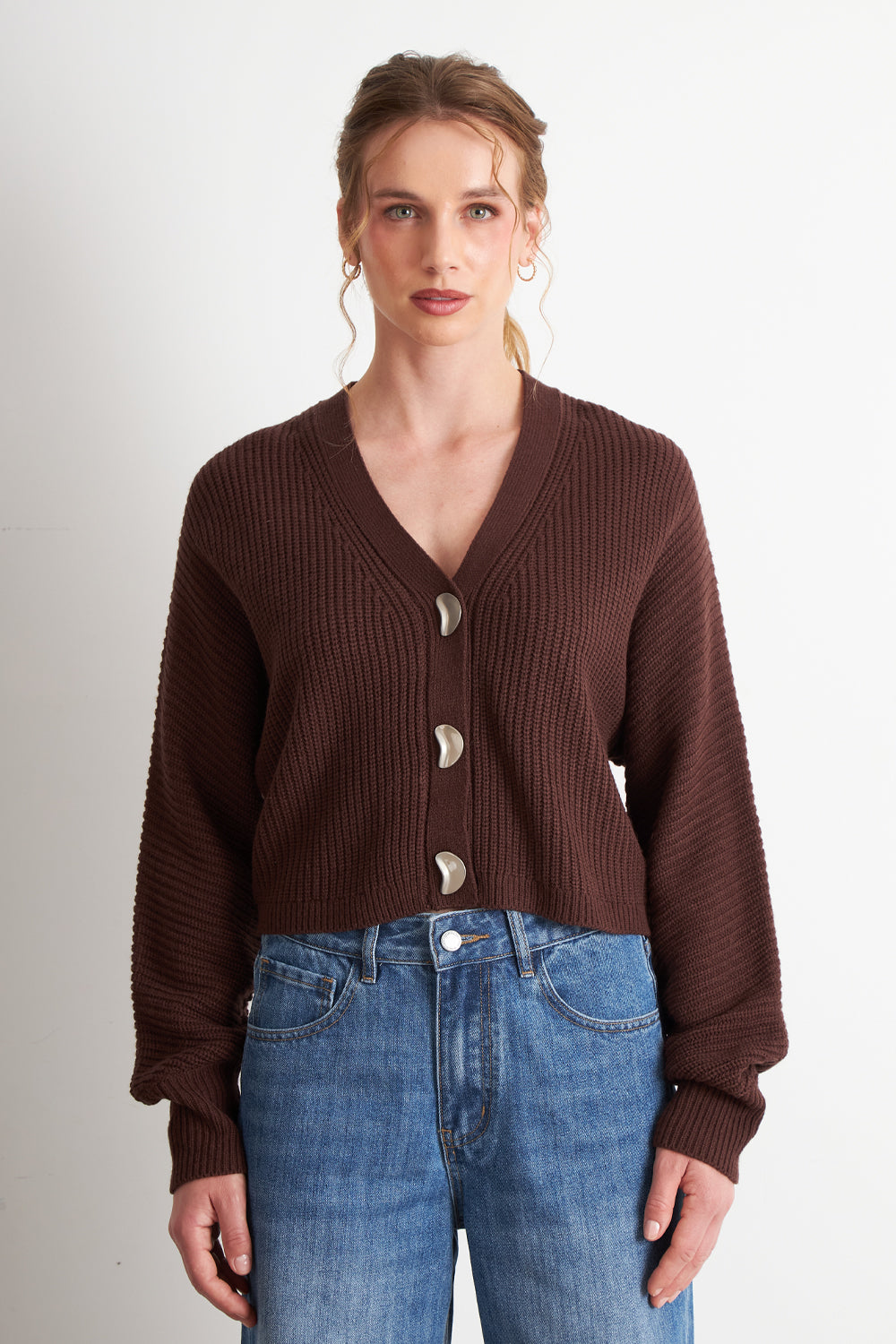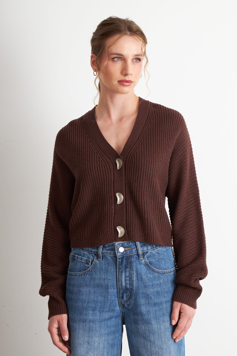 Características: Cárdigan tipo tejido, 3 Botones efecto perlados plateados.