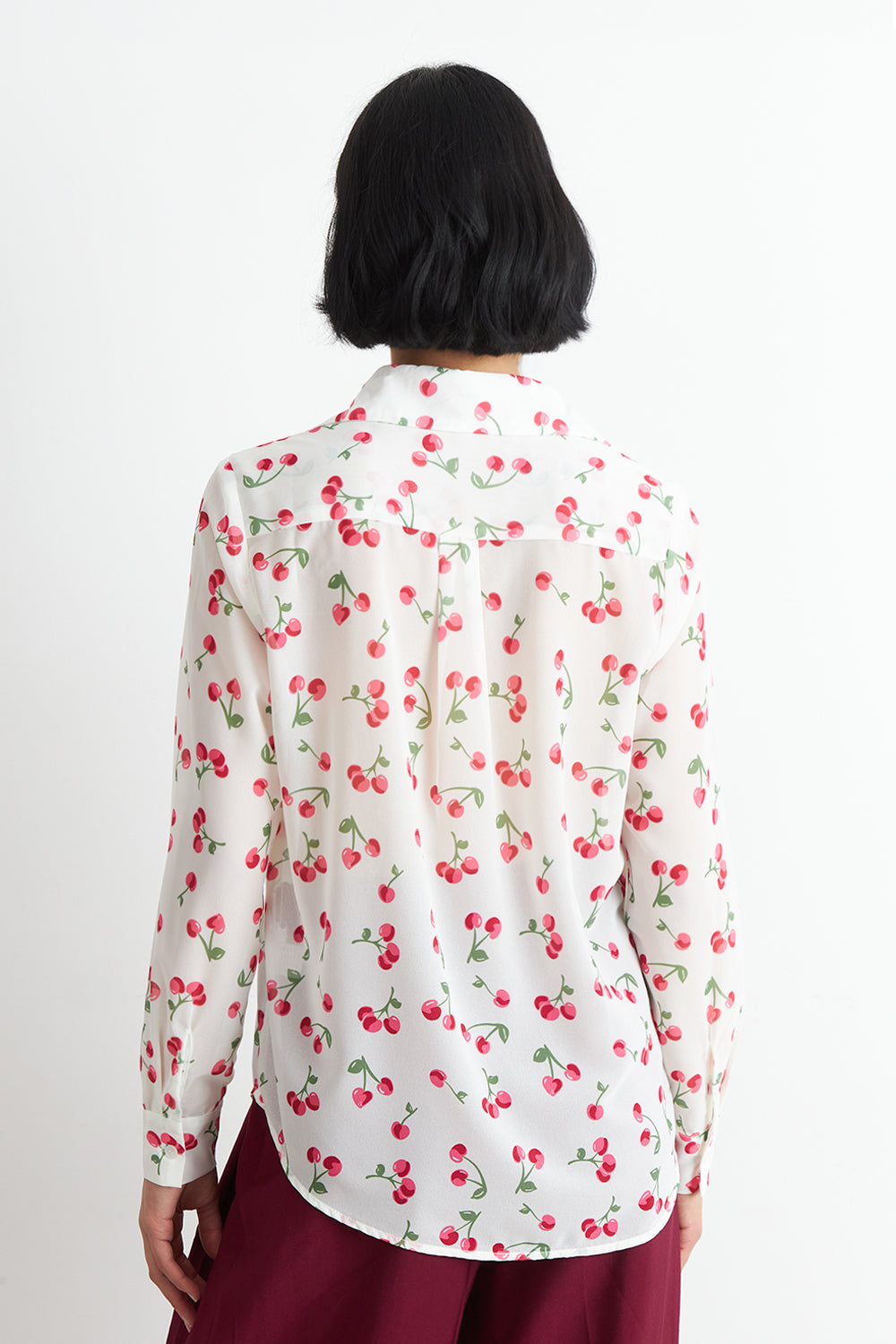 Características: Blusa manga larga. Con 1 bolsillo en el pecho. Botones en el frente y en los puños. Estampado cereza.