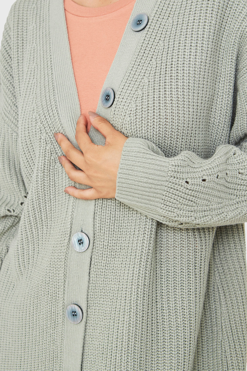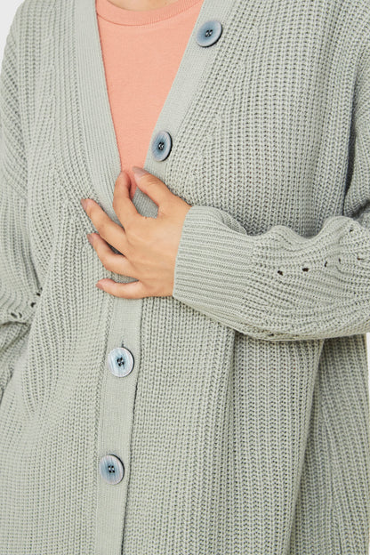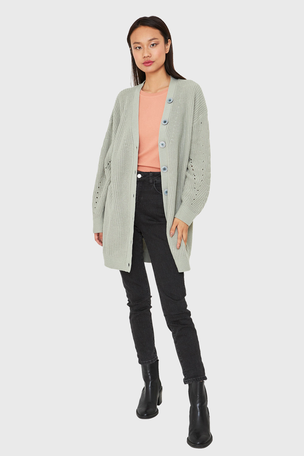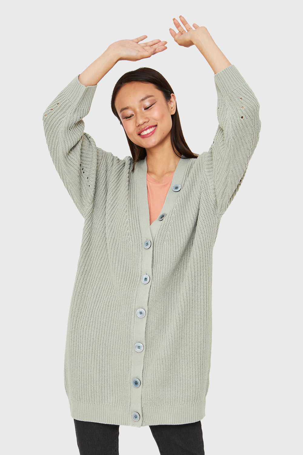 Características:Cárdigan básico abotonado de hombros caídos. Posee dos botones extras en el escote como decoración. Se encuentra en dos tallas S/M y M/L.