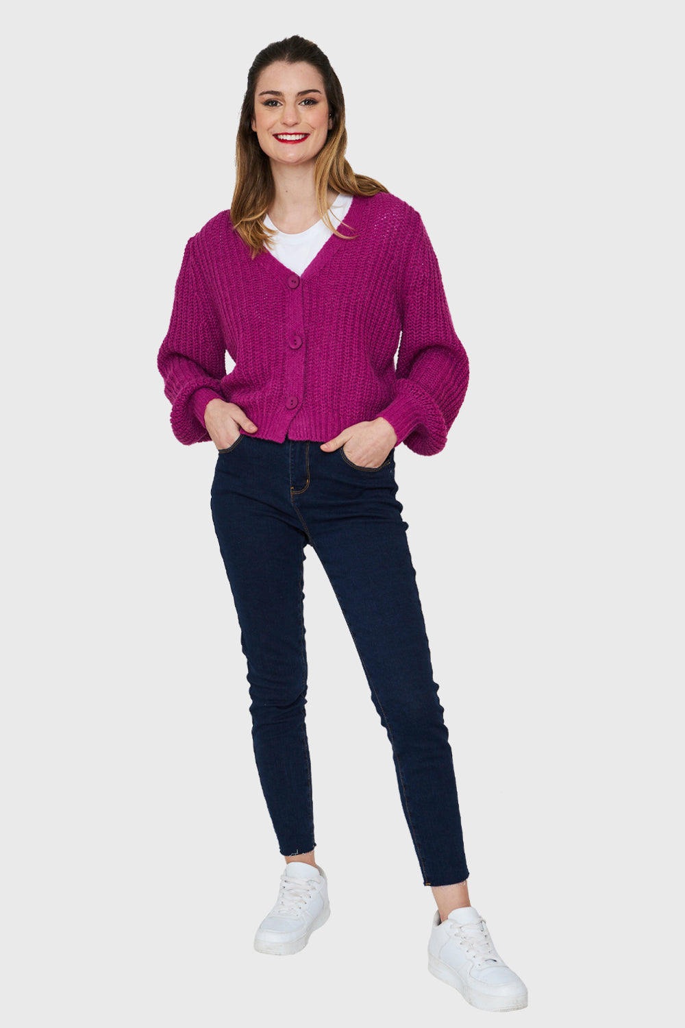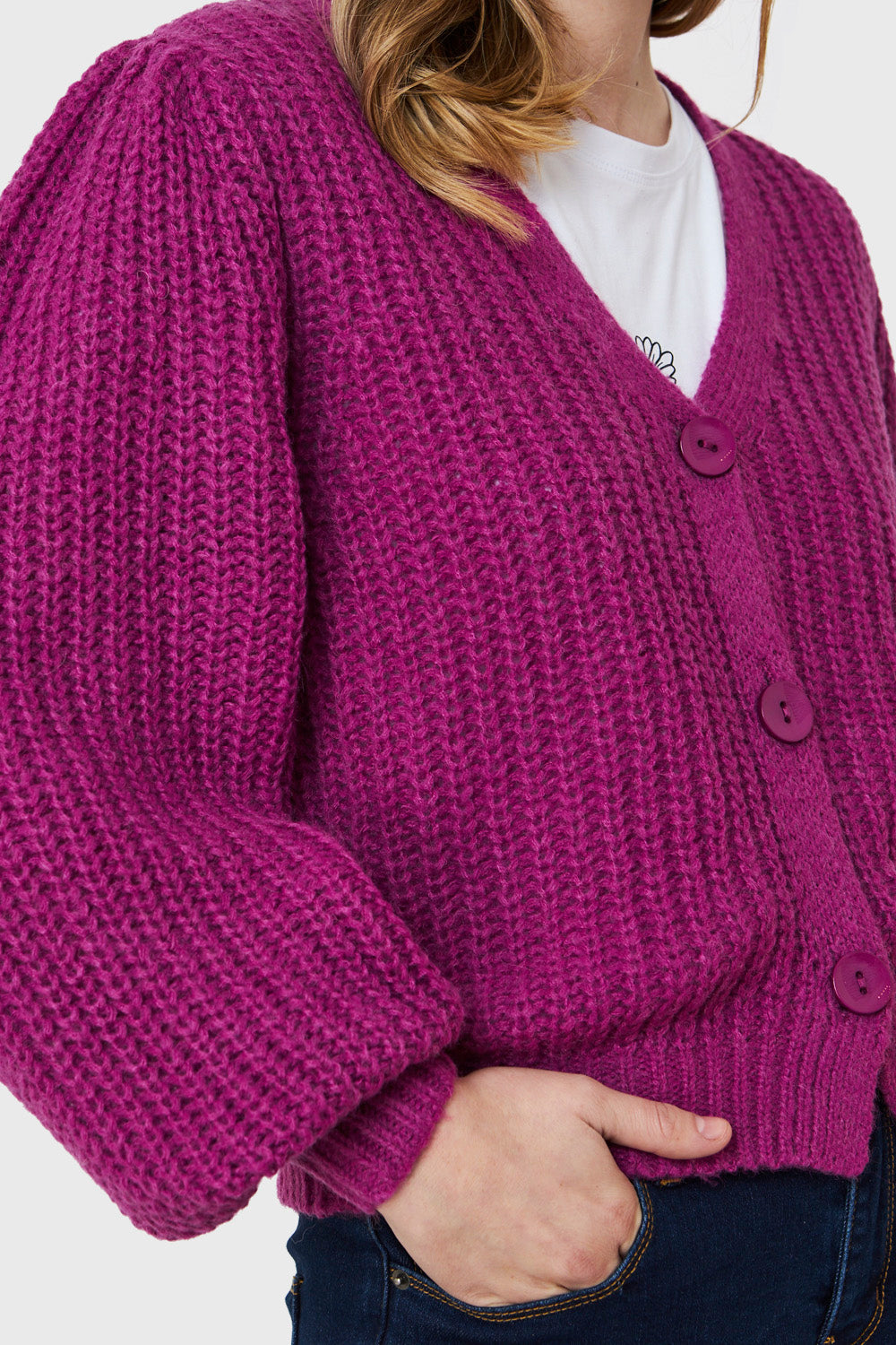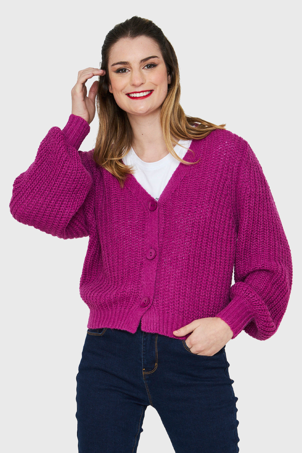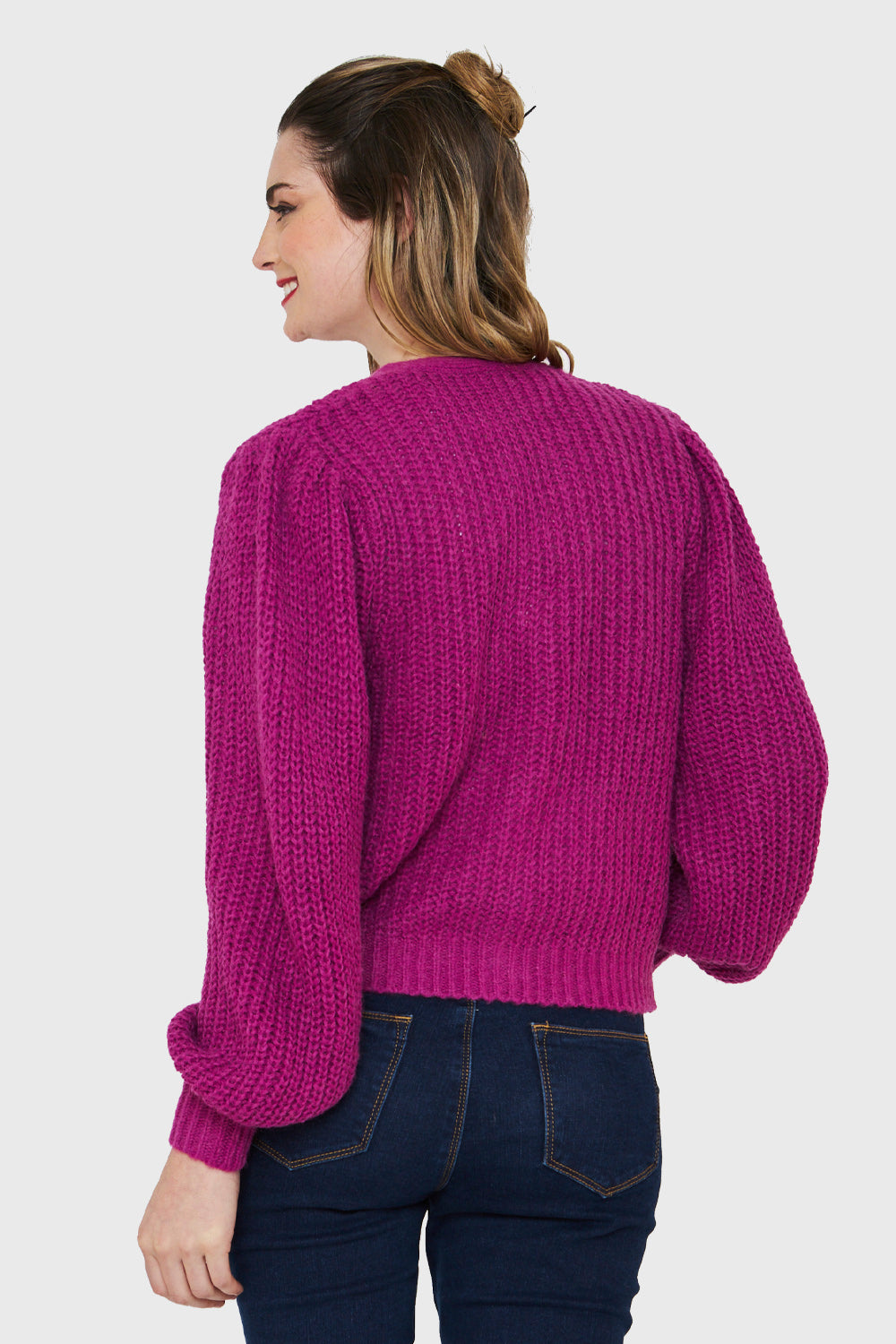 Características: Cárdigan corto tejido. Posee 3 botones funcionales. Manga globo.