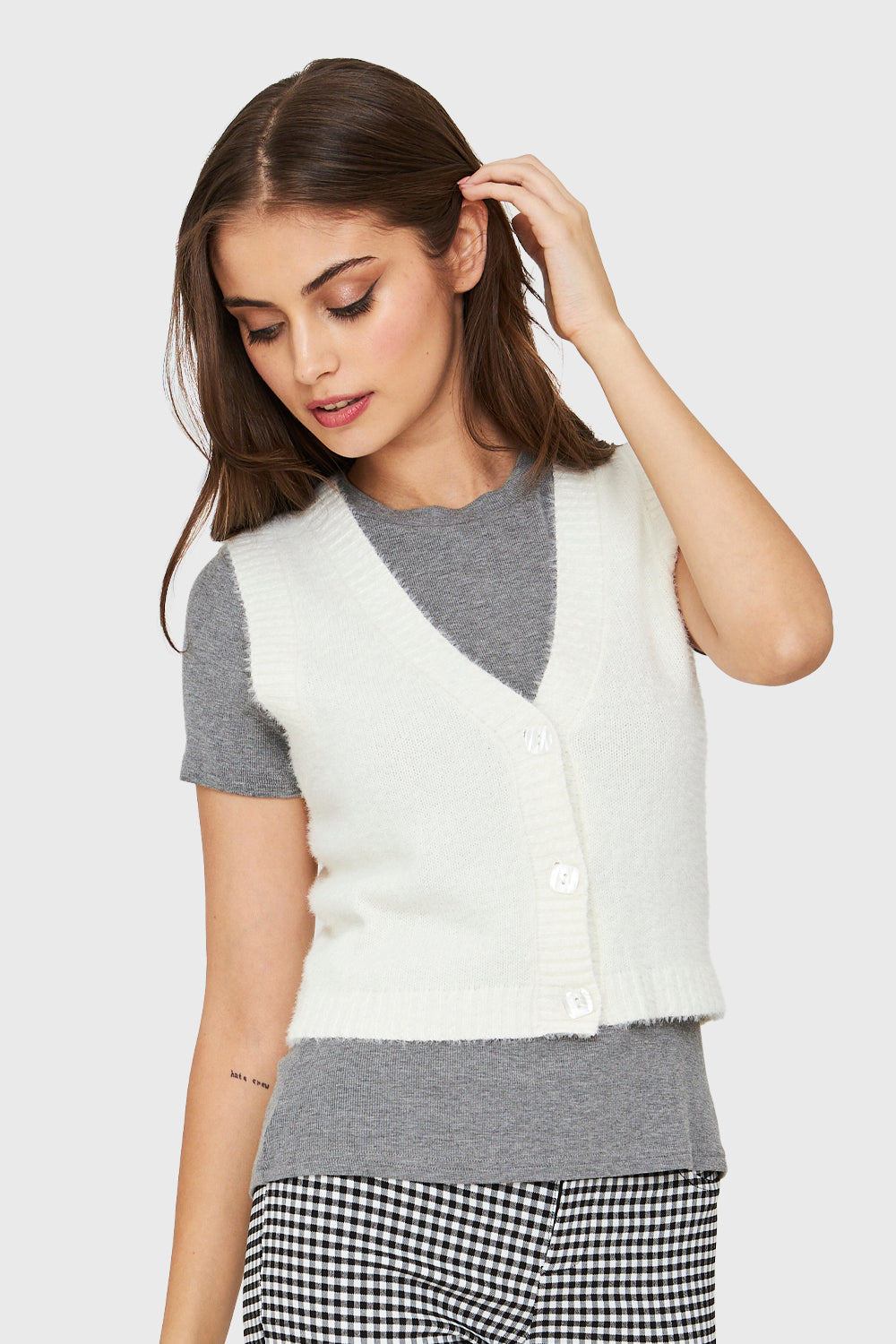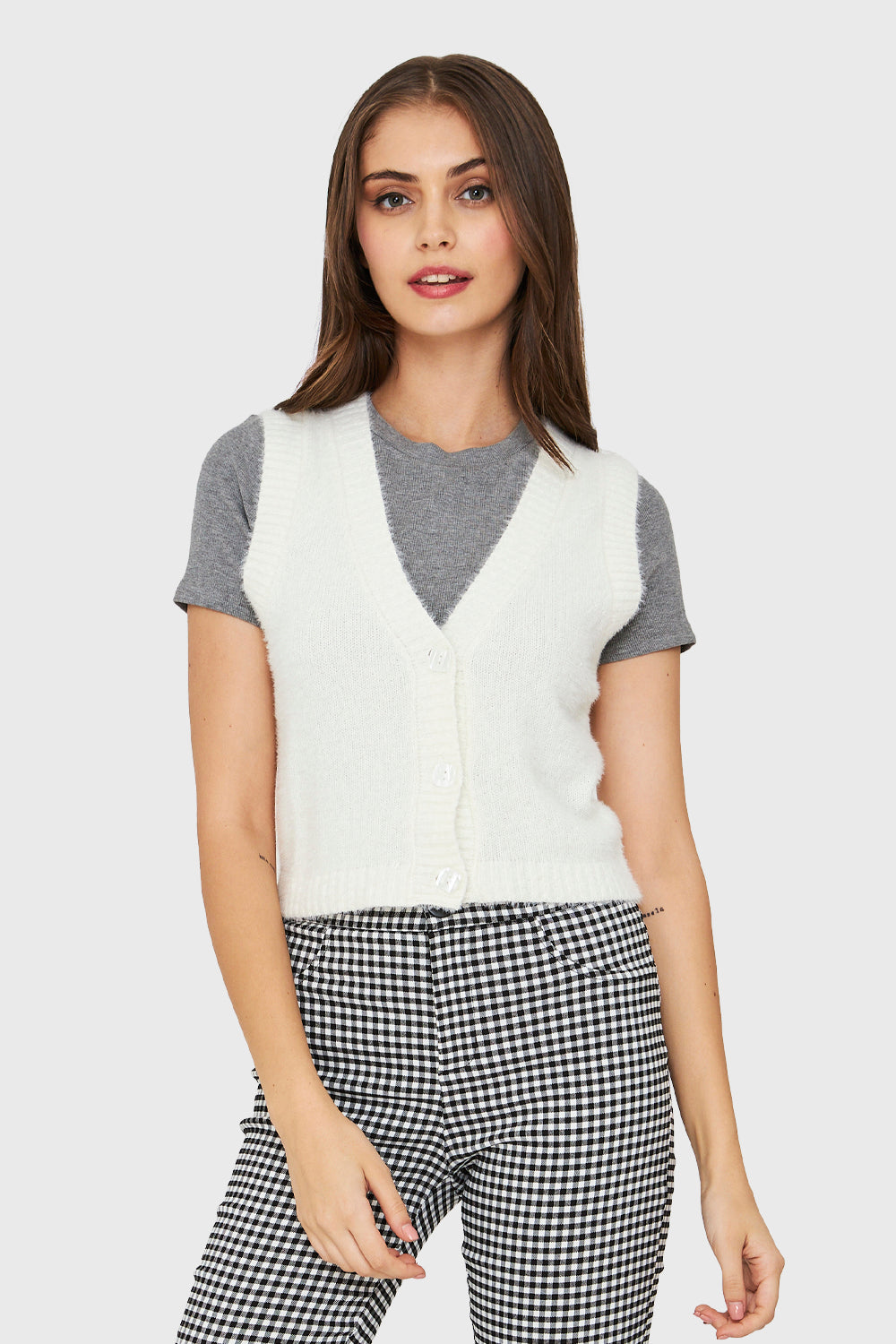 Características: Cárdigan corto sin mangas con botones frontales de ajuste. Textura suave y peludito.