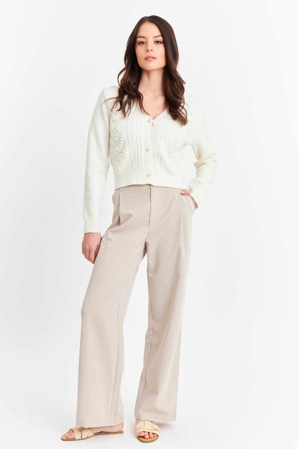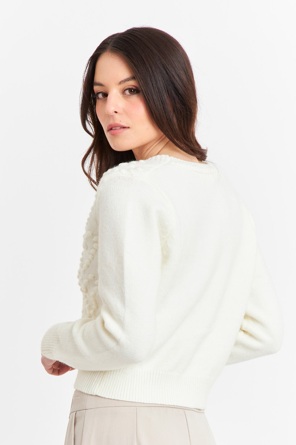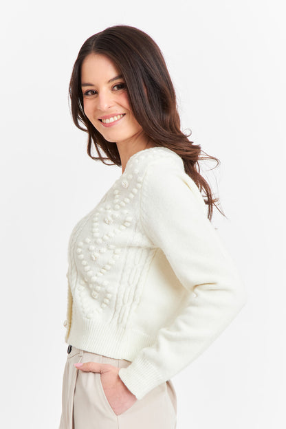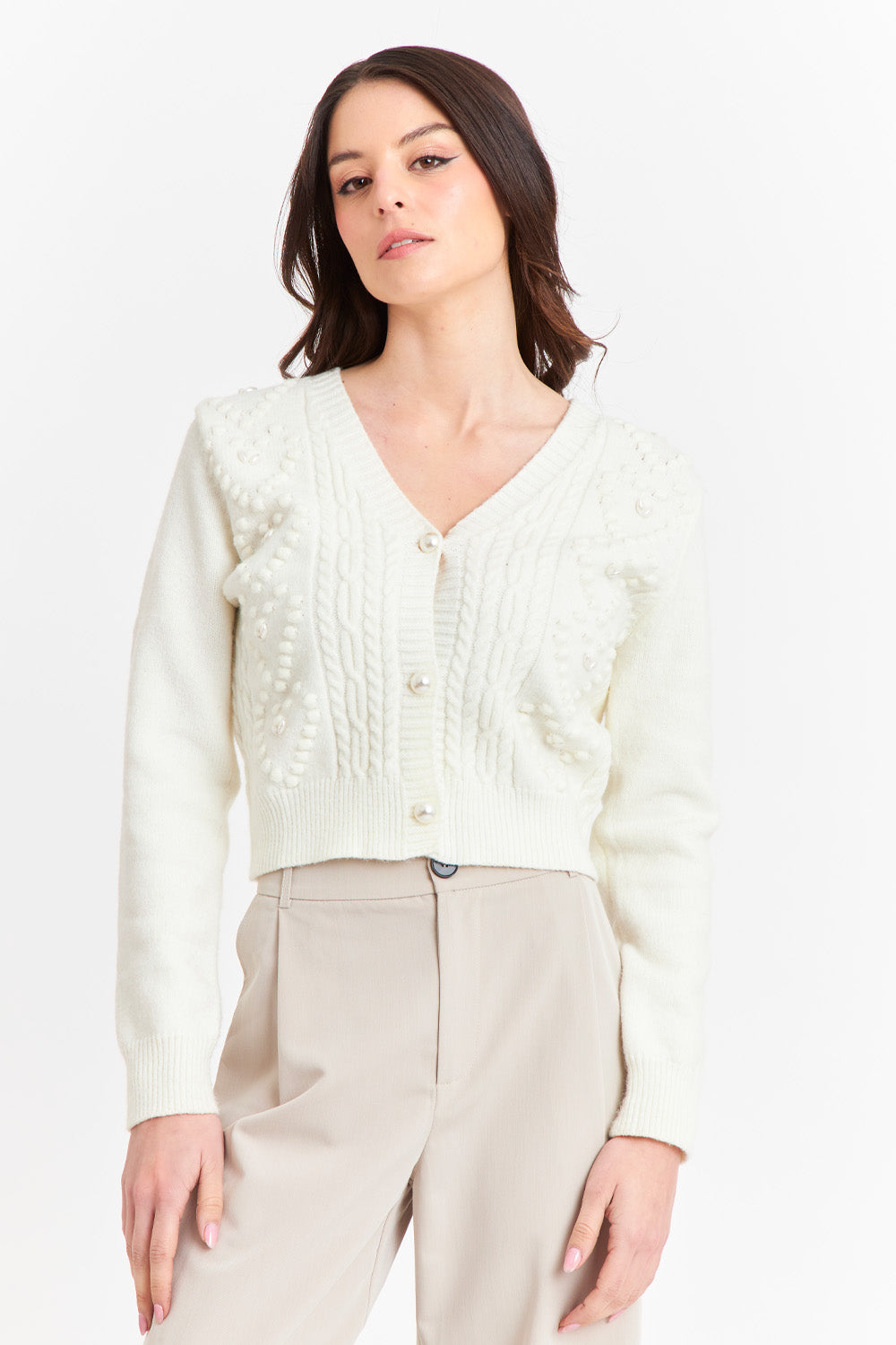 Características: Cárdigan tejido de punto. Pretina en cuello, puños y basta. Botones tipo perla. Tejido con diseños tipo cadeneta y decoraciones perla.
