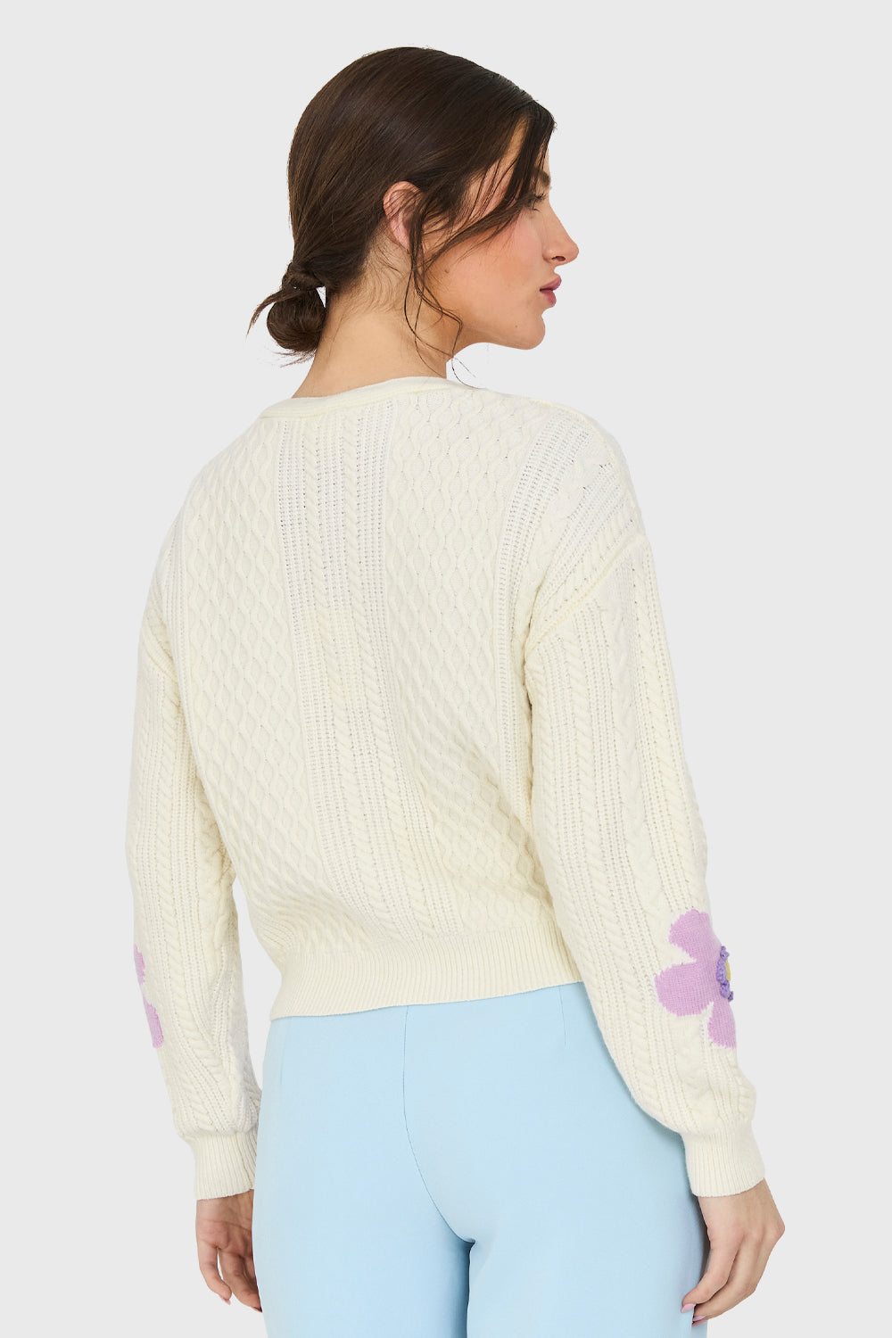 Características: Cárdigan trenzado de manga larga con flores 3D. Botones de ajuste en la parte frontal.