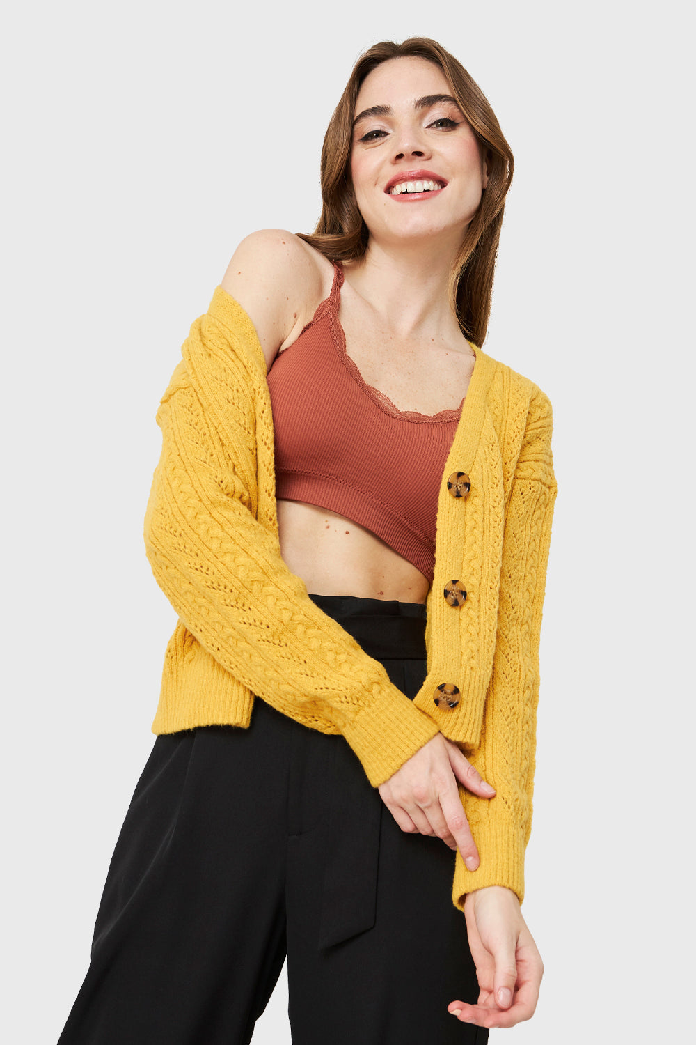 Características: Cárdigan corto con punto de fantasía. Posee botones.