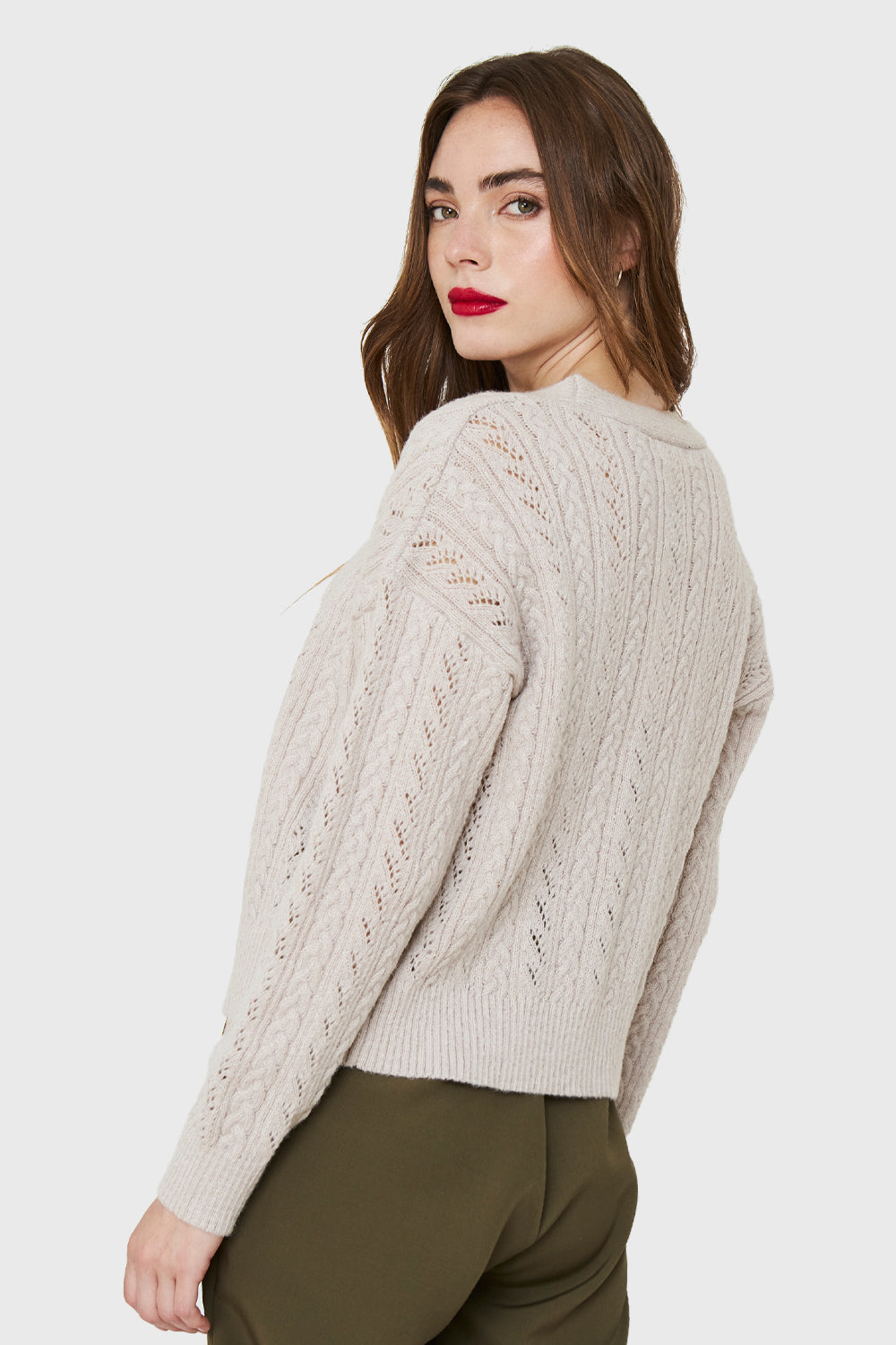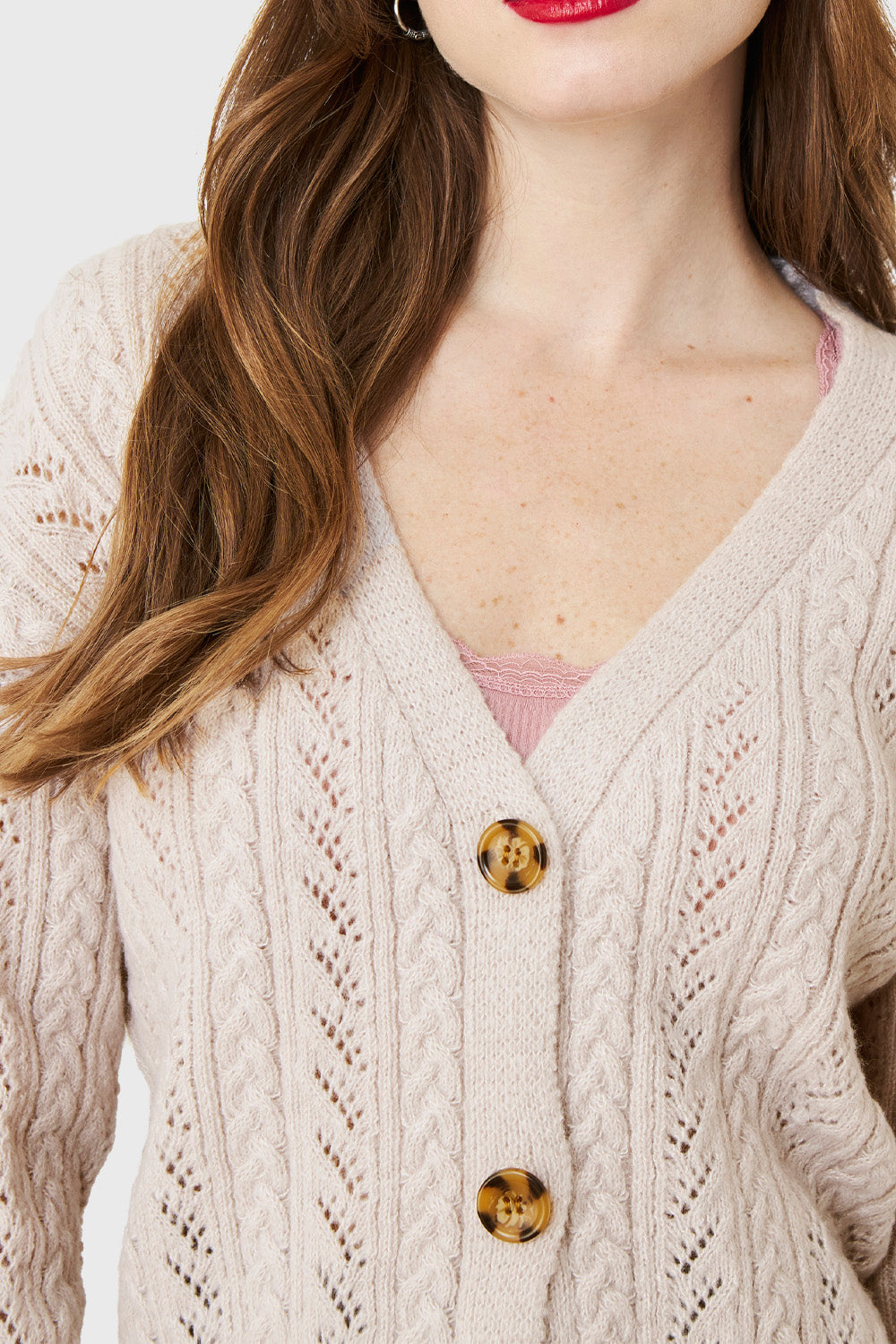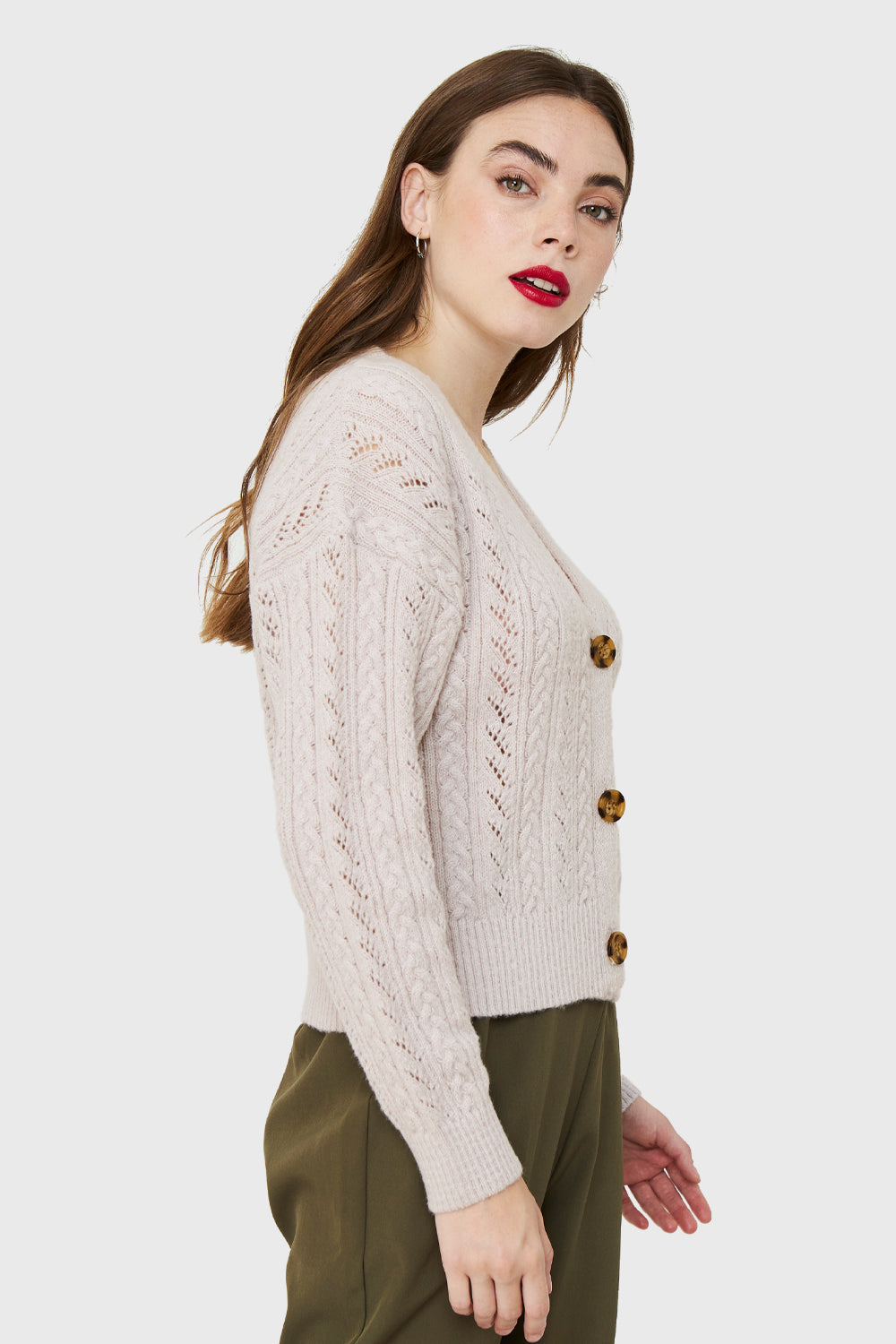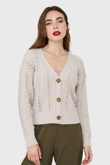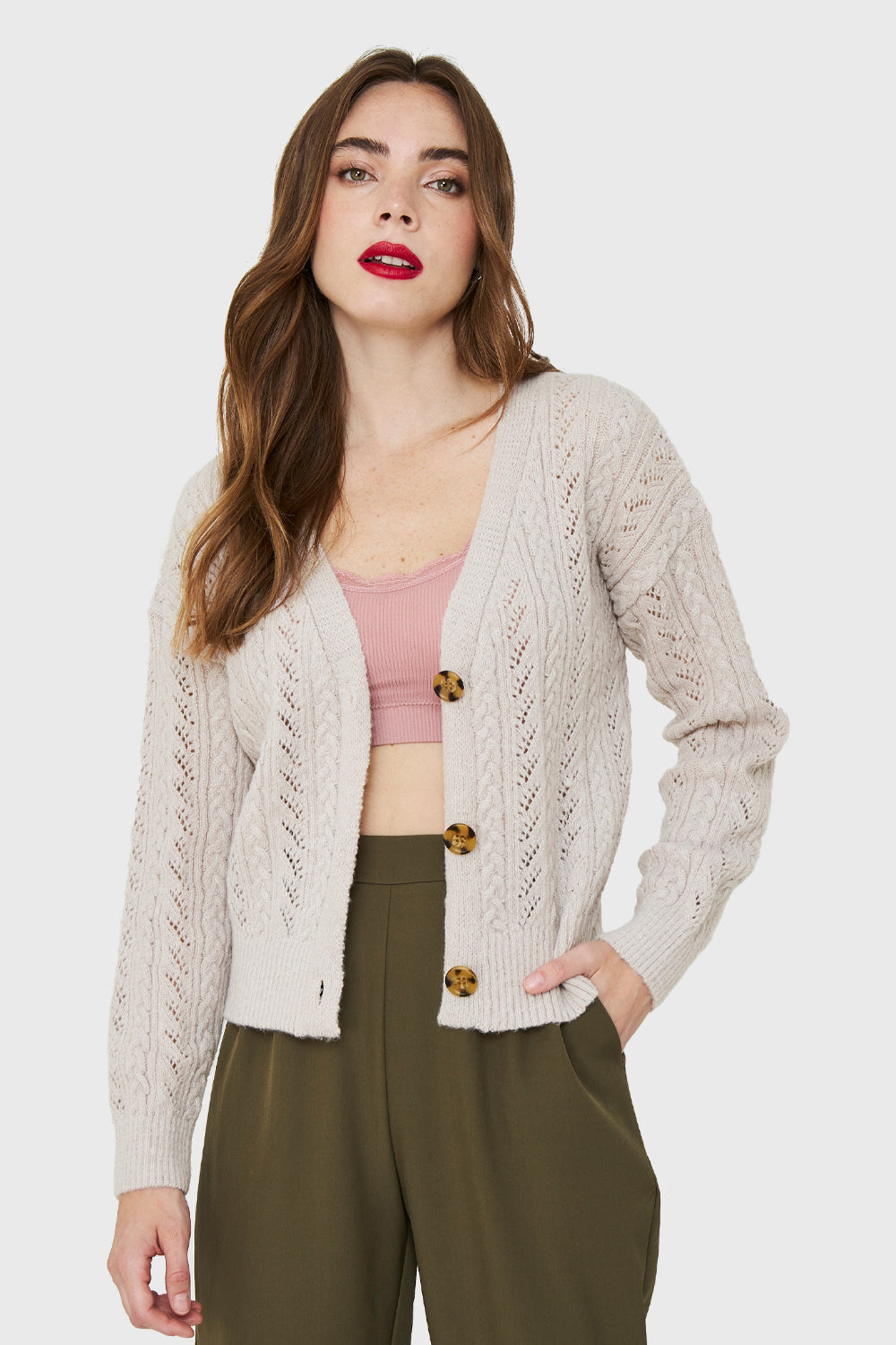 Características: Cárdigan corto con punto de fantasía. Posee botones.