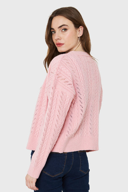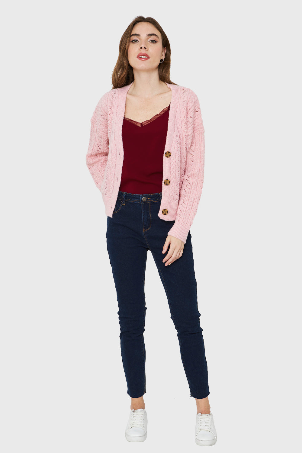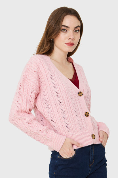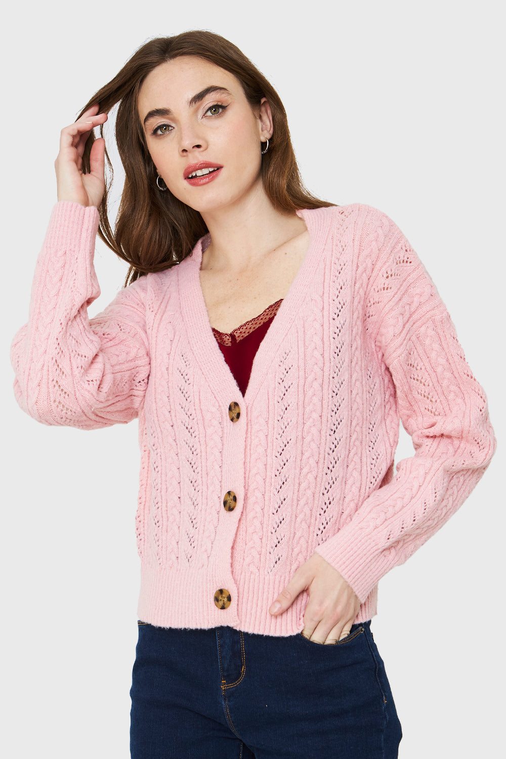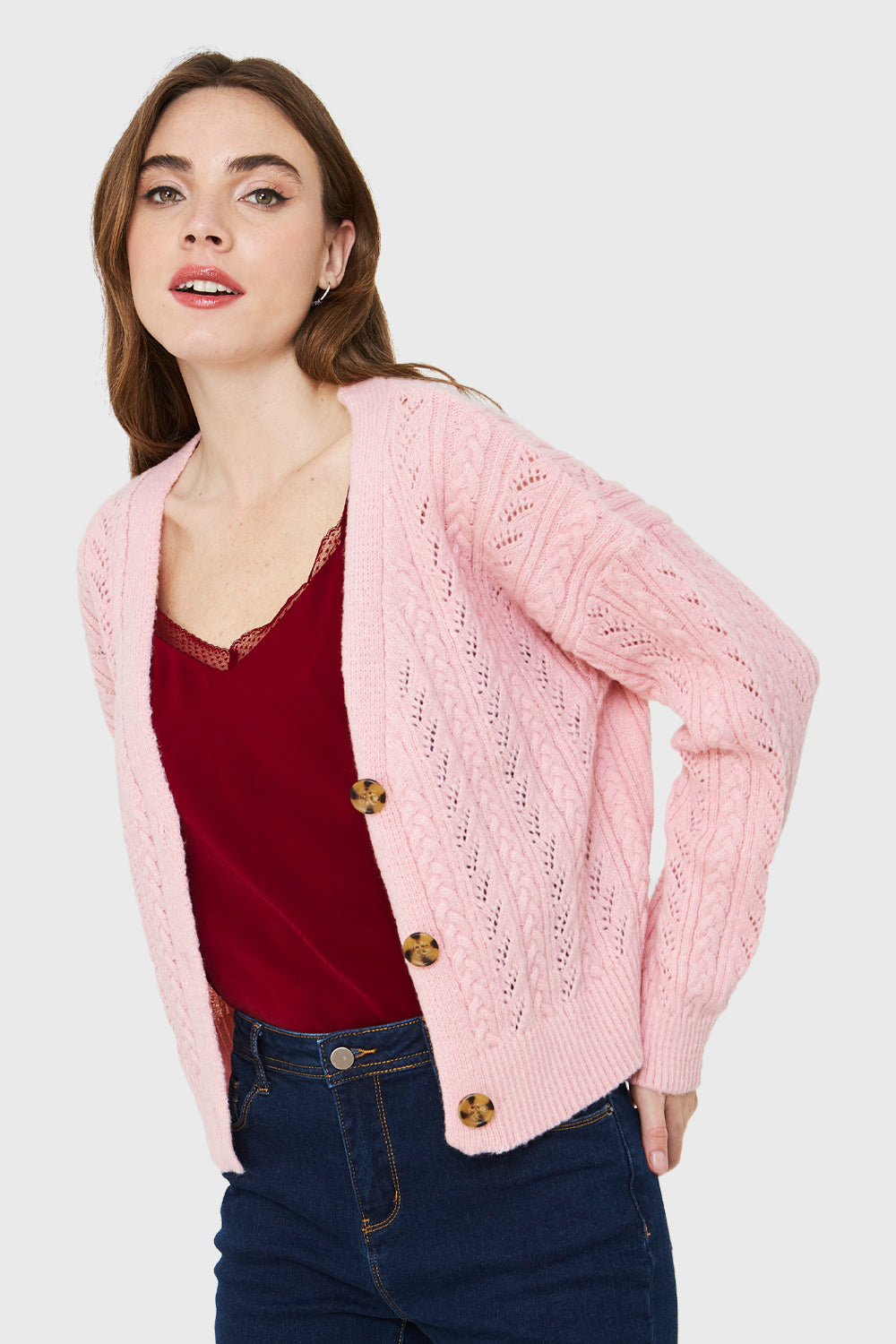 Características: Cárdigan corto con punto de fantasía. Posee botones.