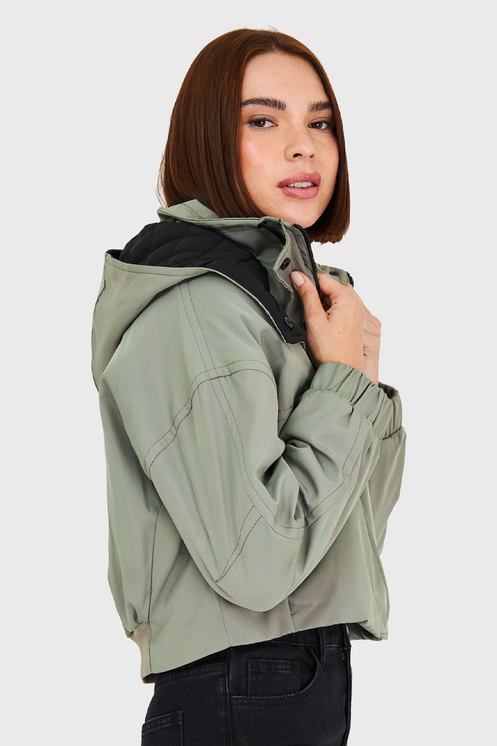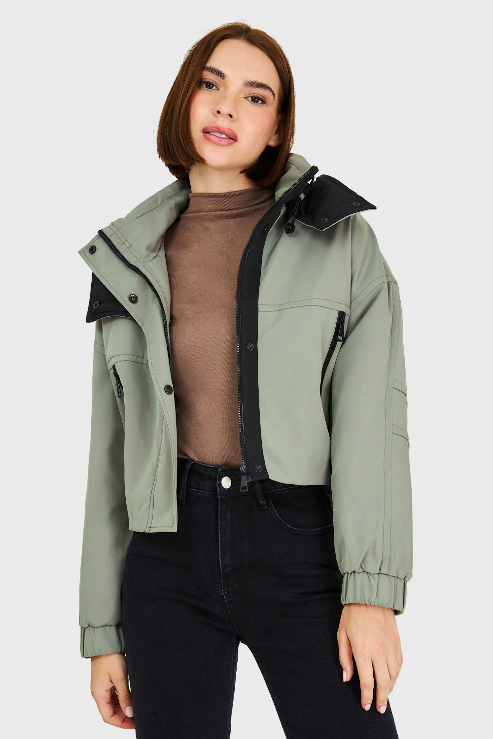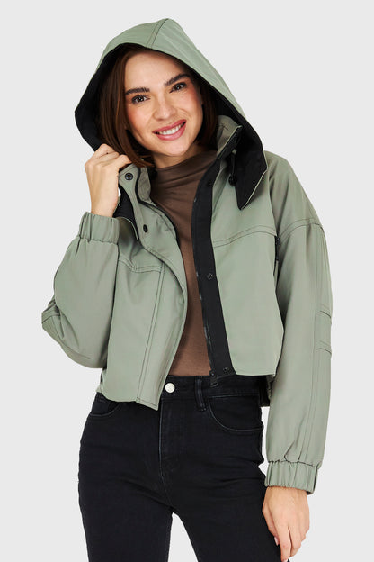 Características: Chaqueta corta impermeable. Gorro con cierre de broches. Elástico en puños. Pretina elasticada en la espalda. Cierre y broches de ajuste. Cuello alto con elástico. Bolsillos invisibles al costado. Posee forro.
