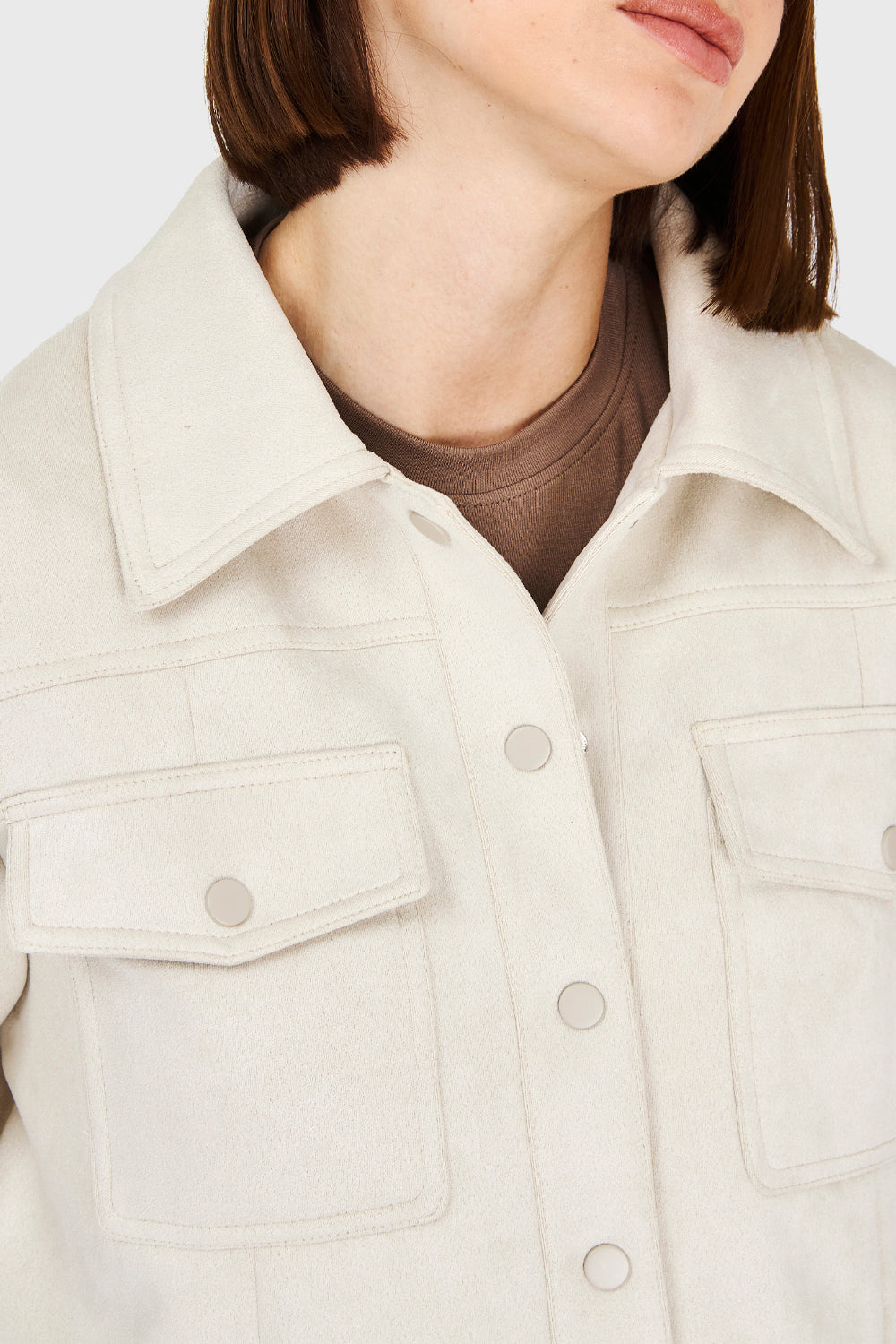 Características: Chaqueta corta tipo gamuza. Broches en puños y en cierre frontal. Cuello tipo camisero. Bolsillos cargo con broches de ajuste. Posee forro.