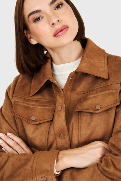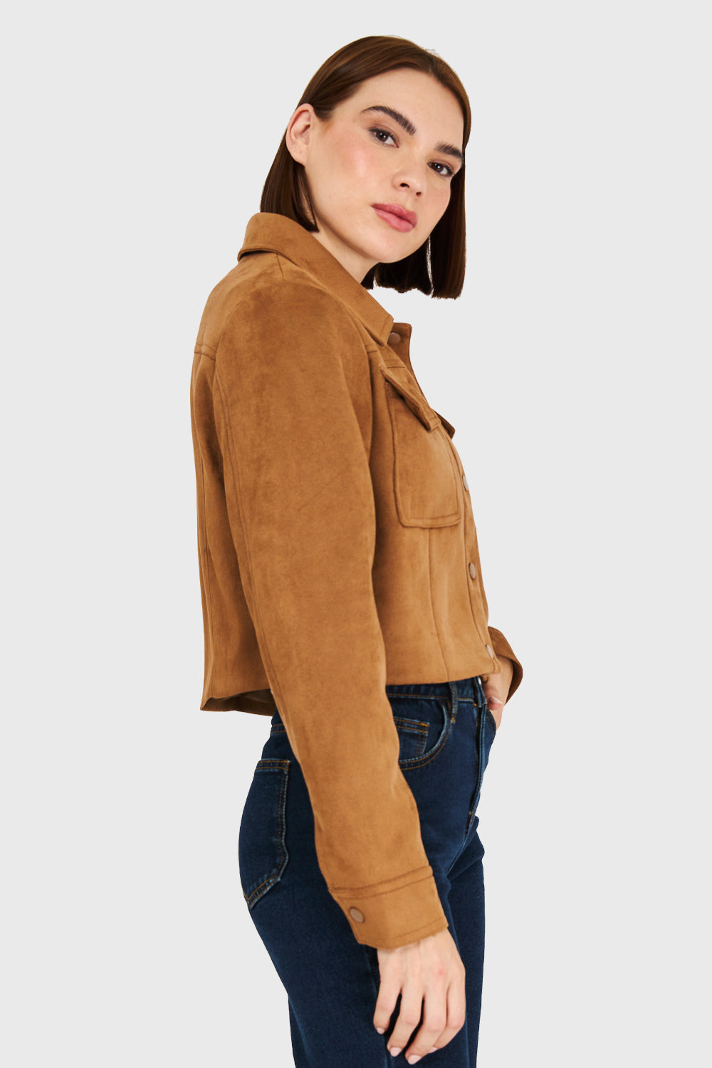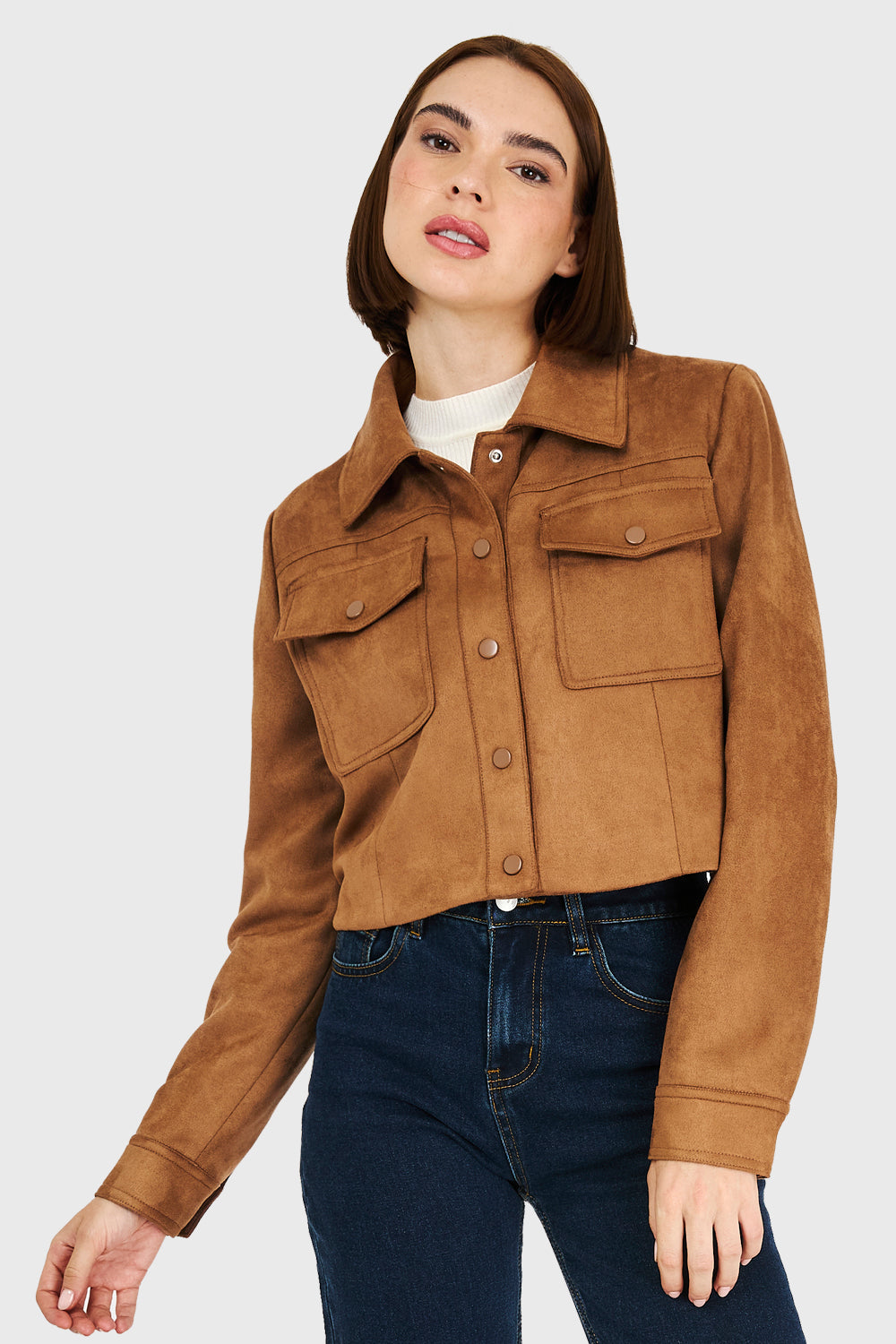 Características: Chaqueta corta tipo gamuza. Broches en puños y en cierre frontal. Cuello tipo camisero. Bolsillos cargo con broches de ajuste. Posee forro.