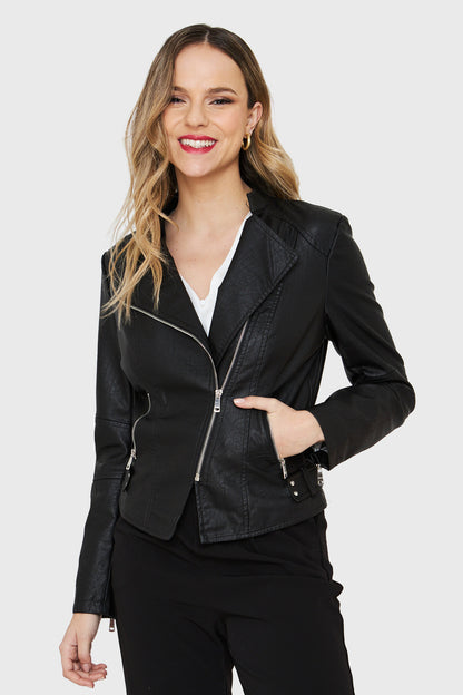 Chaqueta Cuello Mao Ecocuero Cierre Diagonal Negro