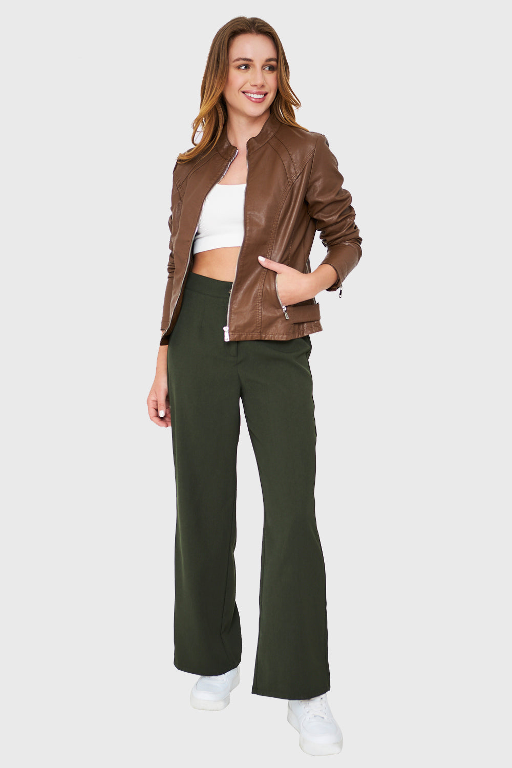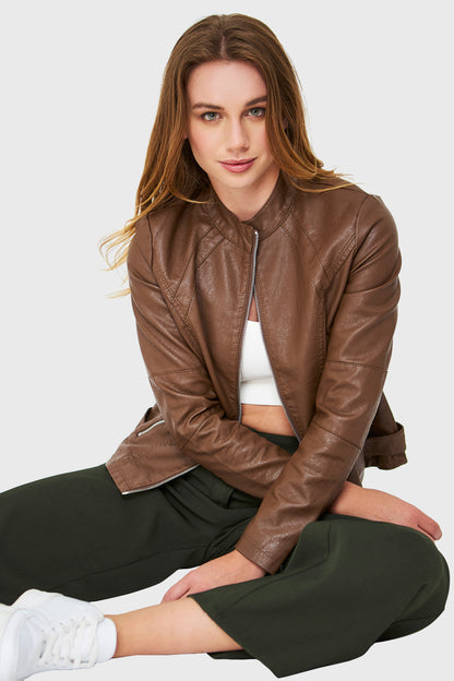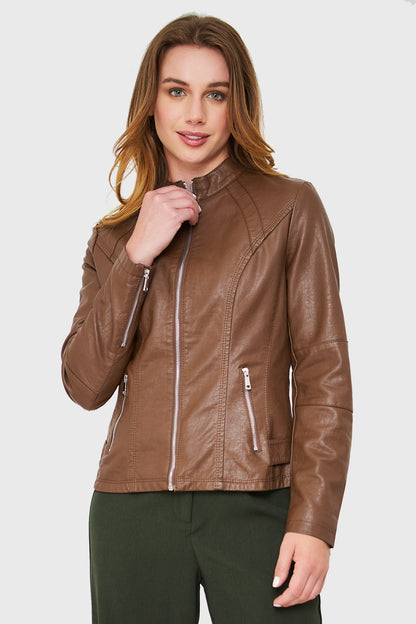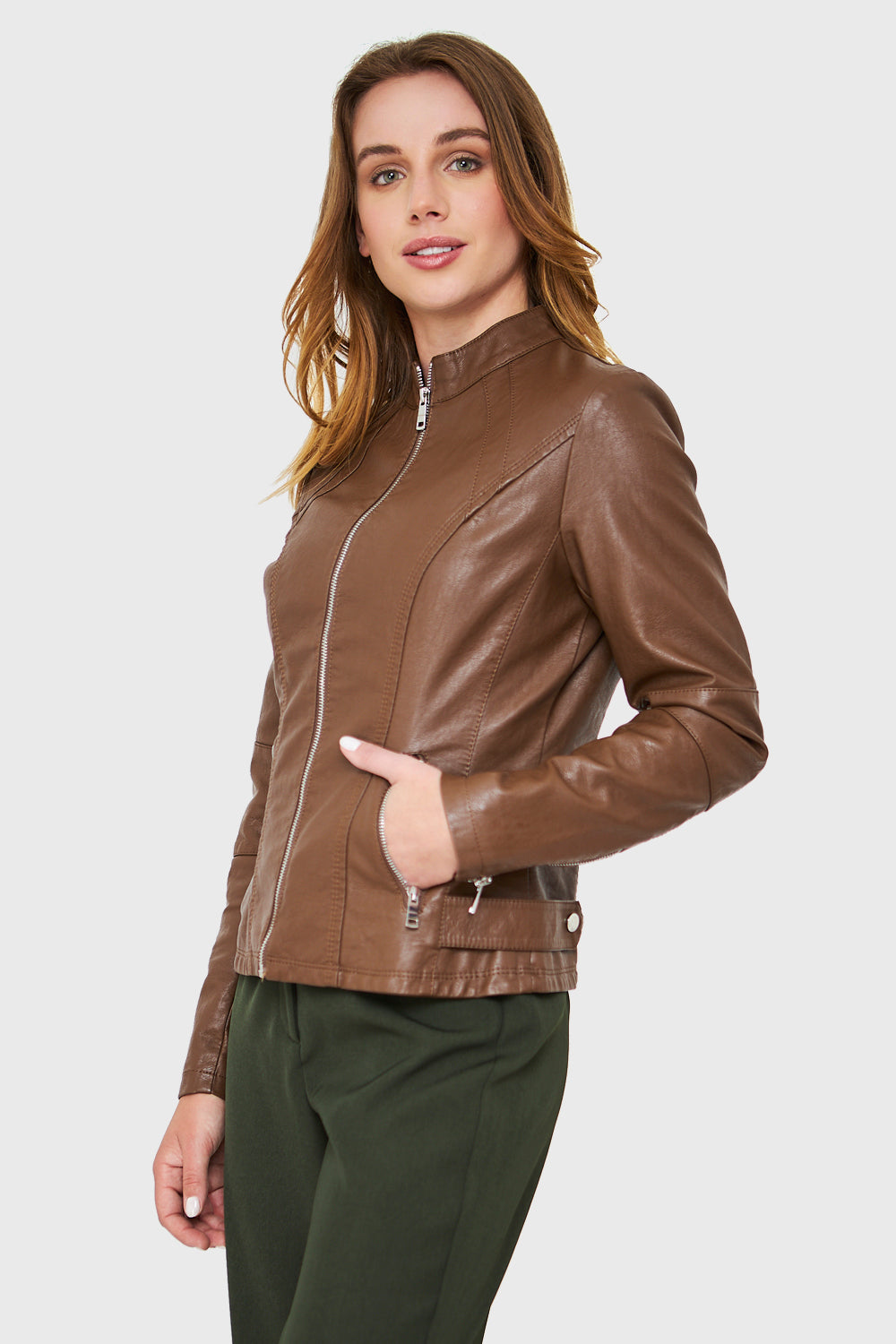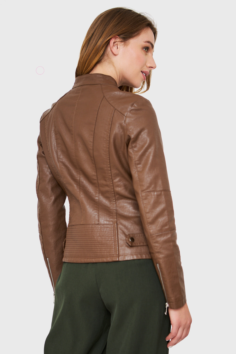 Características: Chaqueta cuello mao ecocuero con cierre frontal recto. Detalles de cierres en puños y bolsillos.