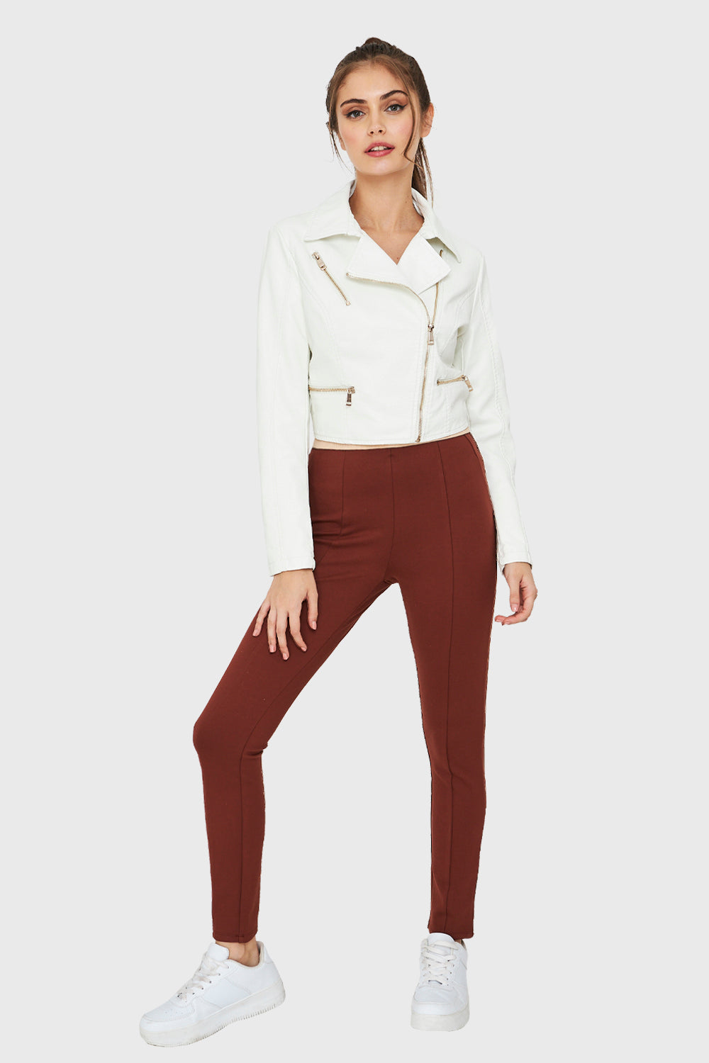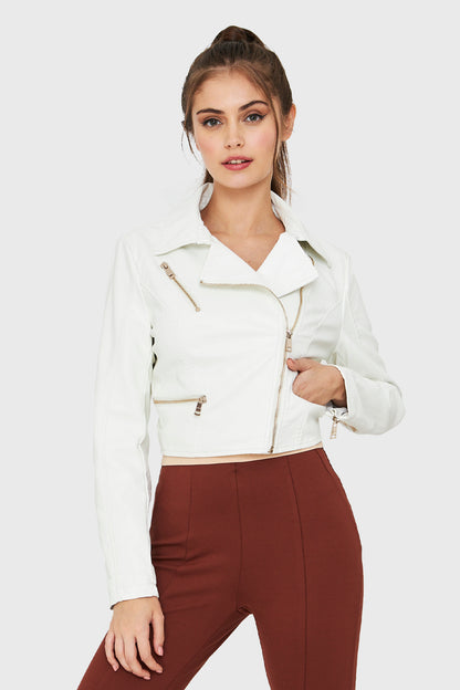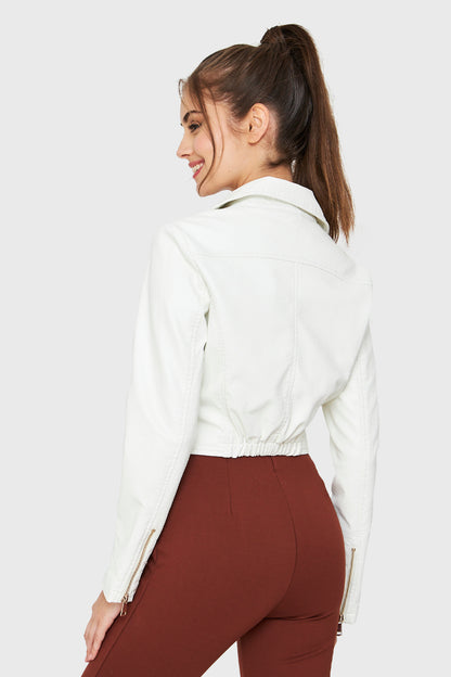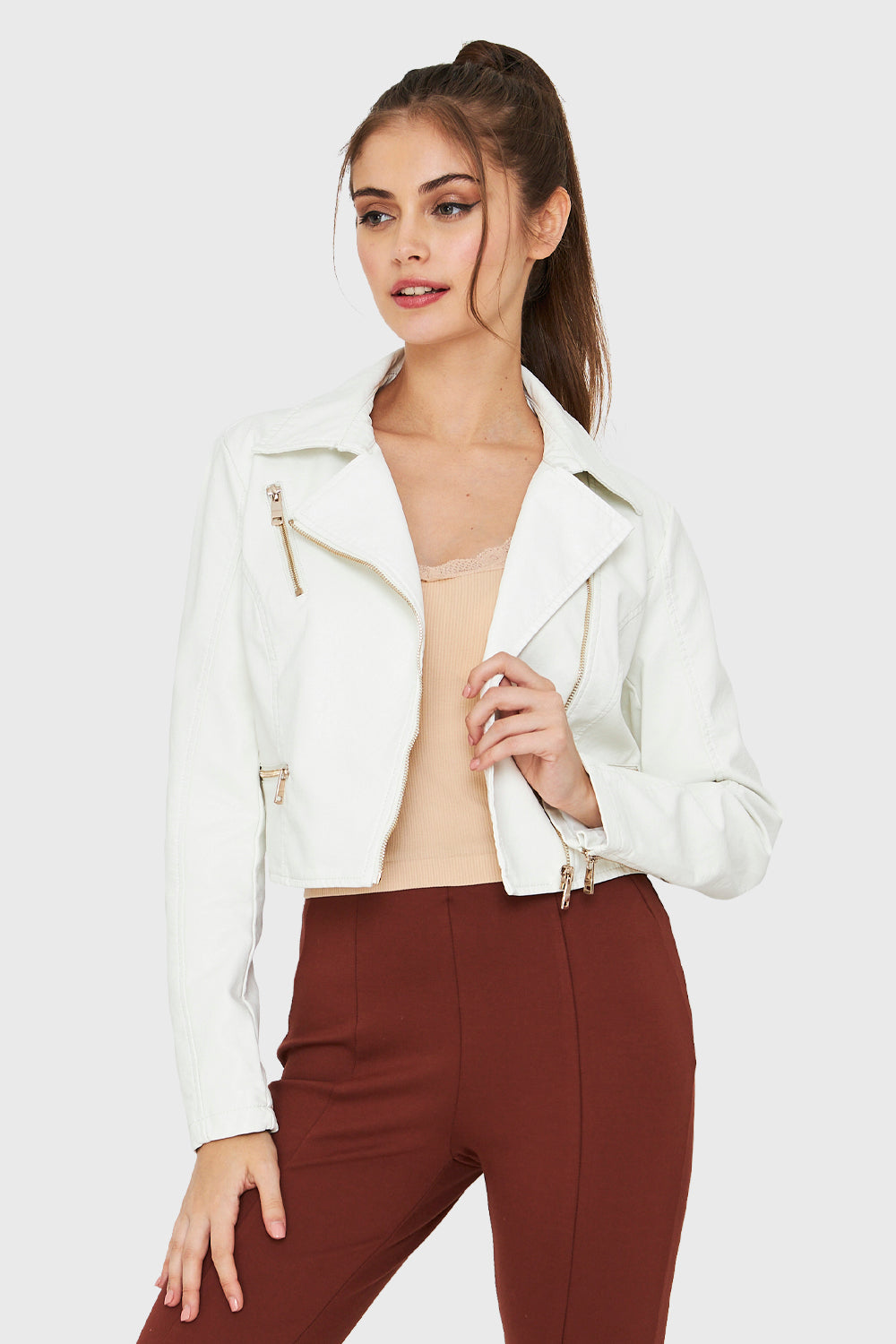 Características: Chaqueta ecocuero estilo biker corta con cierre frontal diagonal. Detalles de cierres en puños, bolsillos y parte delantera. Con elástico en la espalda.