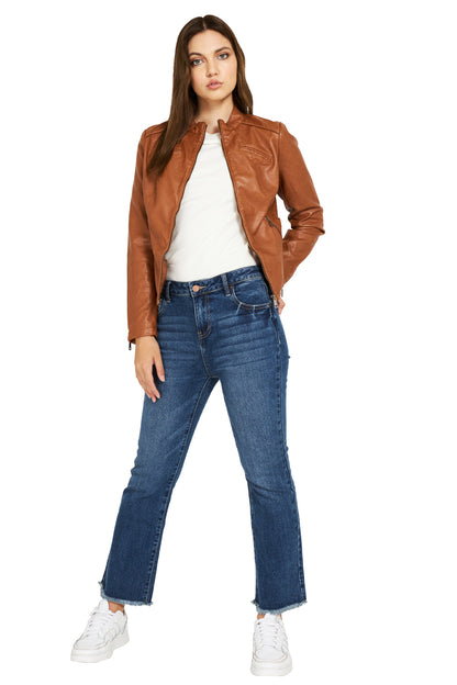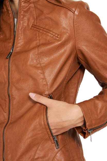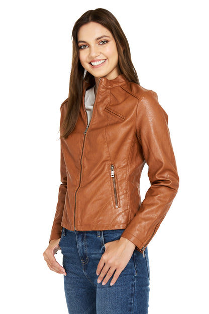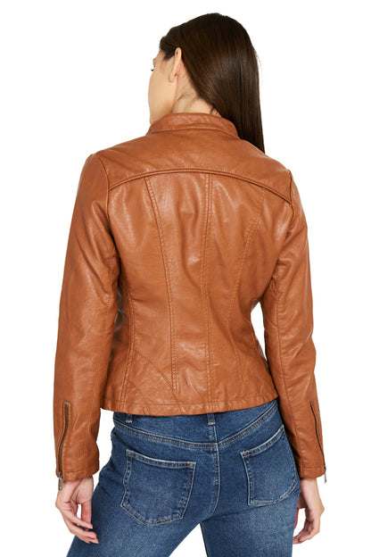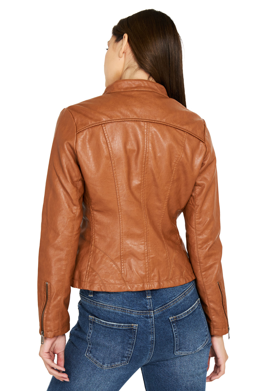 Características: Chaqueta ecocuero, cuello mao. Cierre frontal. Bolsillos funcionales. Puño de mangas con cierre para ajuste.