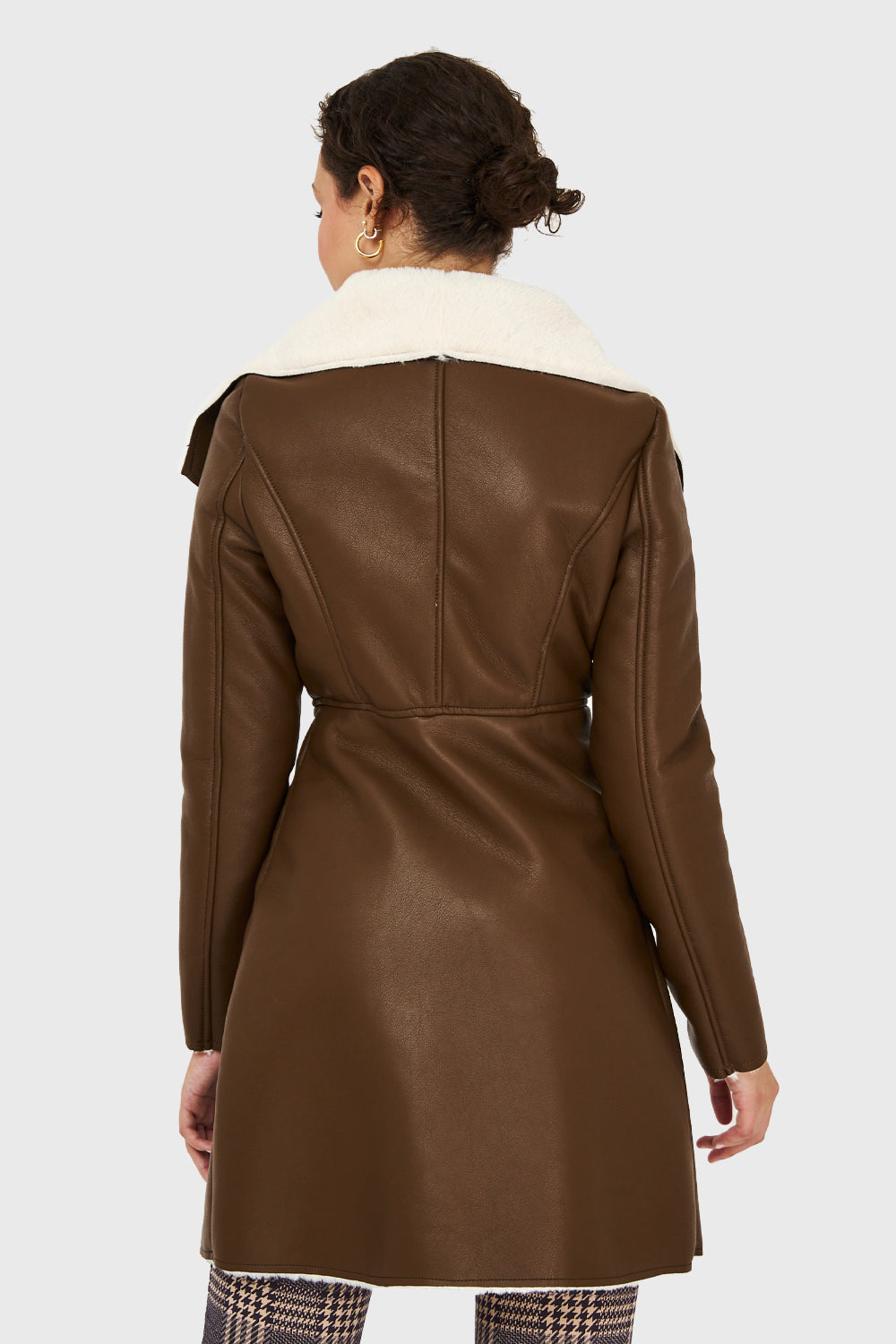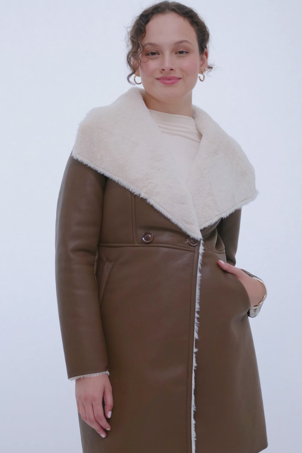 Características: Abrigo interior tipo piel. Sin forro. Bolsillos funcionales al costado. Solapa tipo cuello cruzado con un botón de ajuste. Interior de mangas también con tejido tipo piel.