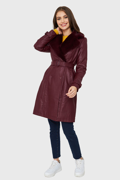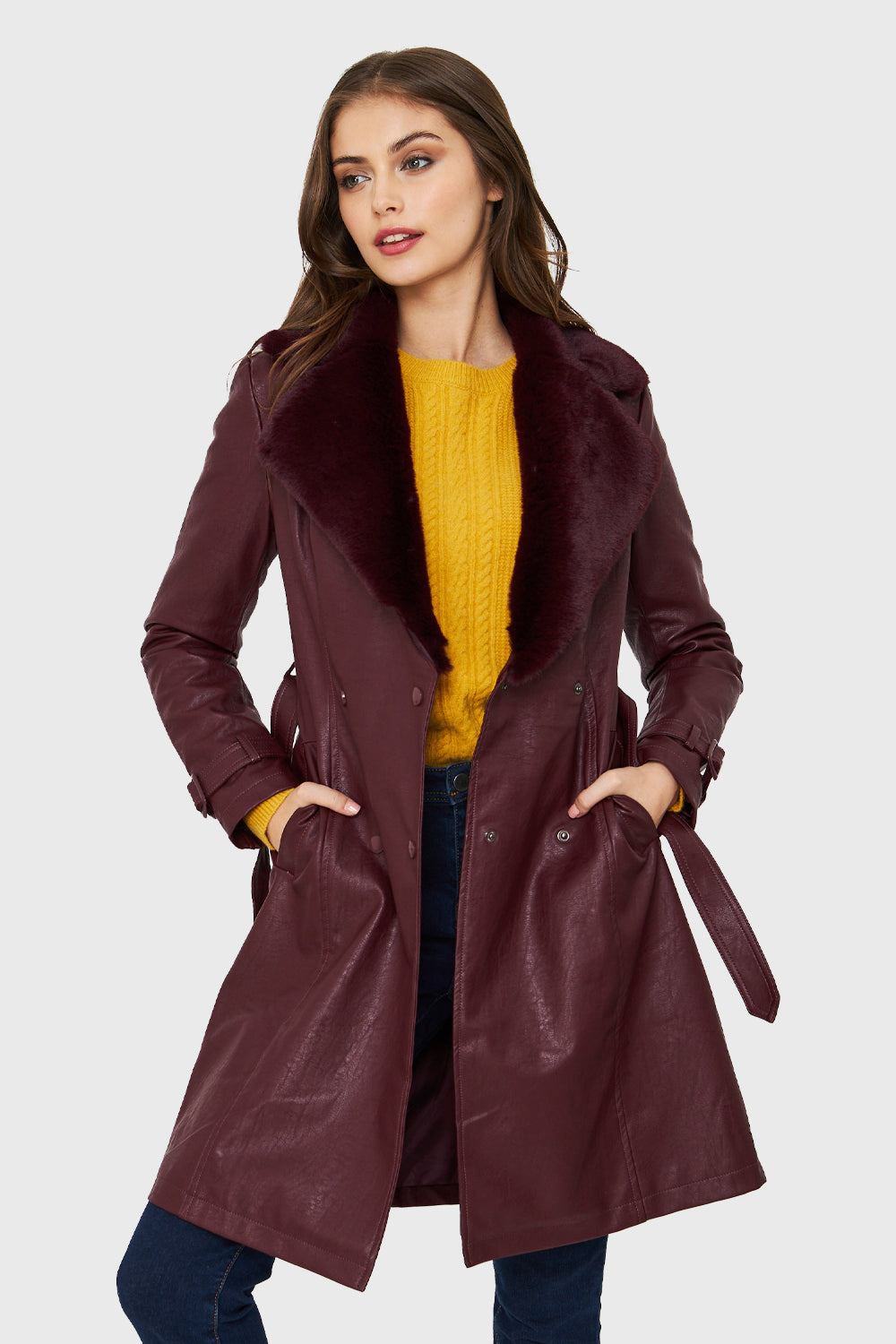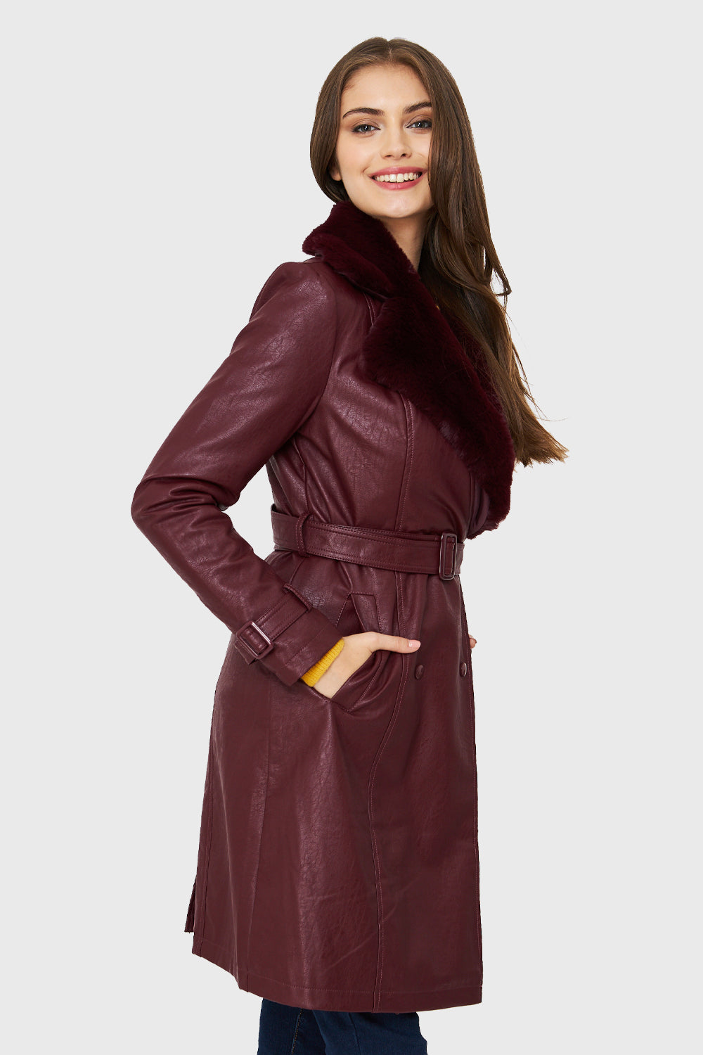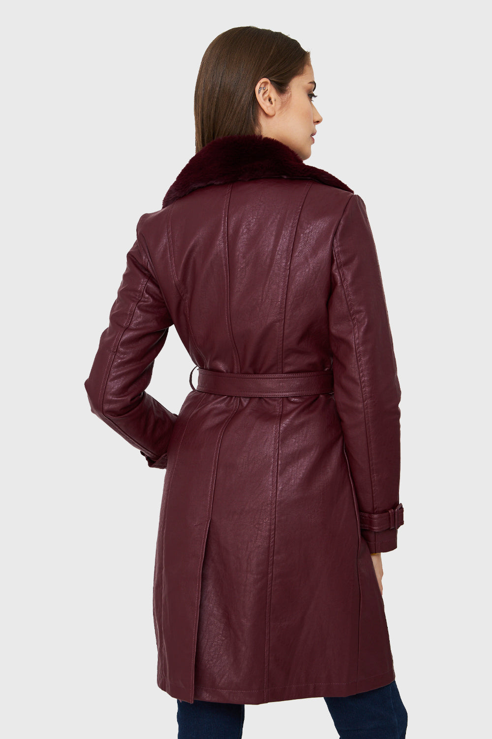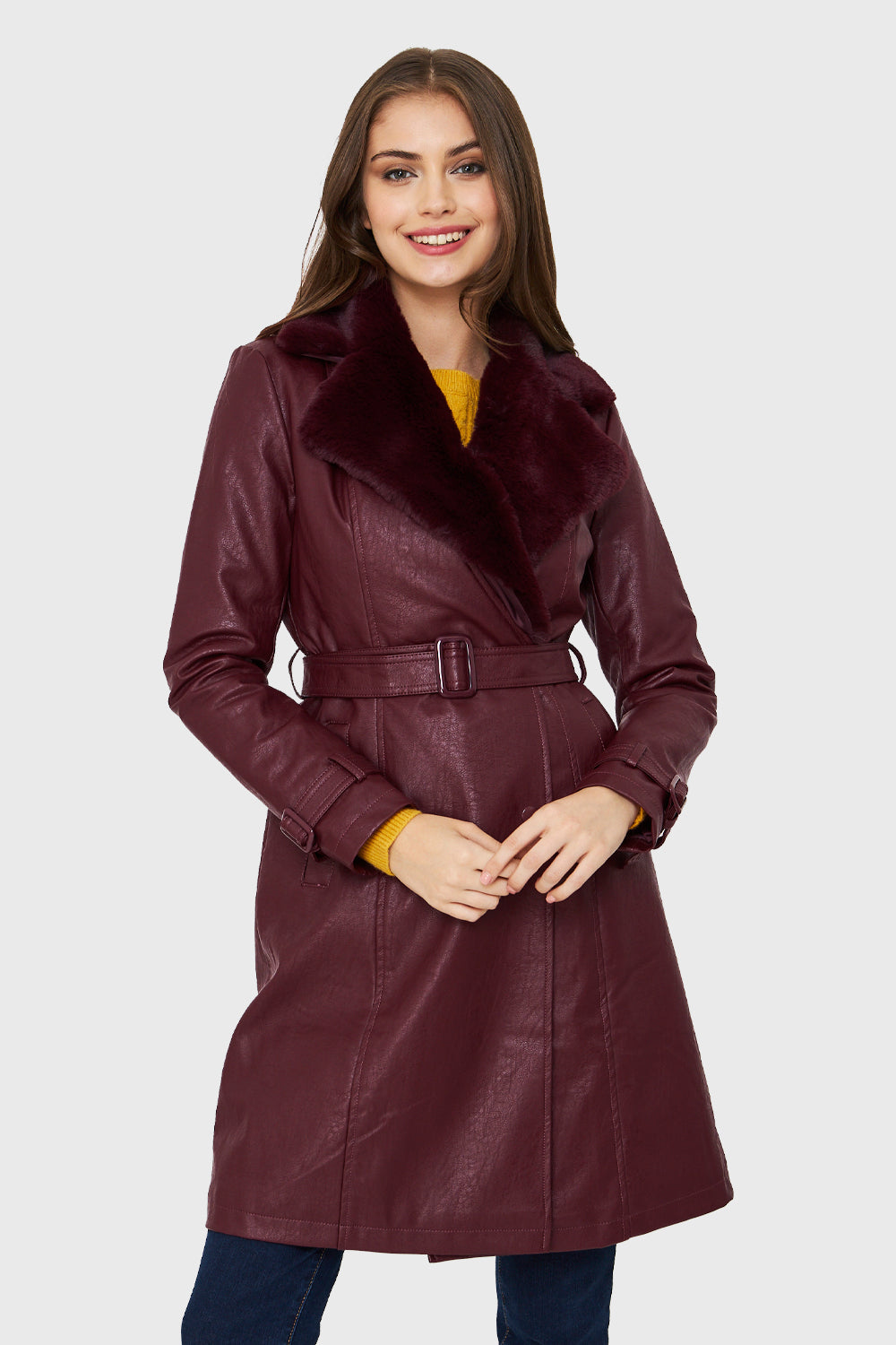 Características: Chaqueta midi ecocuero. Cuello tipo piel. 4 broches para cerrar la chaqueta y cinturón para ajuste. Bolsillos a los costados. Abertura atrás en la basta para mayor comodidad al caminar. Posee forro.