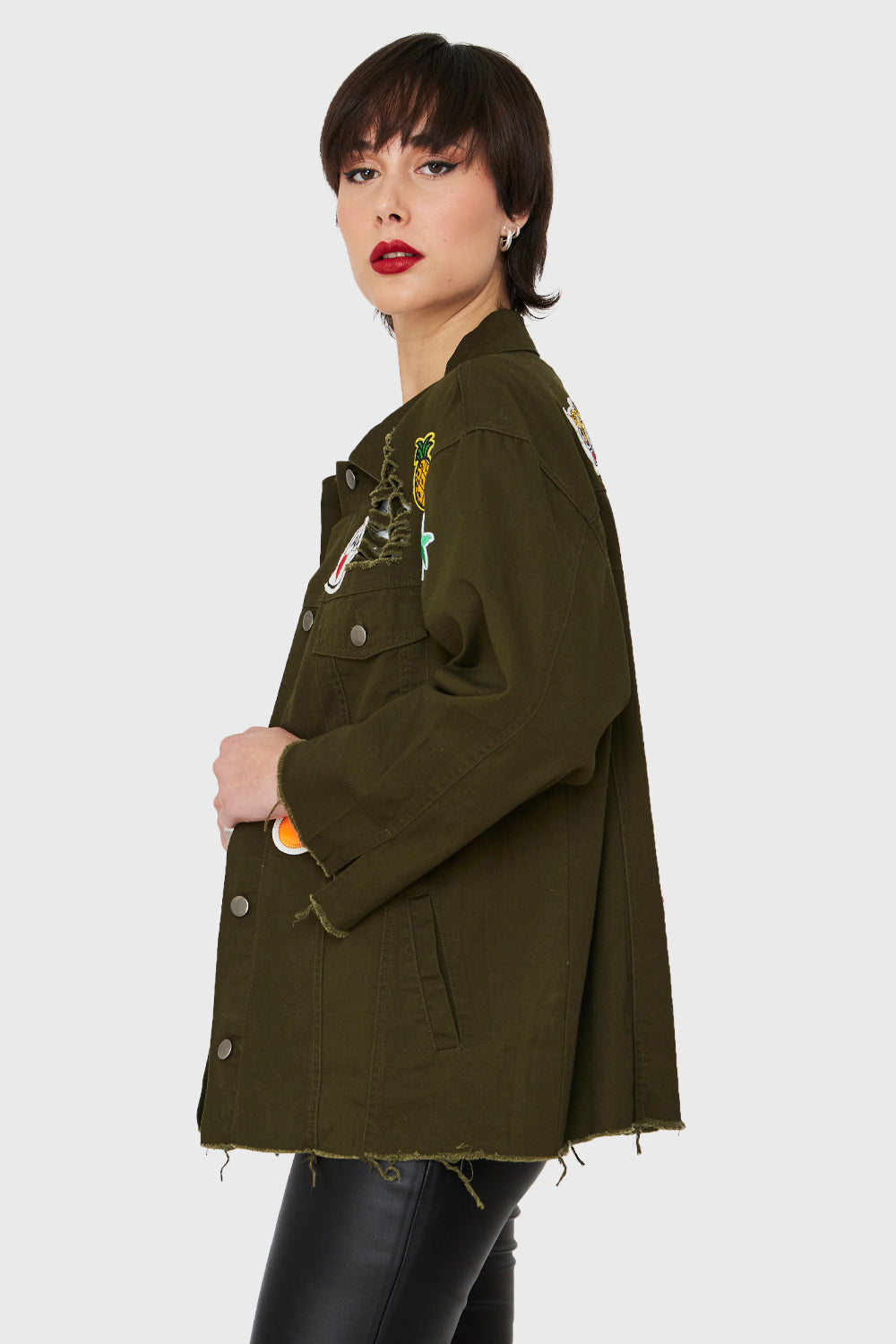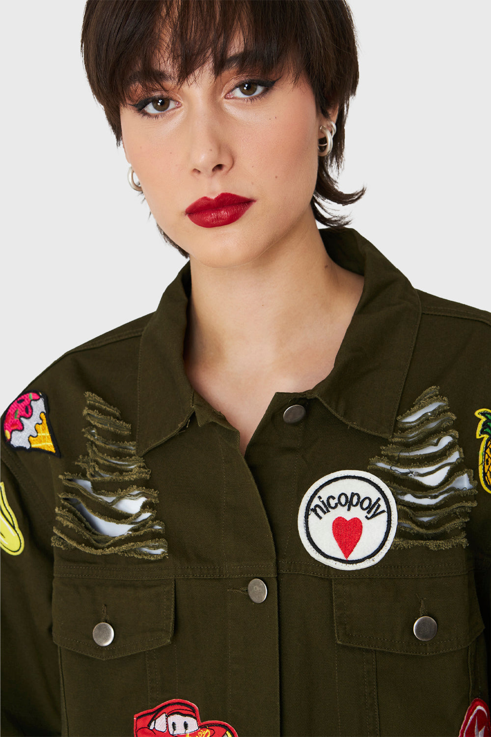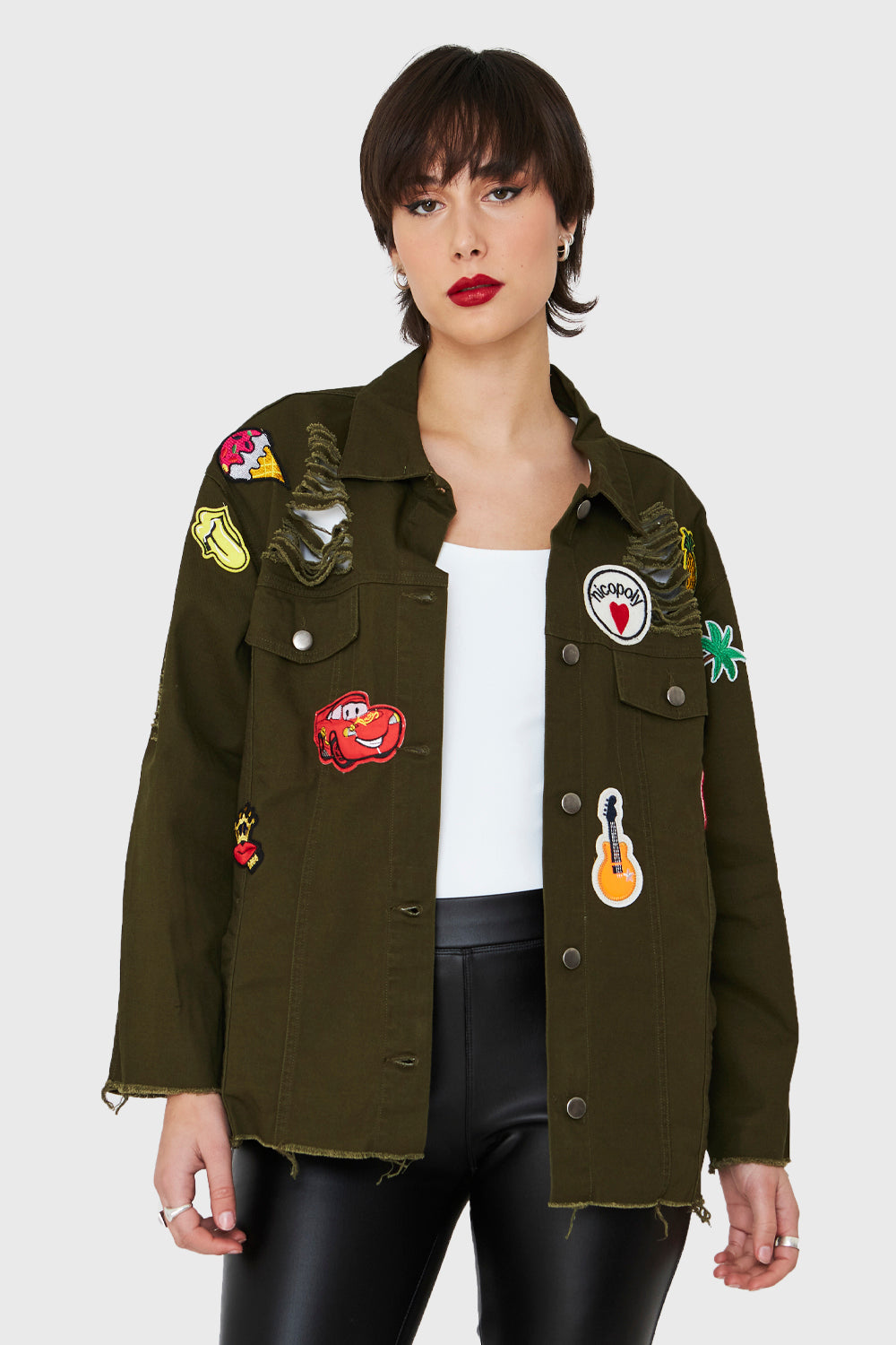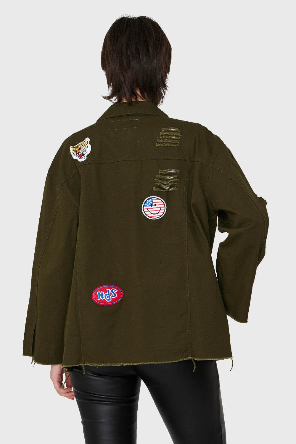 Características: Chaqueta oversize con parches y terminaciones deshilachadas. Bolsillos laterales y a nivel de busto funcionales. Botones de ajuste.