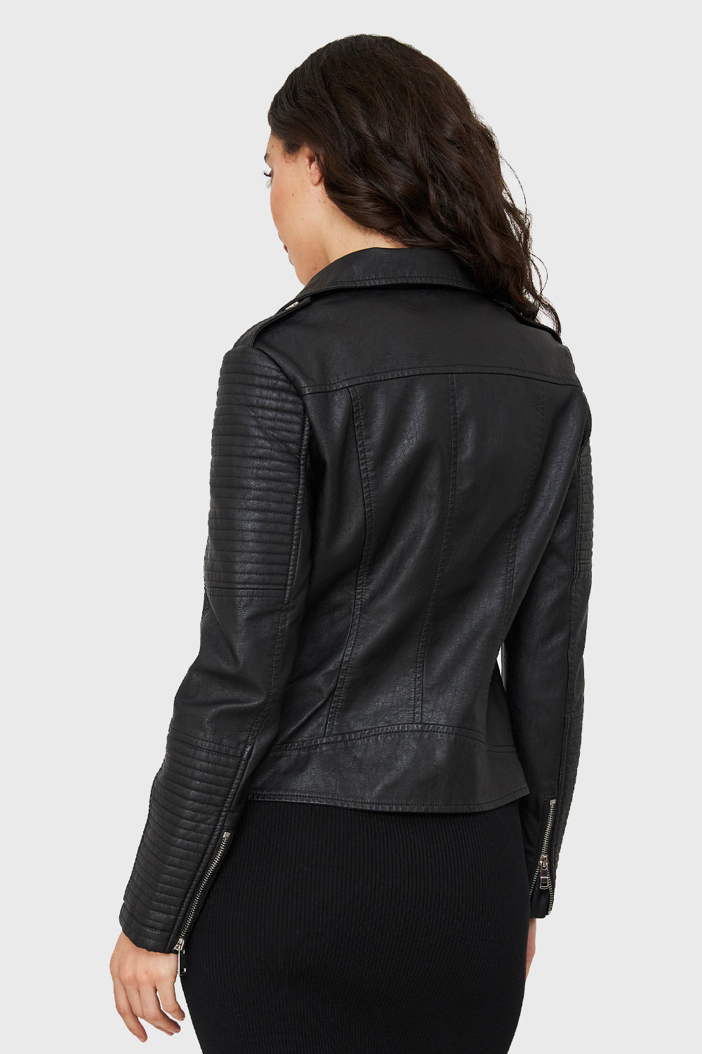 Características: Chaqueta ecocuero con cierre frontal diagonal estilo biker. Detalles de cierres en puños y bolsillos. Broches decorativos en solapas del cuello.