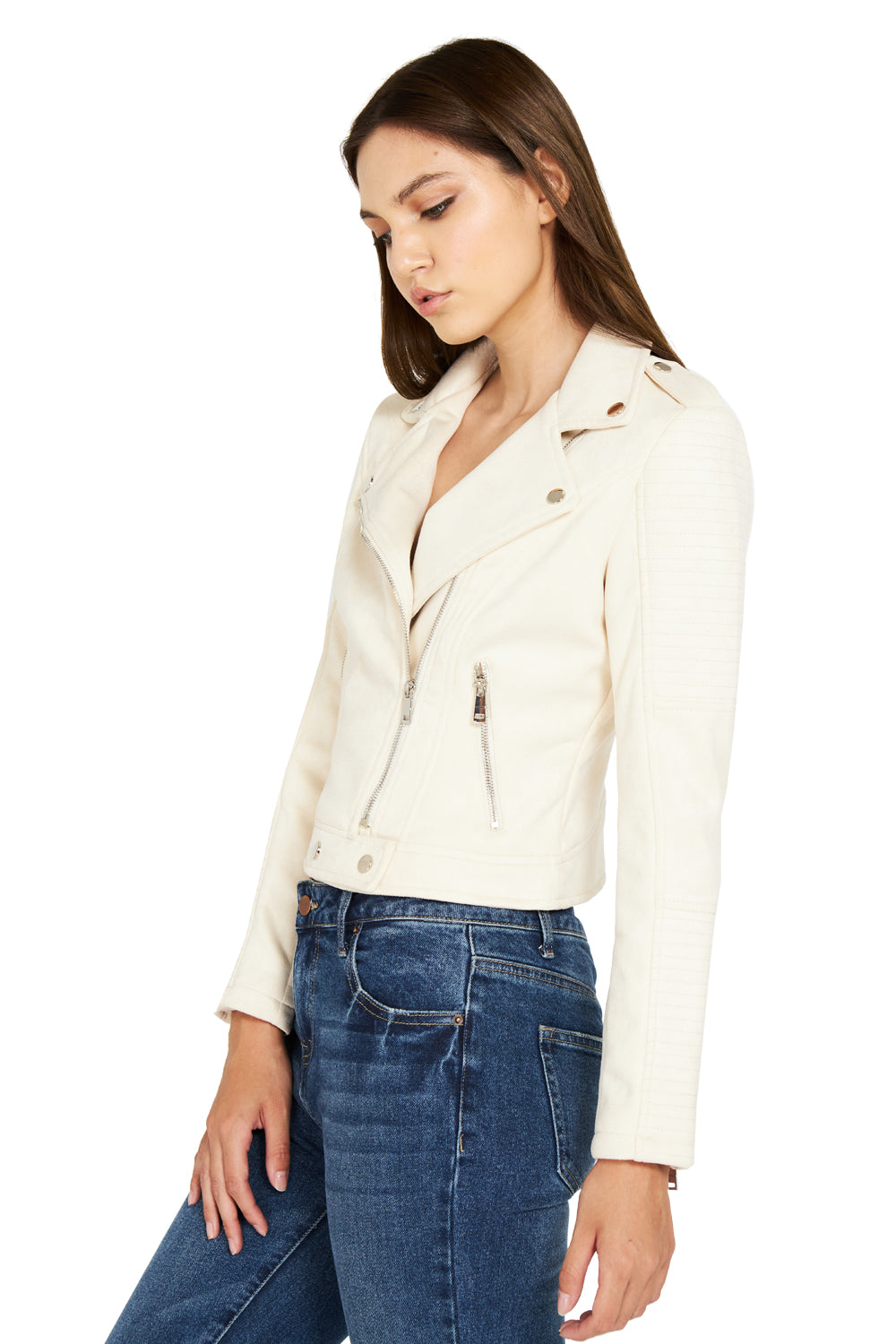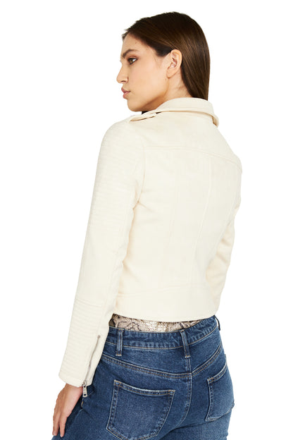 Características: Chaqueta tipo gamuza estilo biker. Cierre lateral con broches de ajuste en parte inferior. Bolsillos funcionales. Puño de mangas con cierre para ajuste.