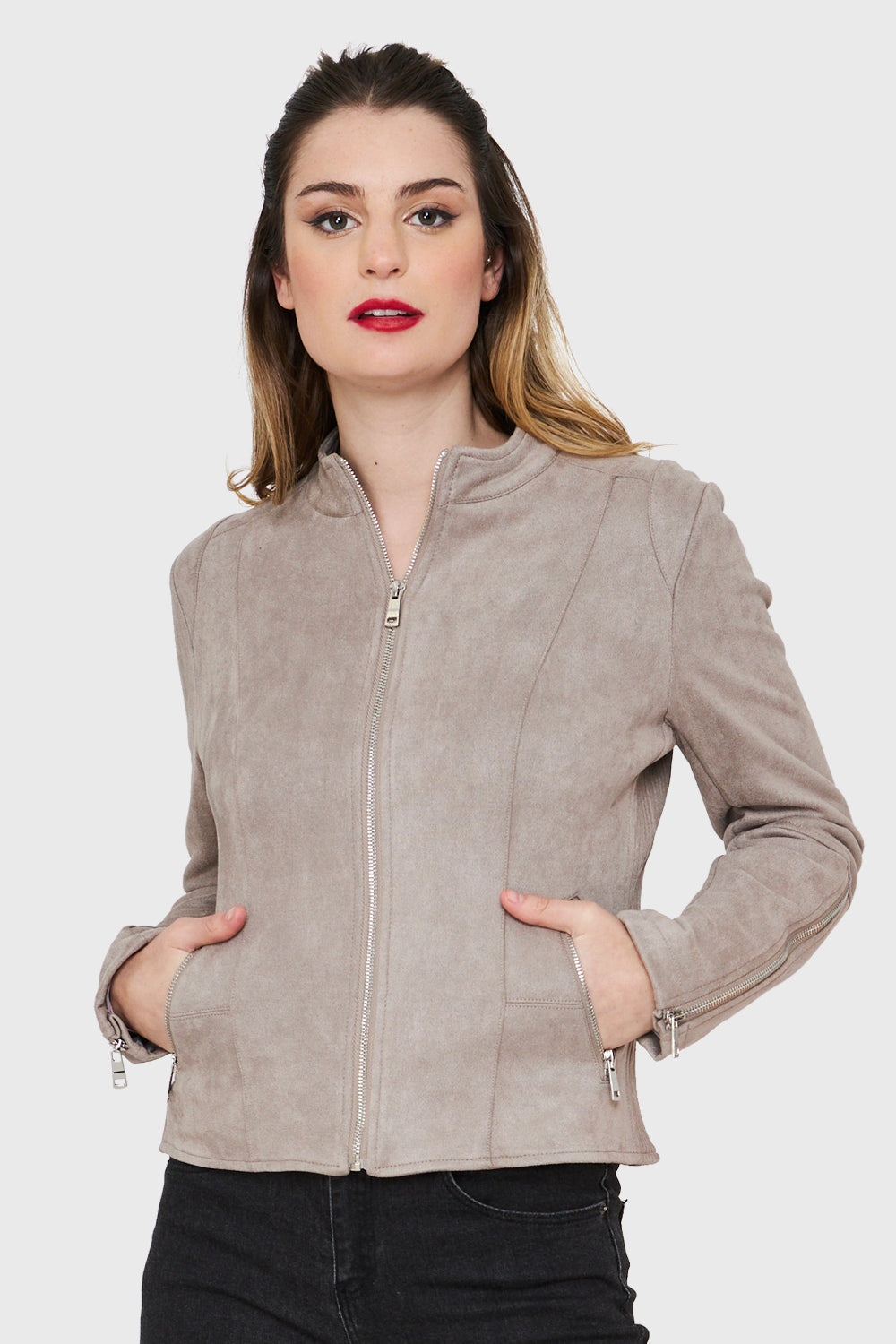 Características: Chaqueta tipo gamuza cuello mao. Bolsillos laterales con cierre y cierre en mangas.