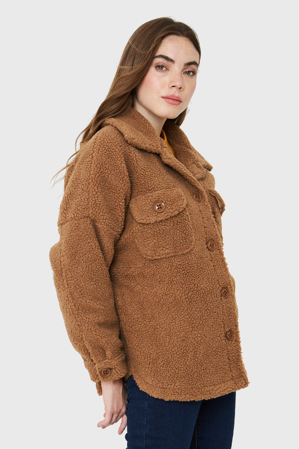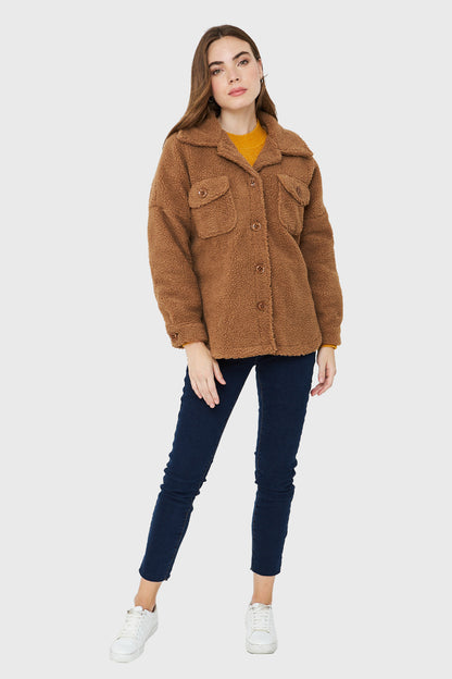 Características: Chaqueta tipo teddy. Botón en puños, cuello camisero. Bolsillos tipo cargo funcionales. Botones de ajuste al centro.