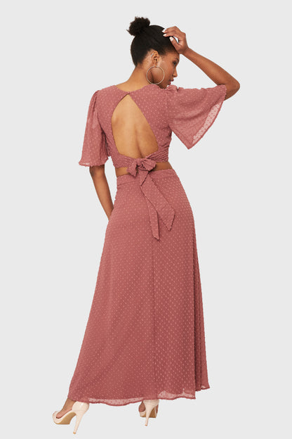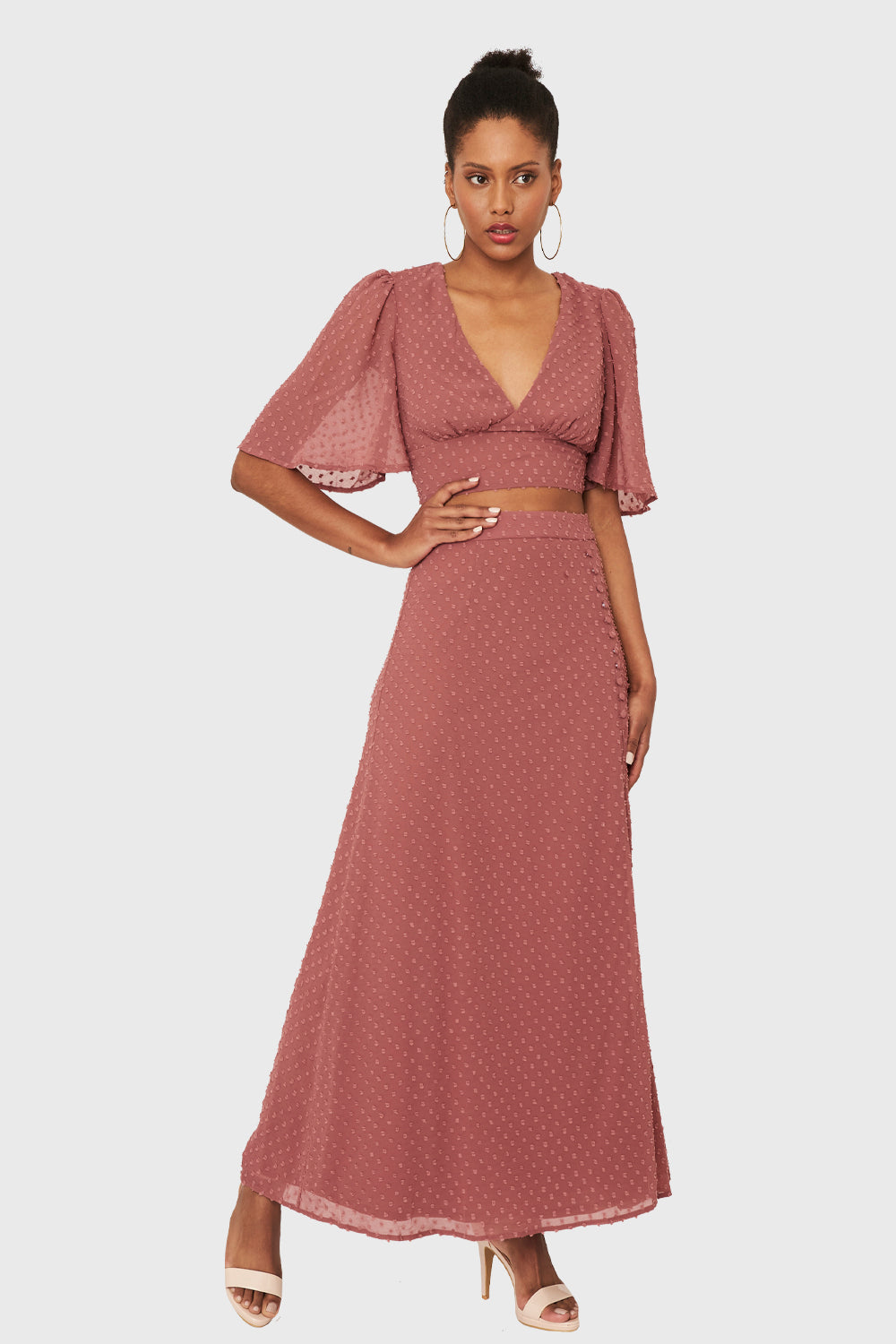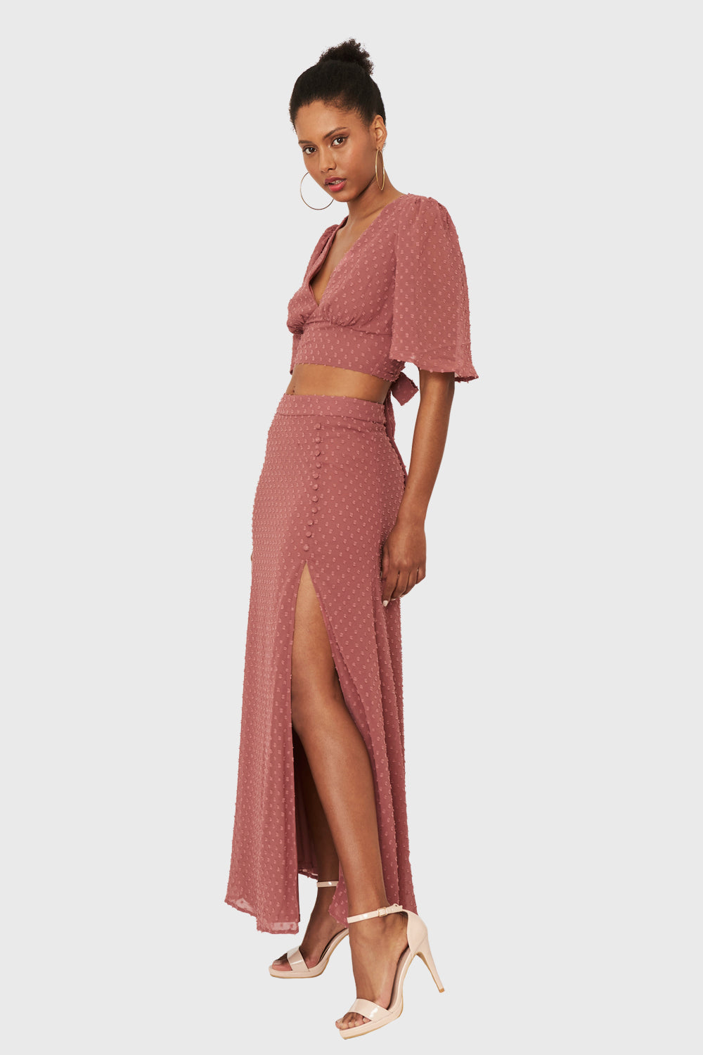 Características: Conjunto de top y falda larga a la cintura. Top manga corta tipo vuelos. Escote en V. Espalda descubierta con botón en cuello y lazo de en la cintura para su ajuste. Falda larga a la cintura con tajo profundo desde el muslo. Cierre invisible en espalda. Posee forro.