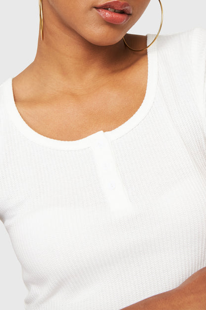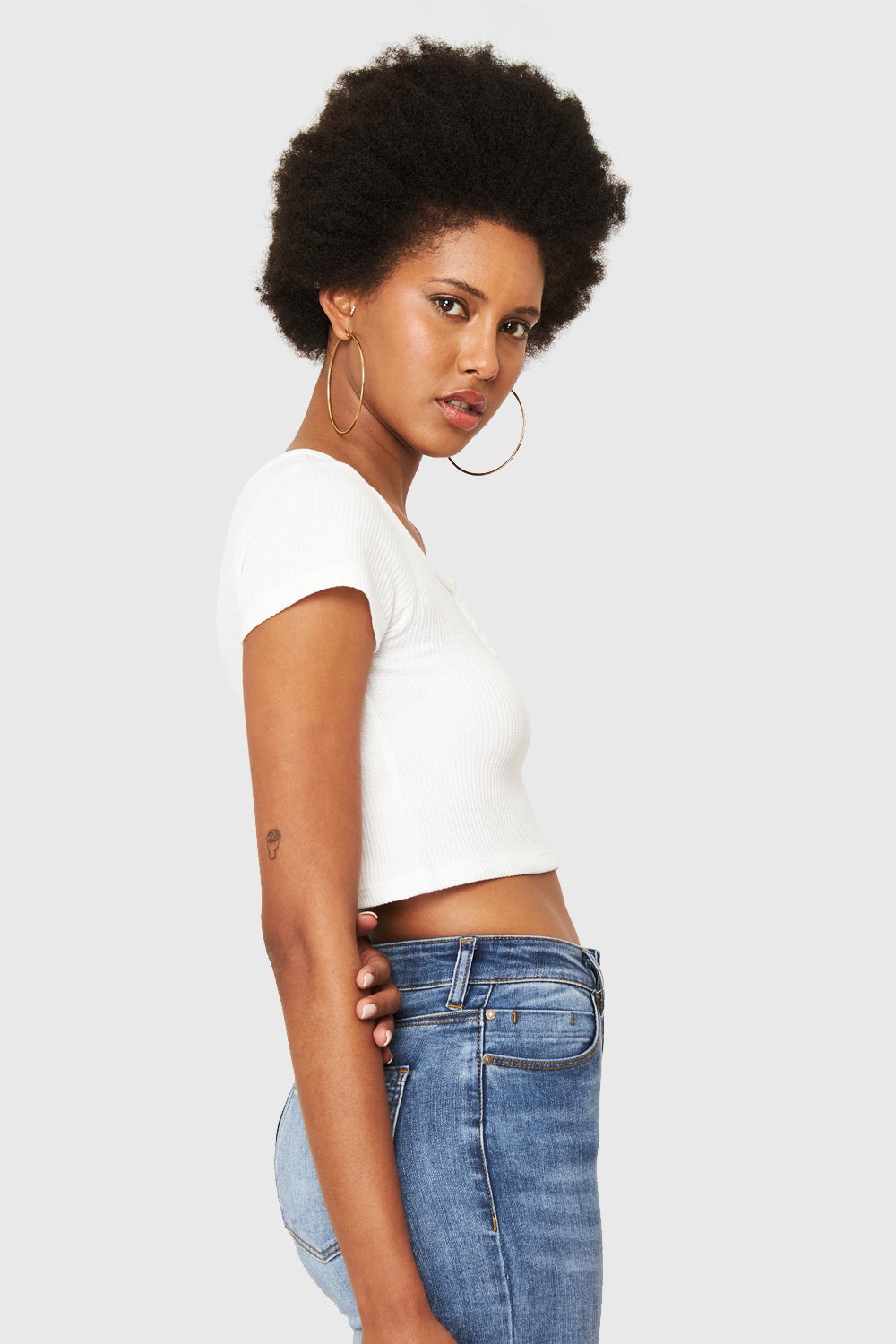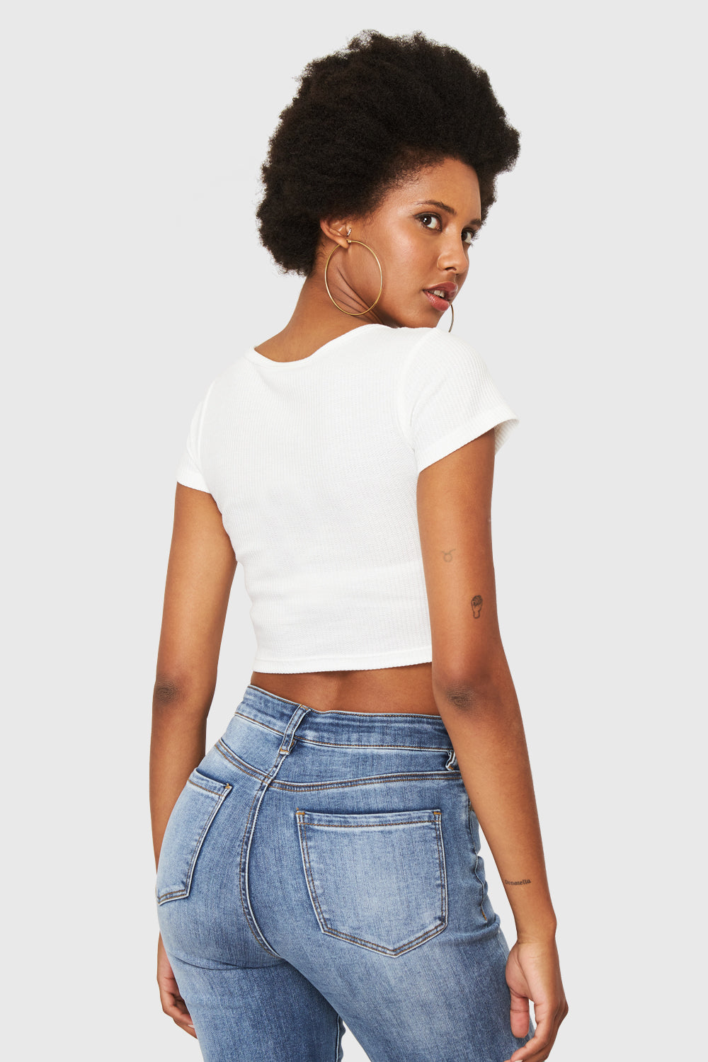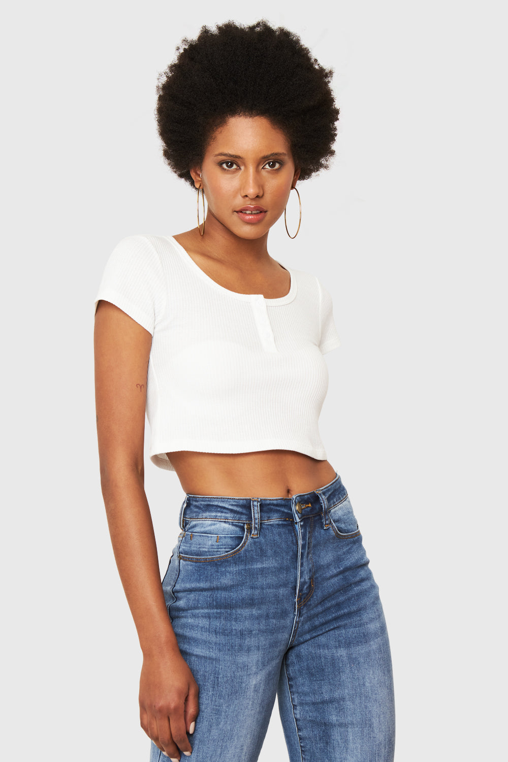 Características: Crop top acanalado con botones. Manga corta. Cuello redondo.