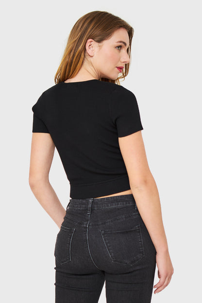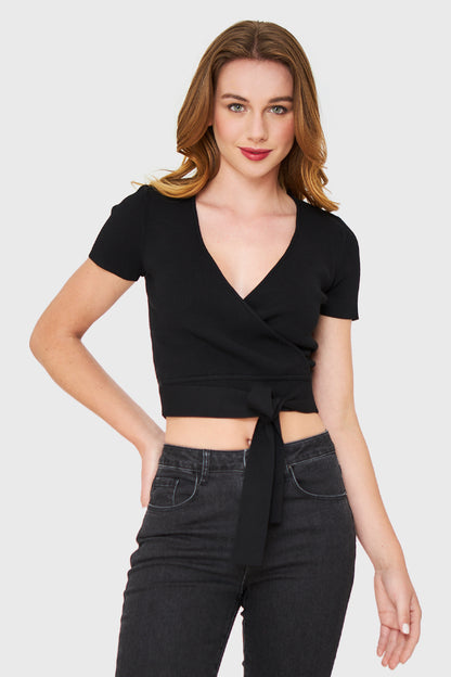 Características: Crop top manga corta. Escote en V cruzado. Lazo decorativo frontal. Tejido acanalado y elasticado.