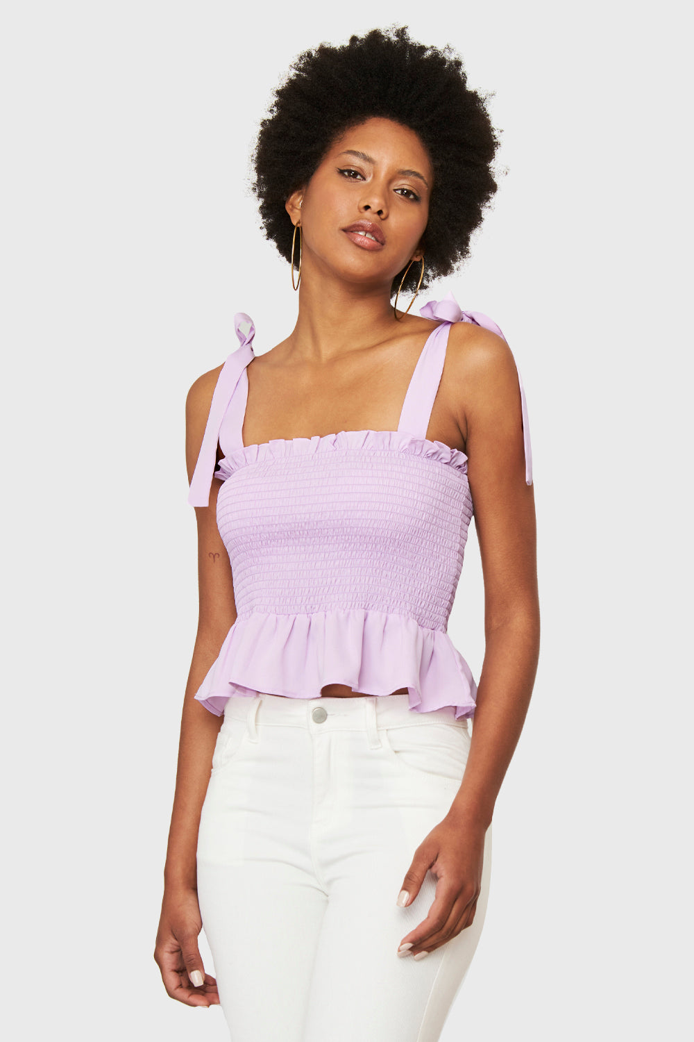 Características: Crop top fruncido con terminación de vuelos. Tirantes de lazo.