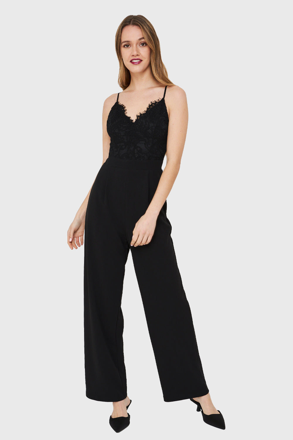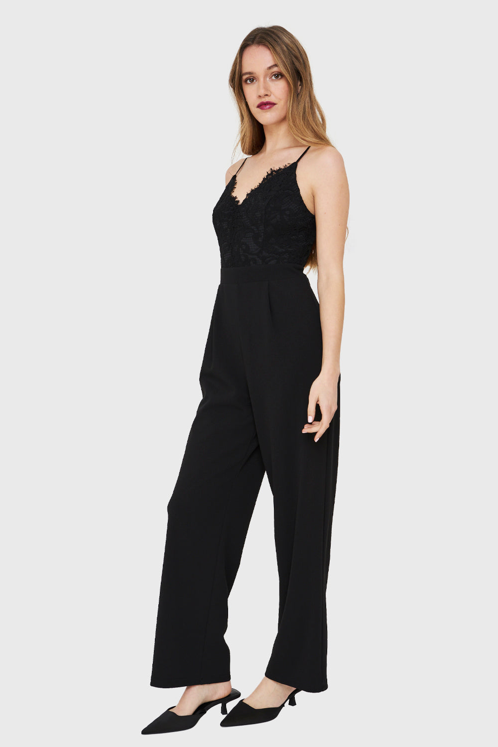 Características: Enterito largo con tirantes estilo pabilo ajustable. Pierna recta y ancha. Encaje en el canesú y detalle de blonda en busto. Posee forro.