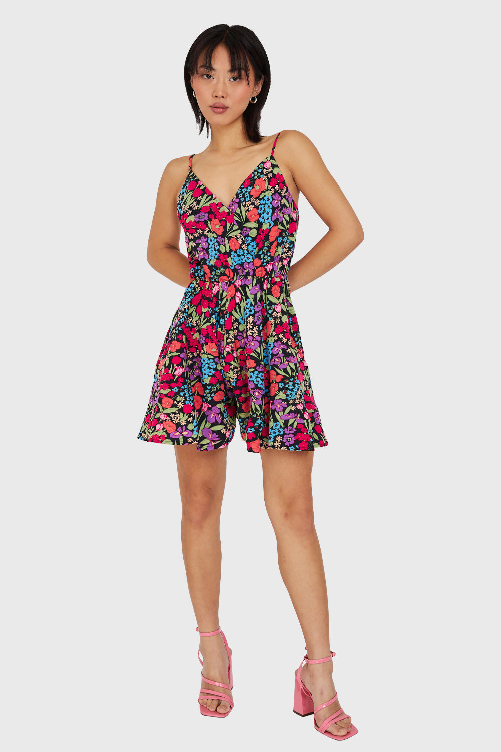 Características: Enterito corto floral. Pierna ancha, pretina en cintura y escote V cruzado con broche en busto. Tirantes ajustables. Espalda elasticada.