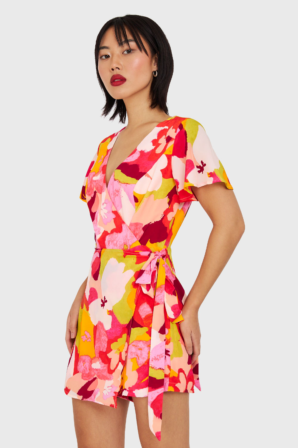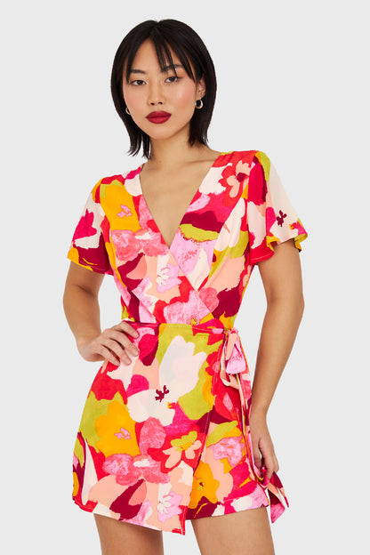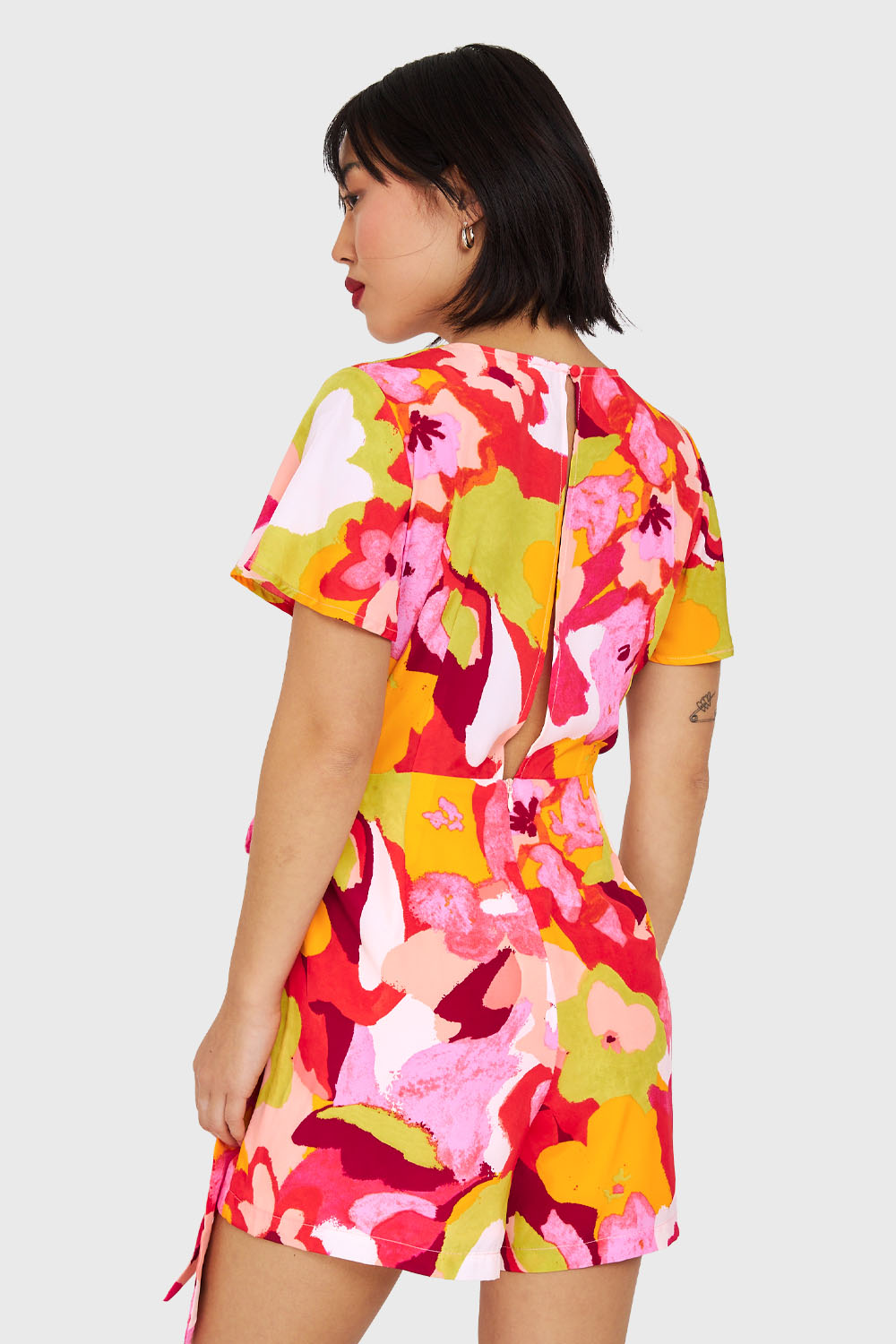 Características: Enterito corto forrado con estampado de flores con lazo de ajuste y escote V. Cierre en espalda, y boton de ajuste en el cuello.