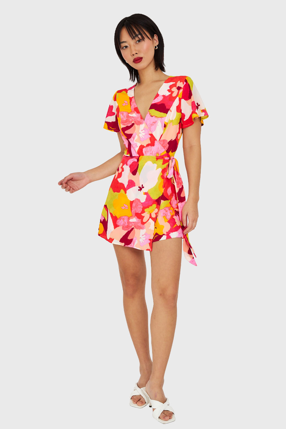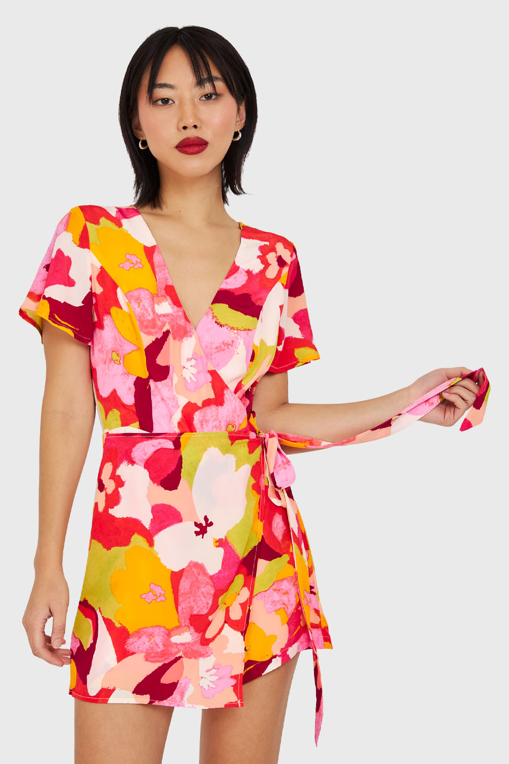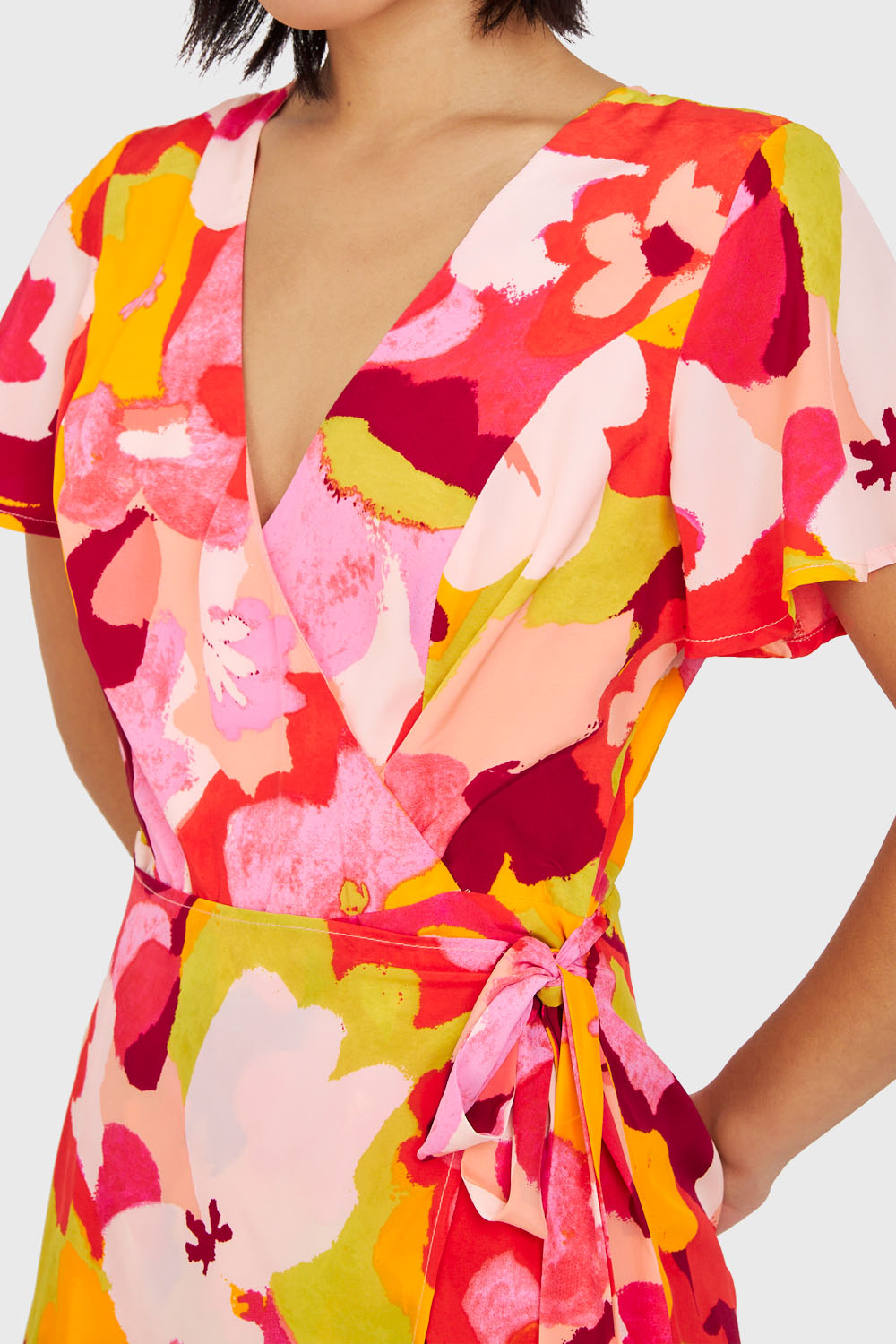 Características: Enterito corto forrado con estampado de flores con lazo de ajuste y escote V. Cierre en espalda, y boton de ajuste en el cuello.