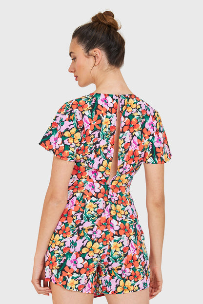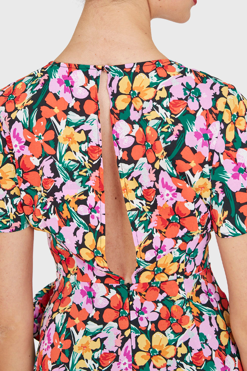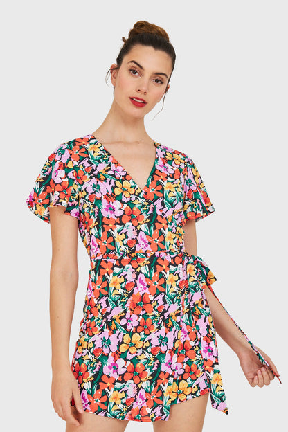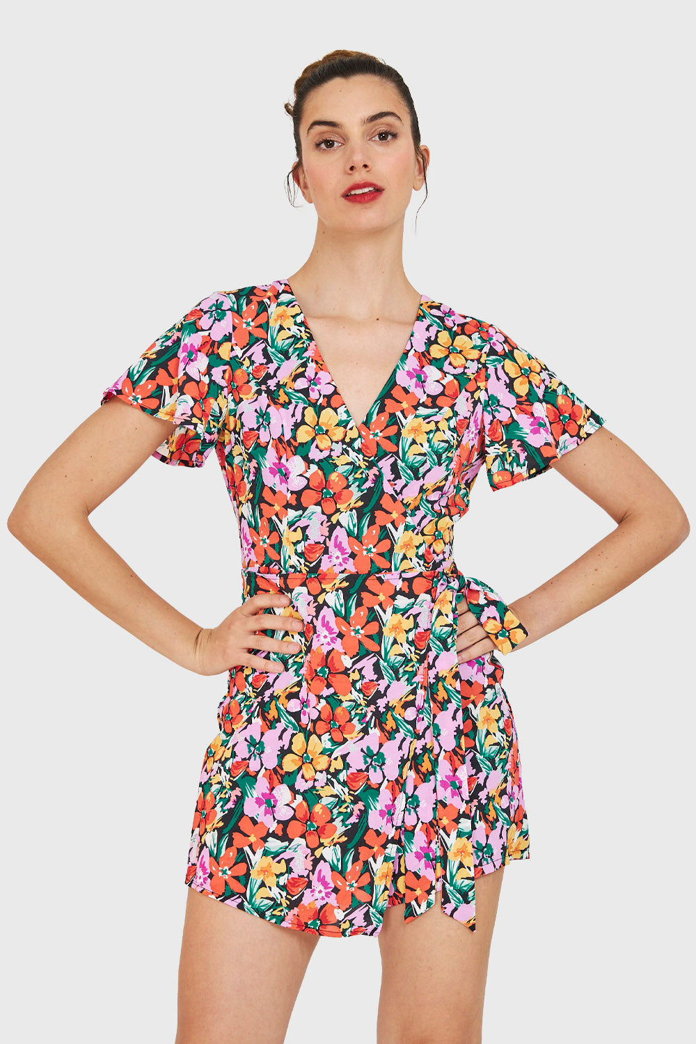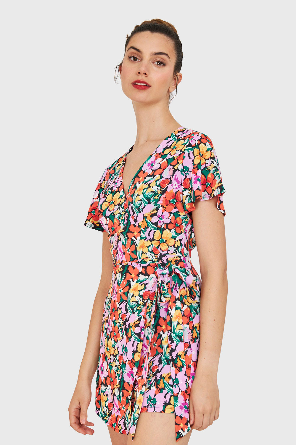 Características: nterito corto forrado con estampado de flores con lazo de ajuste y escote V. Cierre en espalda, y boton de ajuste en el cuello.