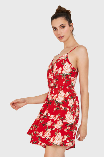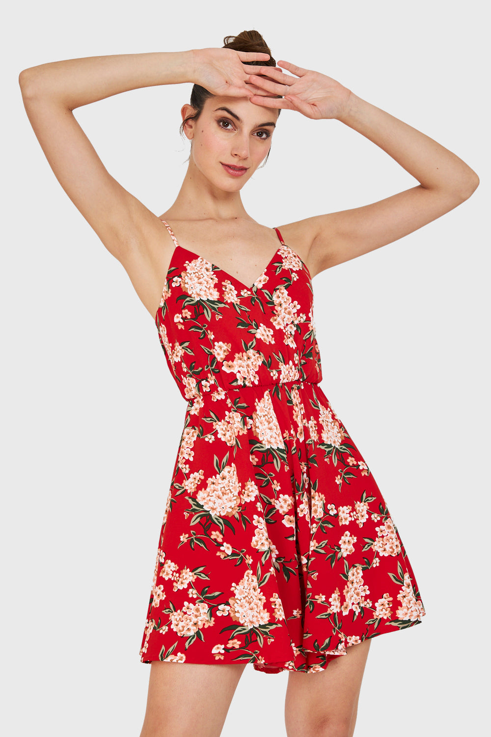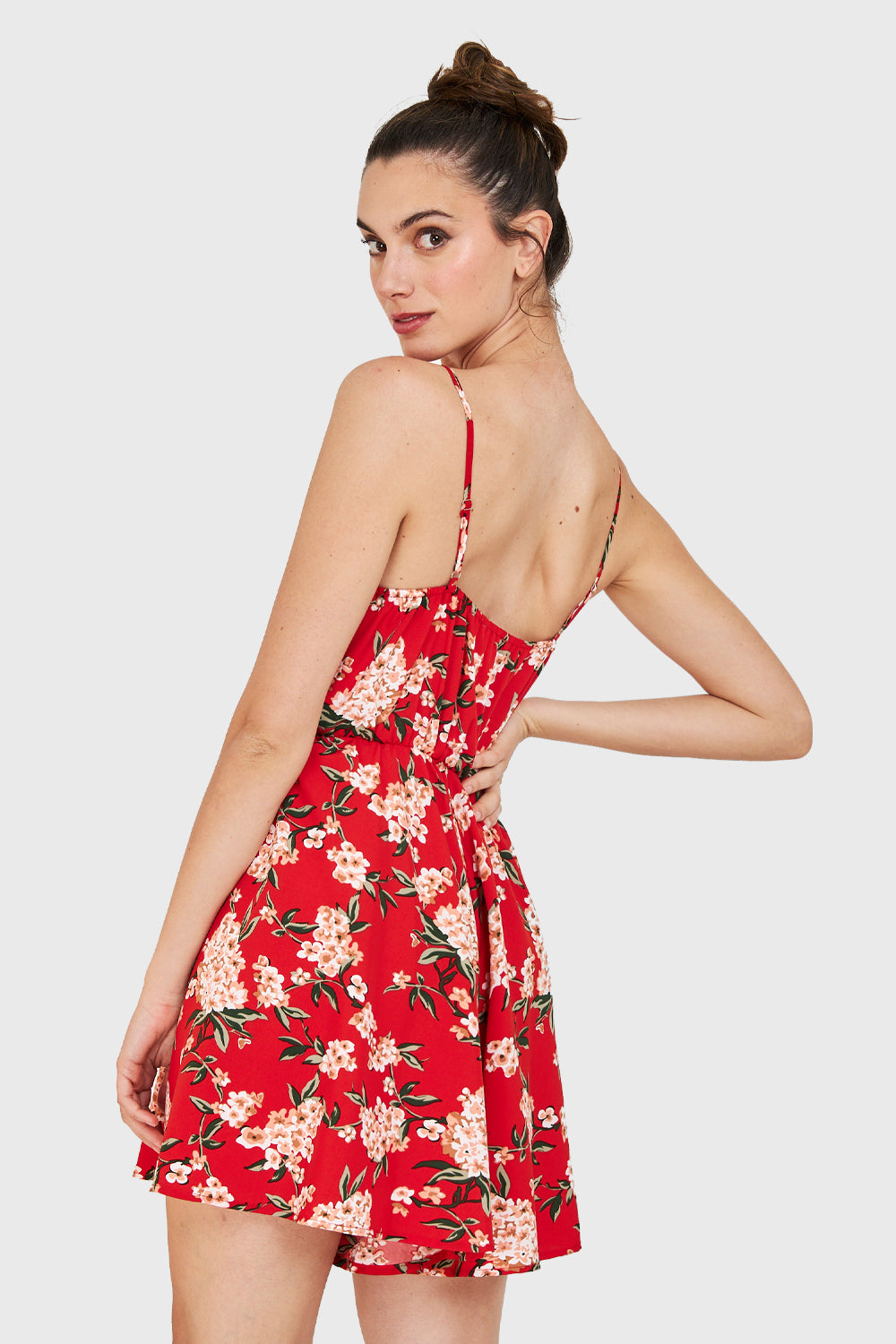 Características: Enterito corto floral. Pierna ancha, pretina en cintura y escote V cruzado con broche en busto. Tirantes ajustables. Espalda elasticada.