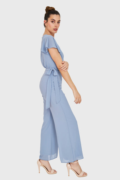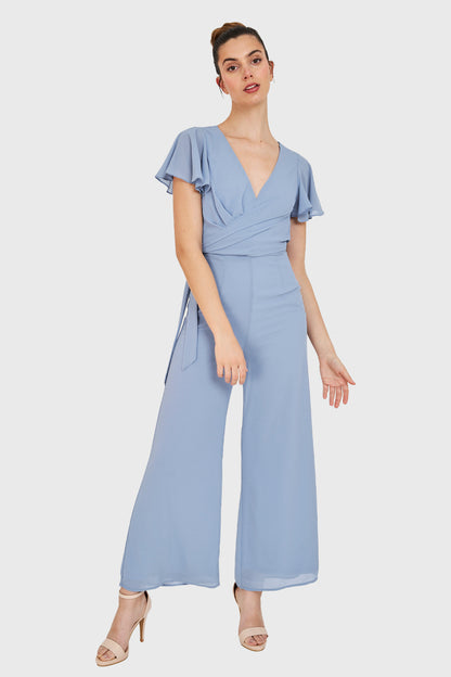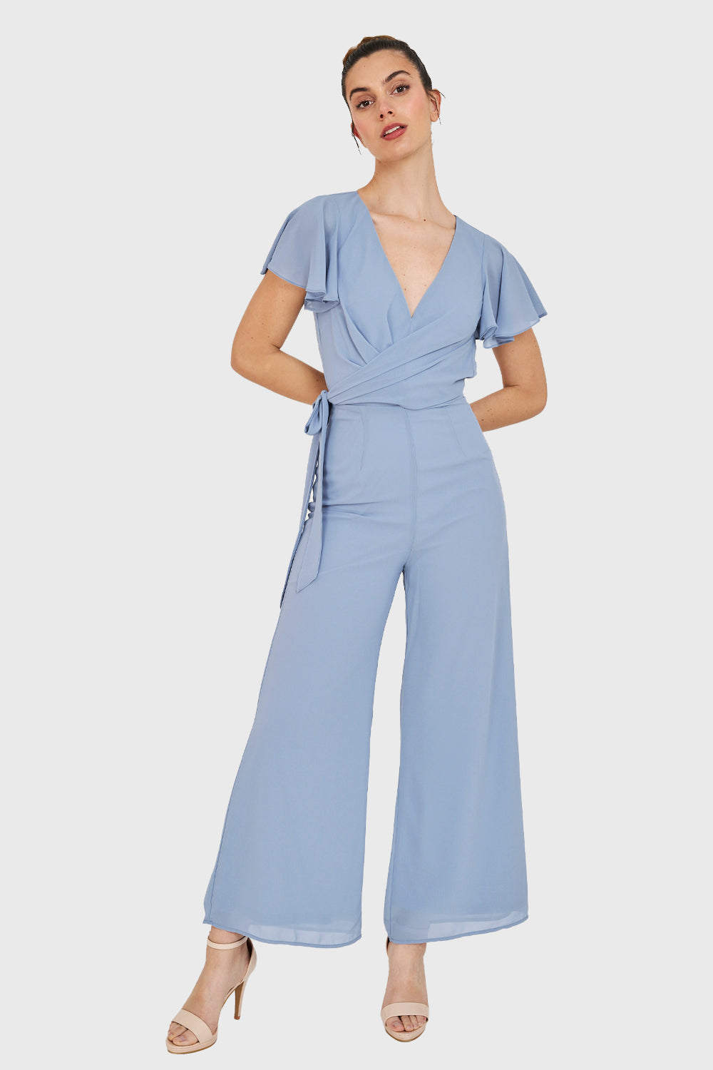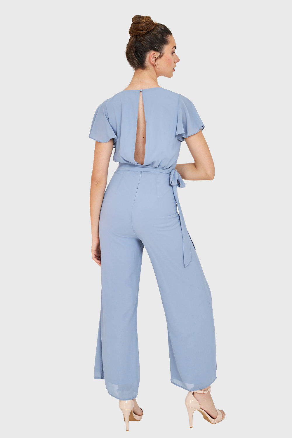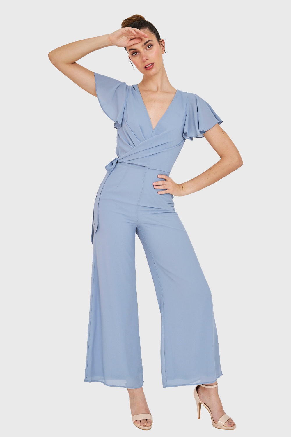 Características: Enterito escote V efecto cruzado con lazo para ajuste. Manga corta con vuelo. Abertura en espalda, cierre invisible en parte baja de espalda, y botón de ajuste en cuello. Forrado.