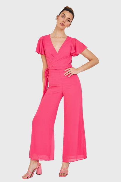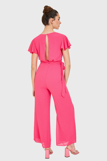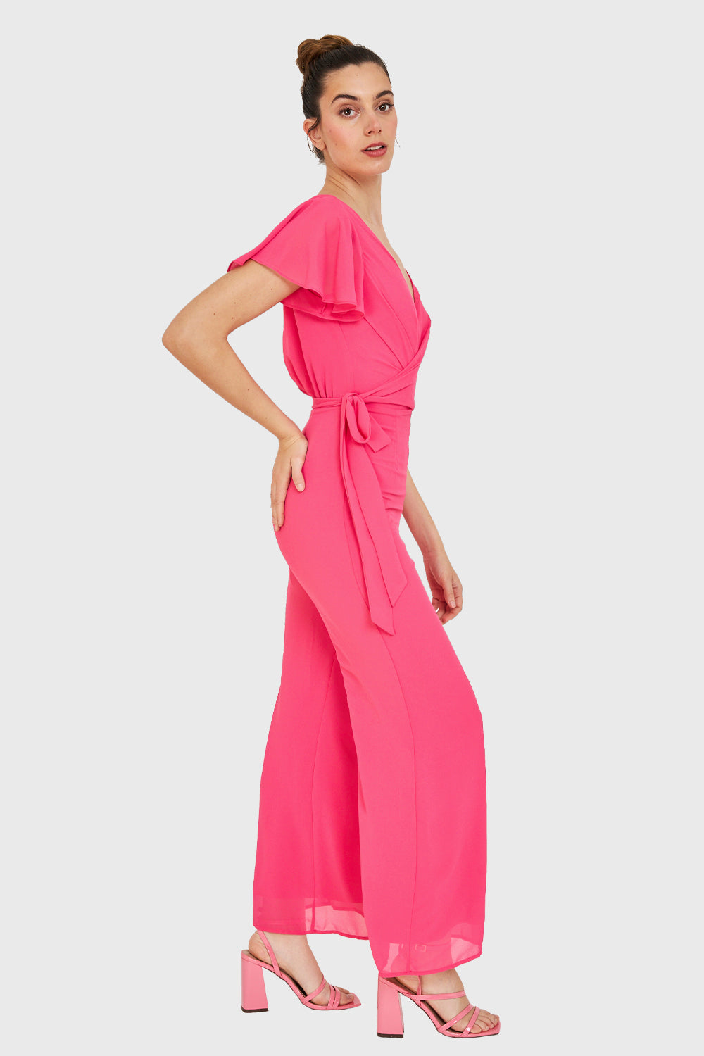 Características: Enterito escote V efecto cruzado con lazo para ajuste. Manga corta con vuelo. Abertura en espalda, cierre invisible en parte baja de espalda, y botón de ajuste en cuello. Forrado.